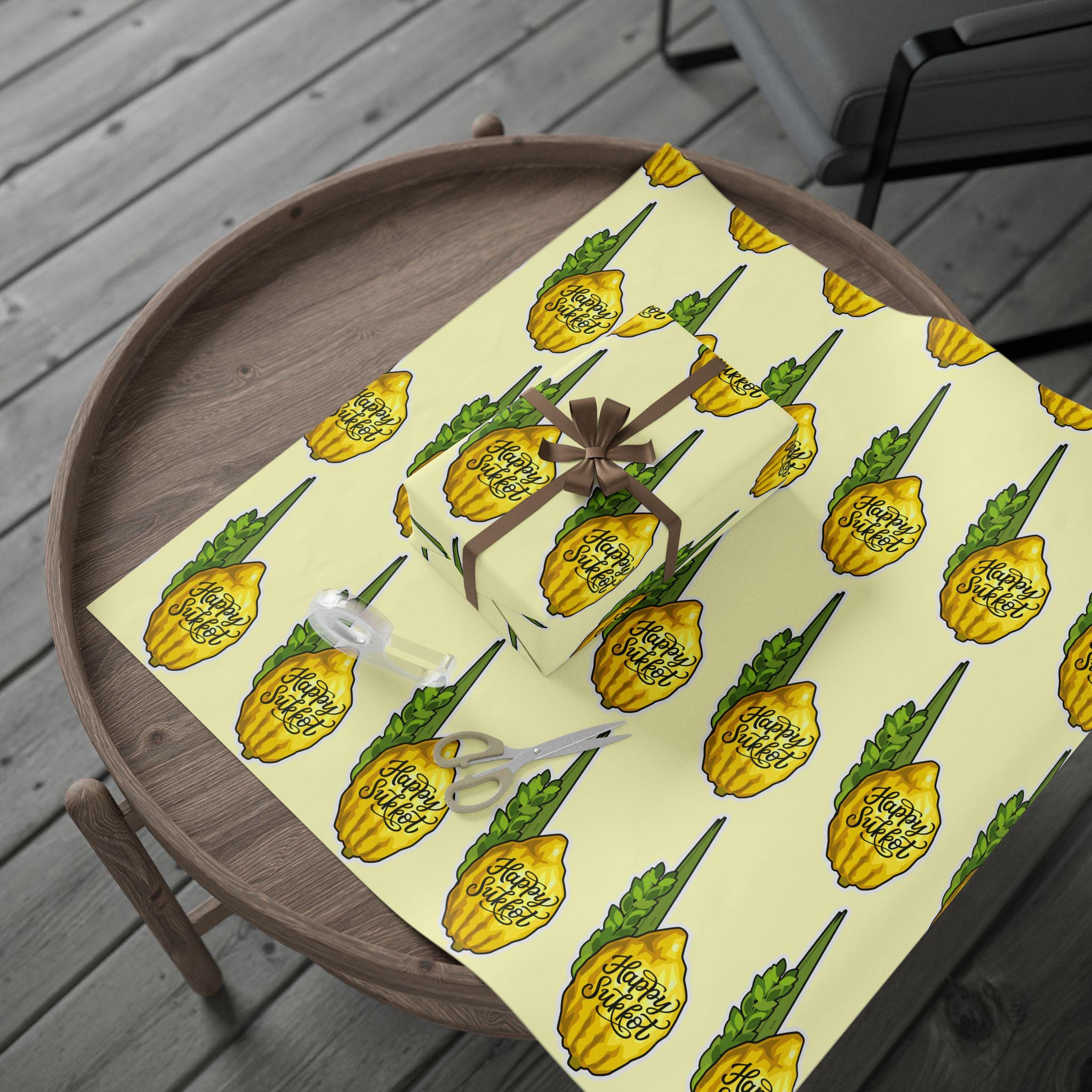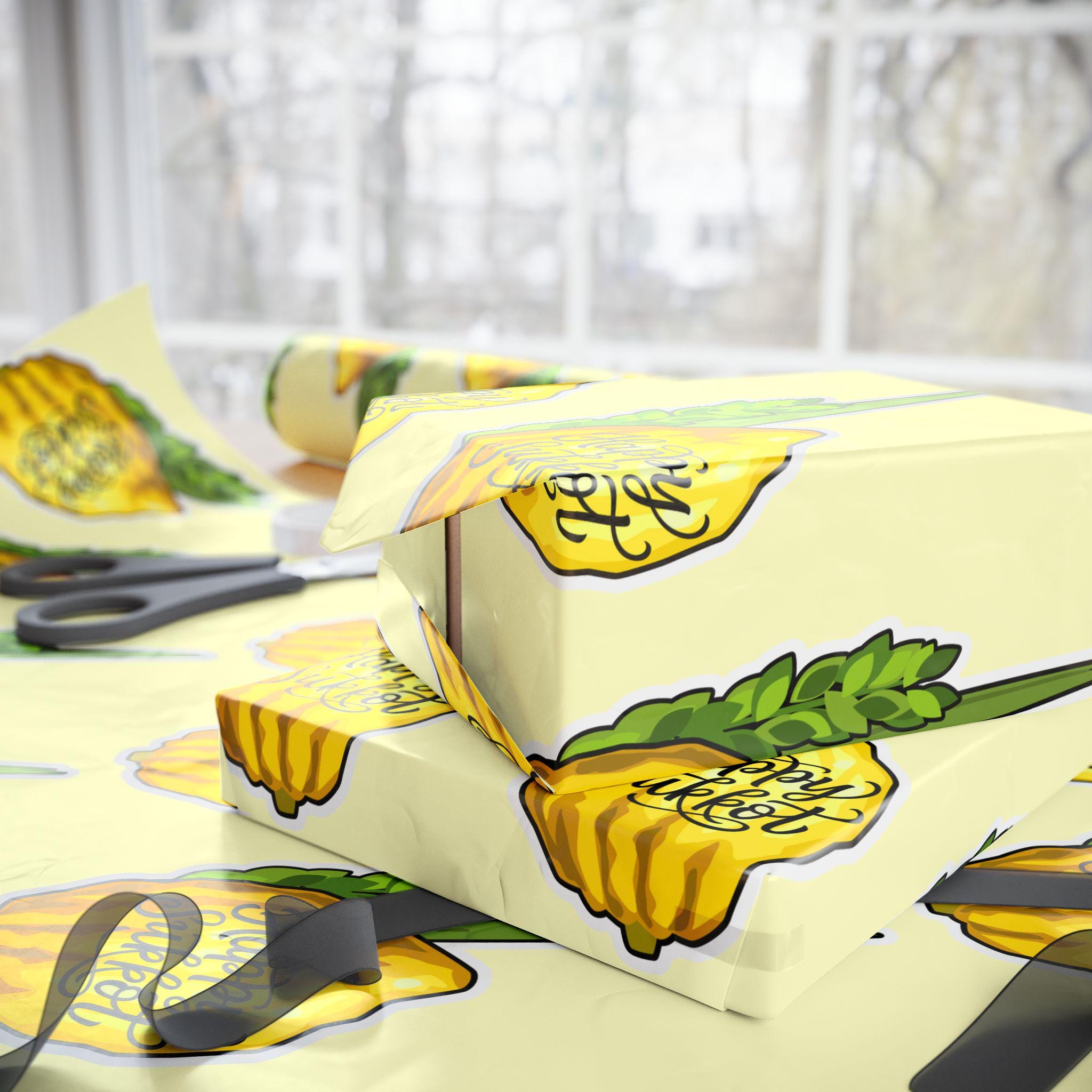 Celebrate Sukkot with beauty, meaning, and tradition. This Sukkot wrapping paper features elegant illustrations of the etrog and lulav, bringing the warmth and gratitude of the harvest season to every gift you give.