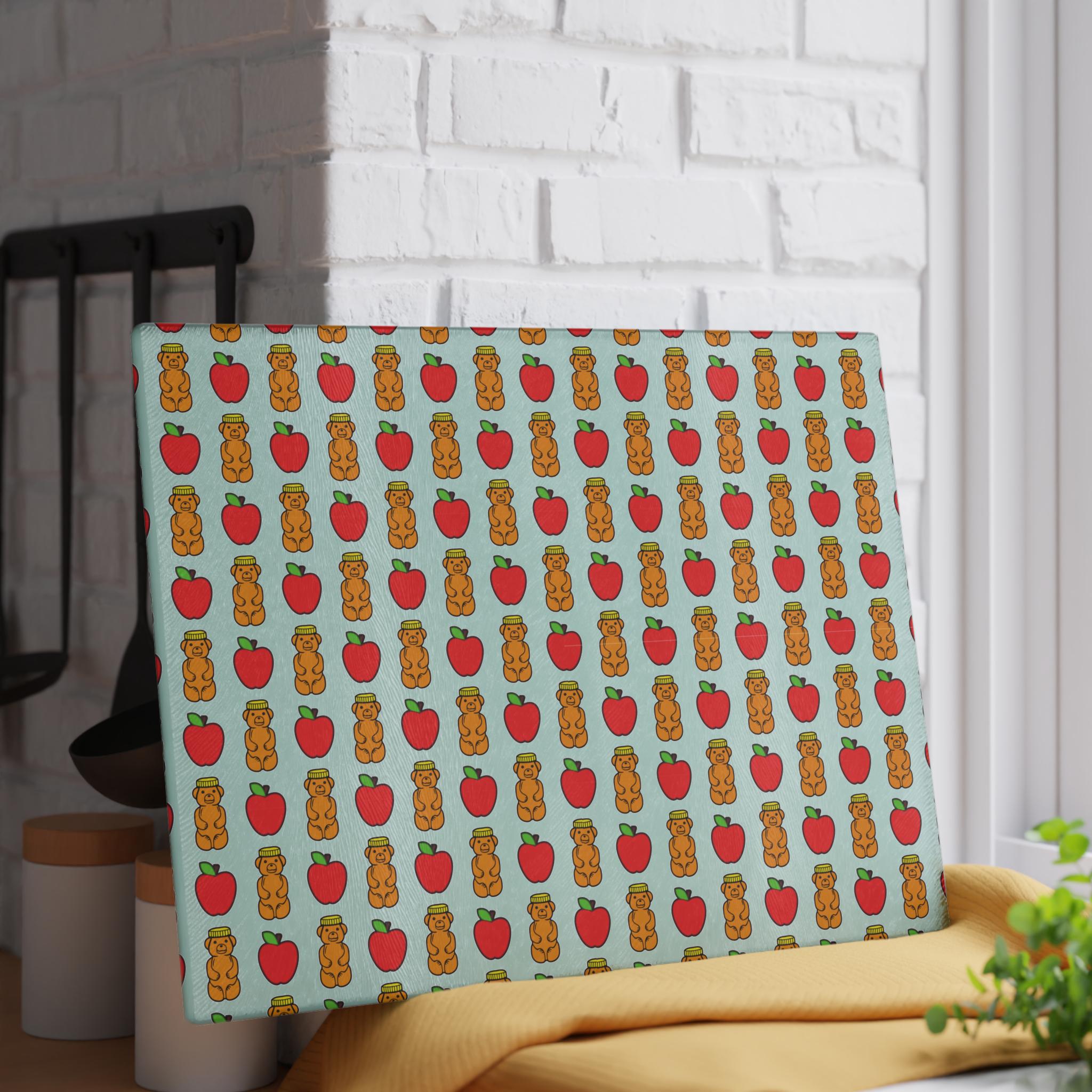 Designed to celebrate a sweet new year, the vibrant printed artwork captures crisp apples and cheerful honey bears in a festive tribute to Rosh Hashanah. Whether used for weekly Shabbat meals or displayed as a centerpiece during the High Holidays, this challah board adds a modern, meaningful touch to timeless Jewish traditions.