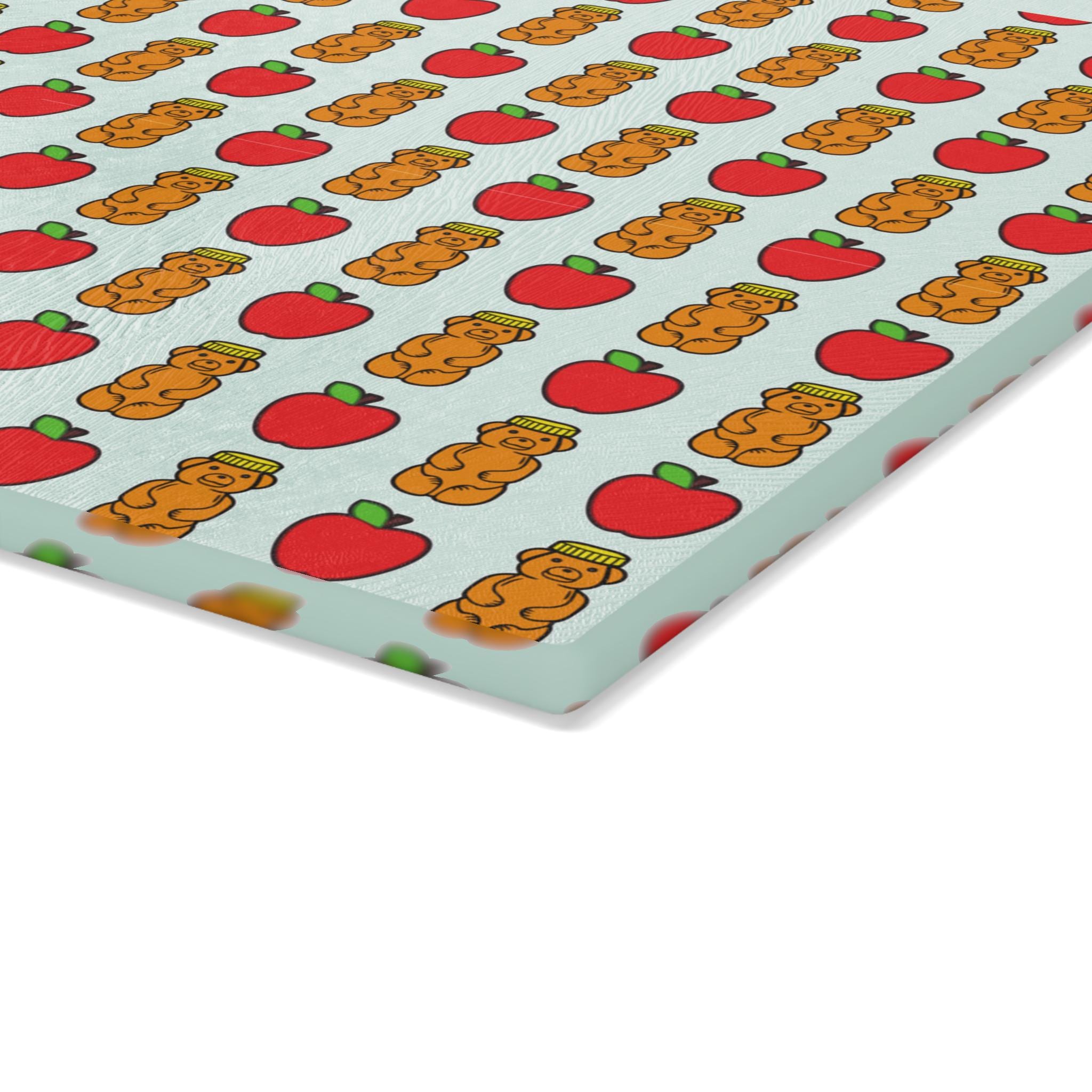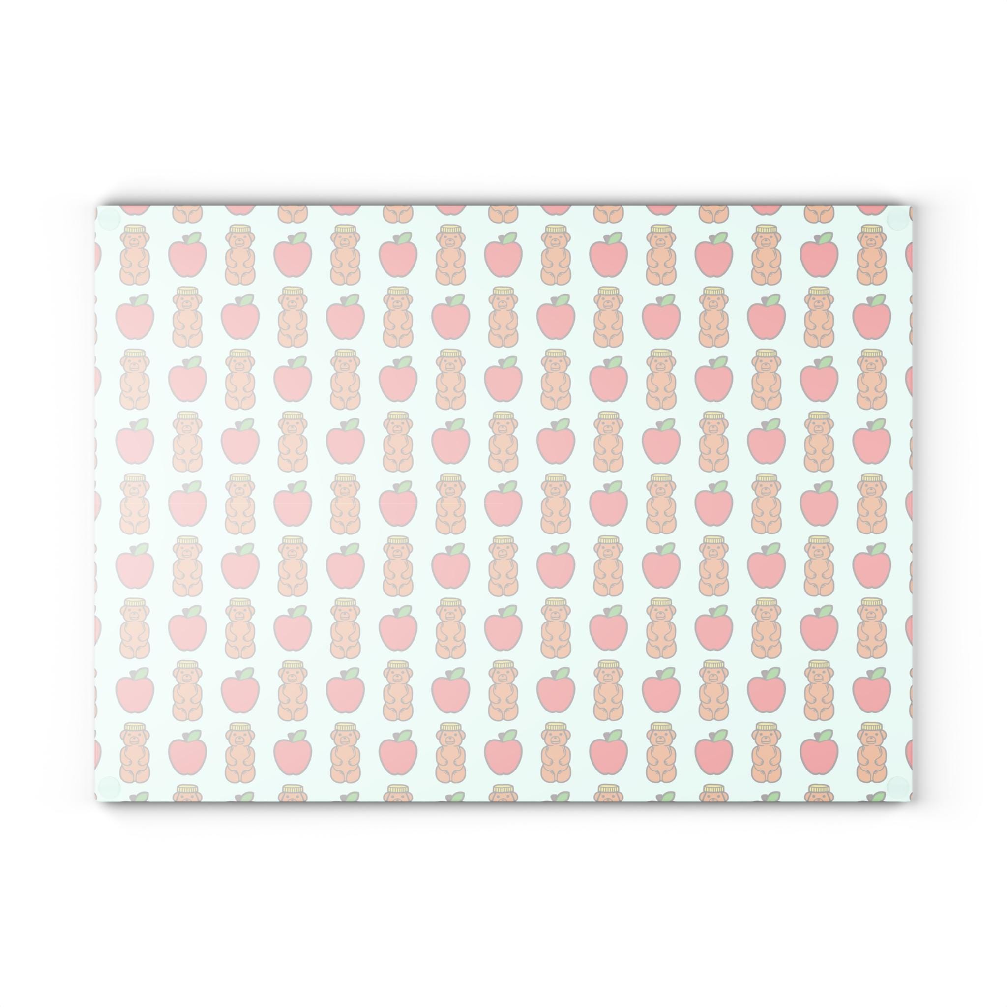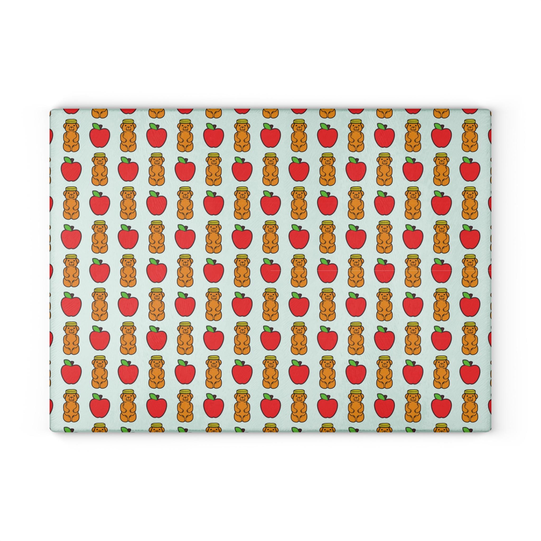 Rosh Hashanah Challah Board in tempered glass featuring a sweet apples and honey design with adorable honey bear jars. This Jewish glass challah plate brings warmth, tradition, and joyful color to your Shabbat and High Holiday table.