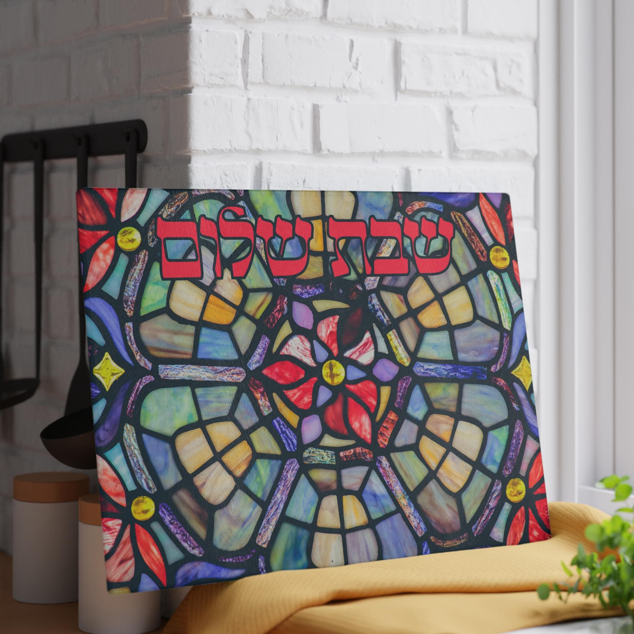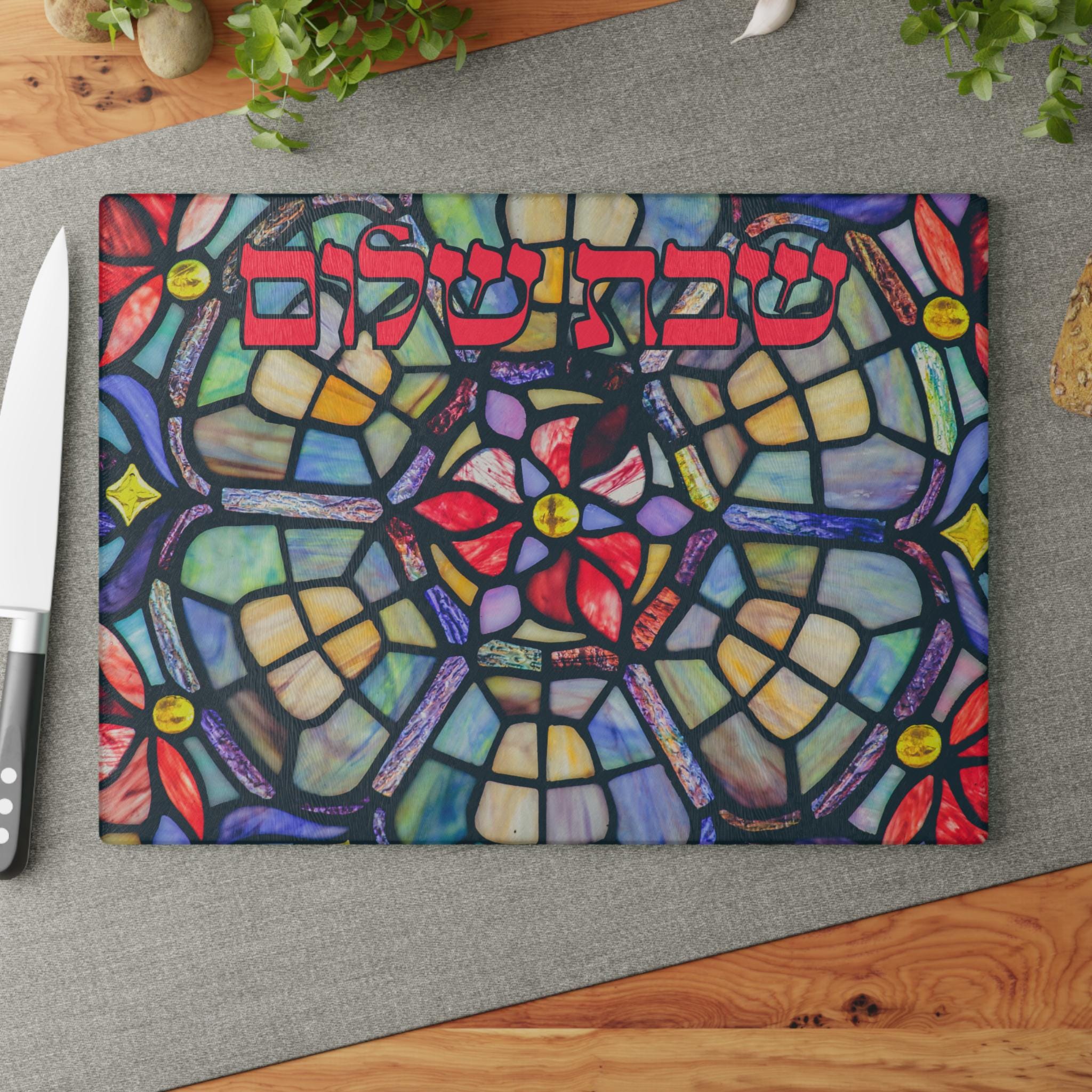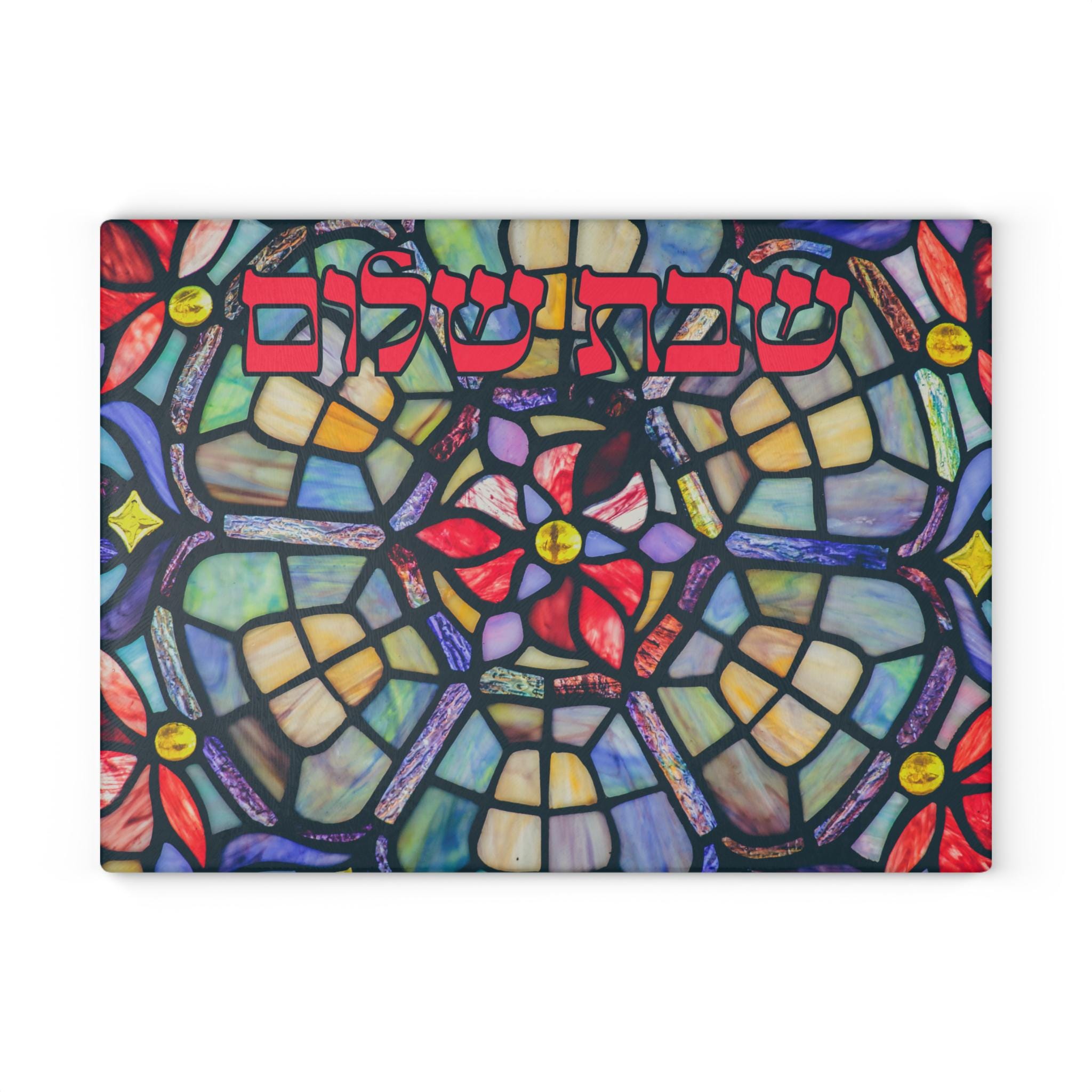Featuring bold, timeless “Shabbat Shalom” lettering surrounded by radiant stained glass artwork, this board is more than functional — it’s a meaningful statement piece for your Jewish home. Whether used for weekly Shabbat dinners, holiday meals, or special simchas, it adds warmth and artistry to every gathering.