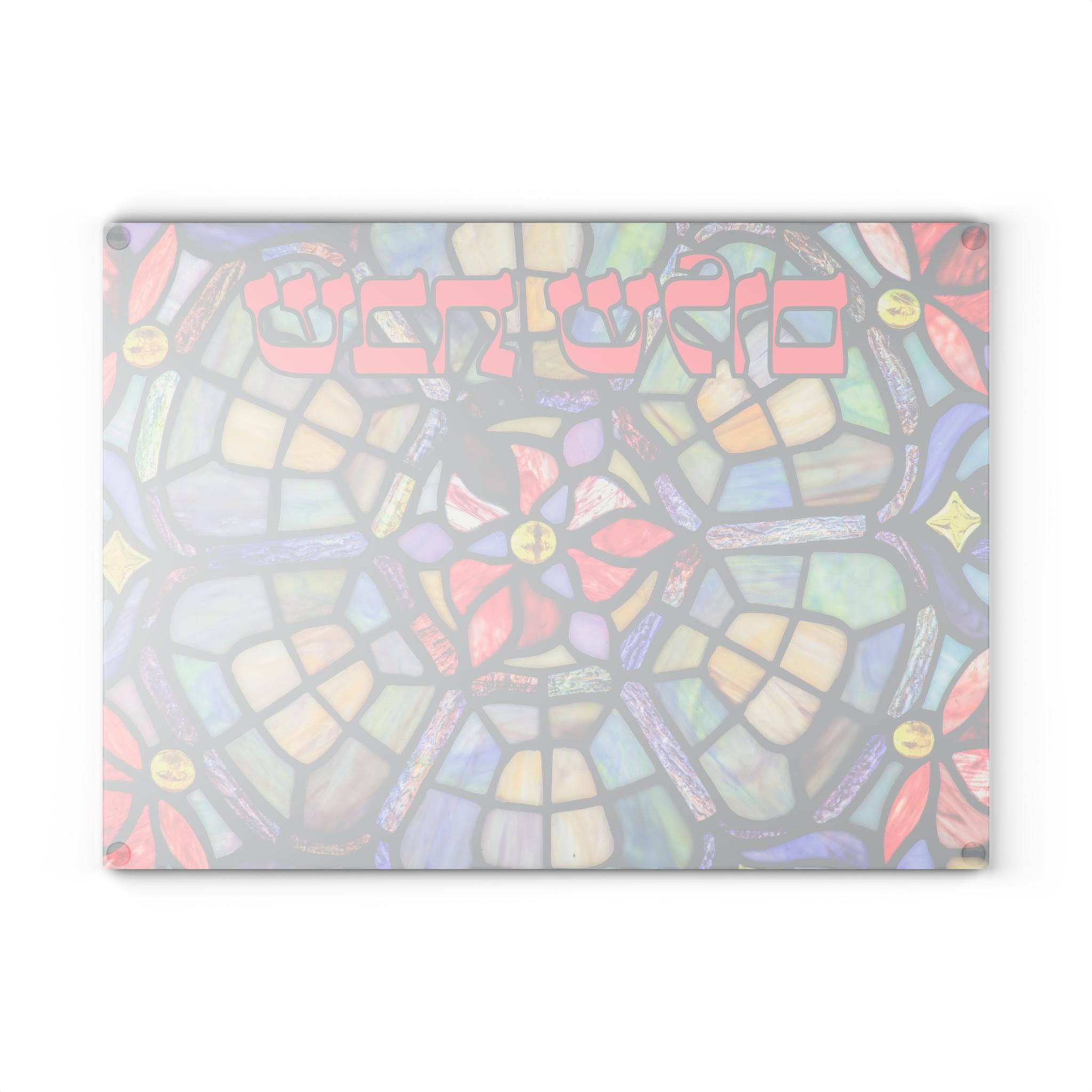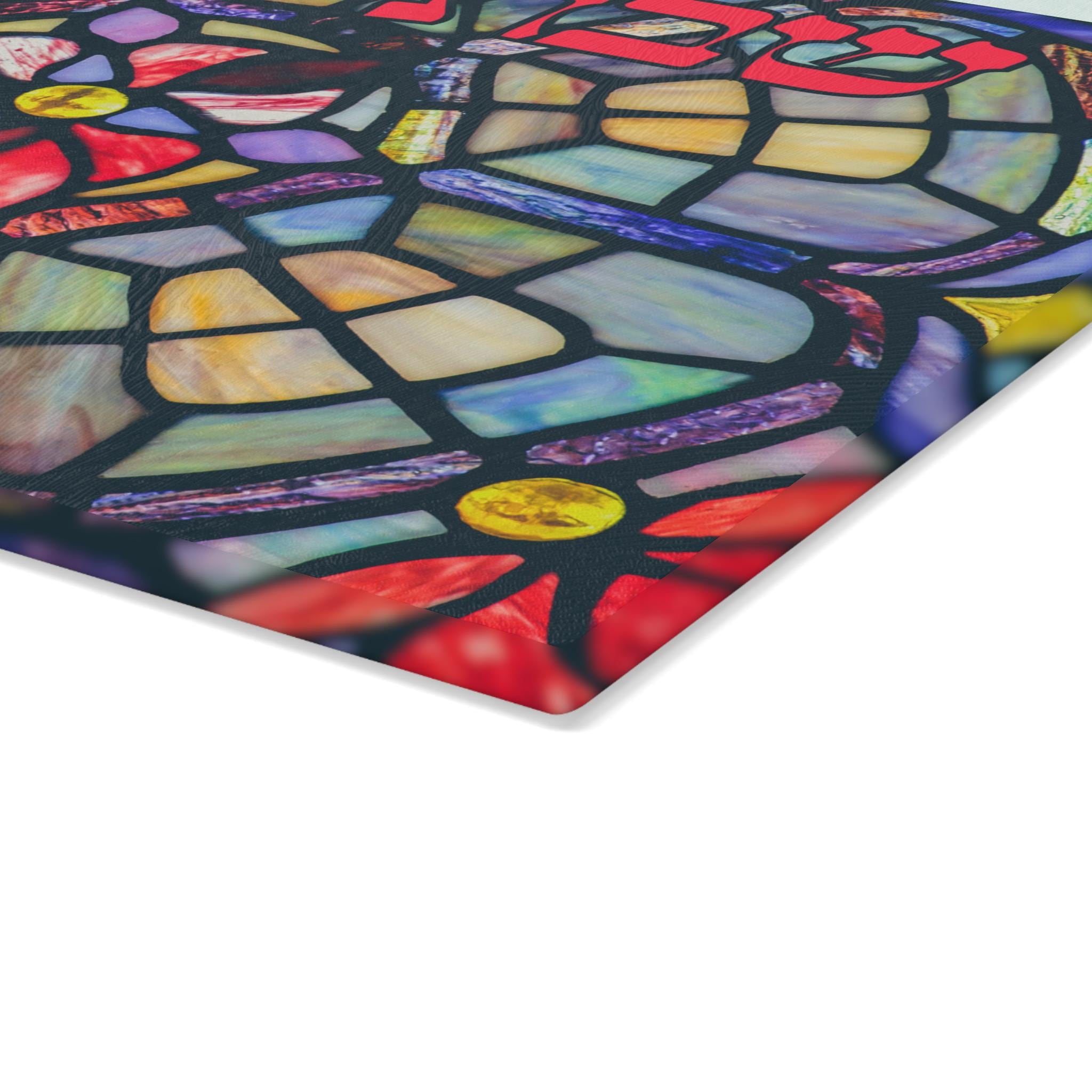 Shabbat Shalom Challah Board crafted in tempered glass with a vibrant stained glass–inspired design. This elegant Judaica challah plate brings beauty, spirituality, and tradition to your Shabbat table.