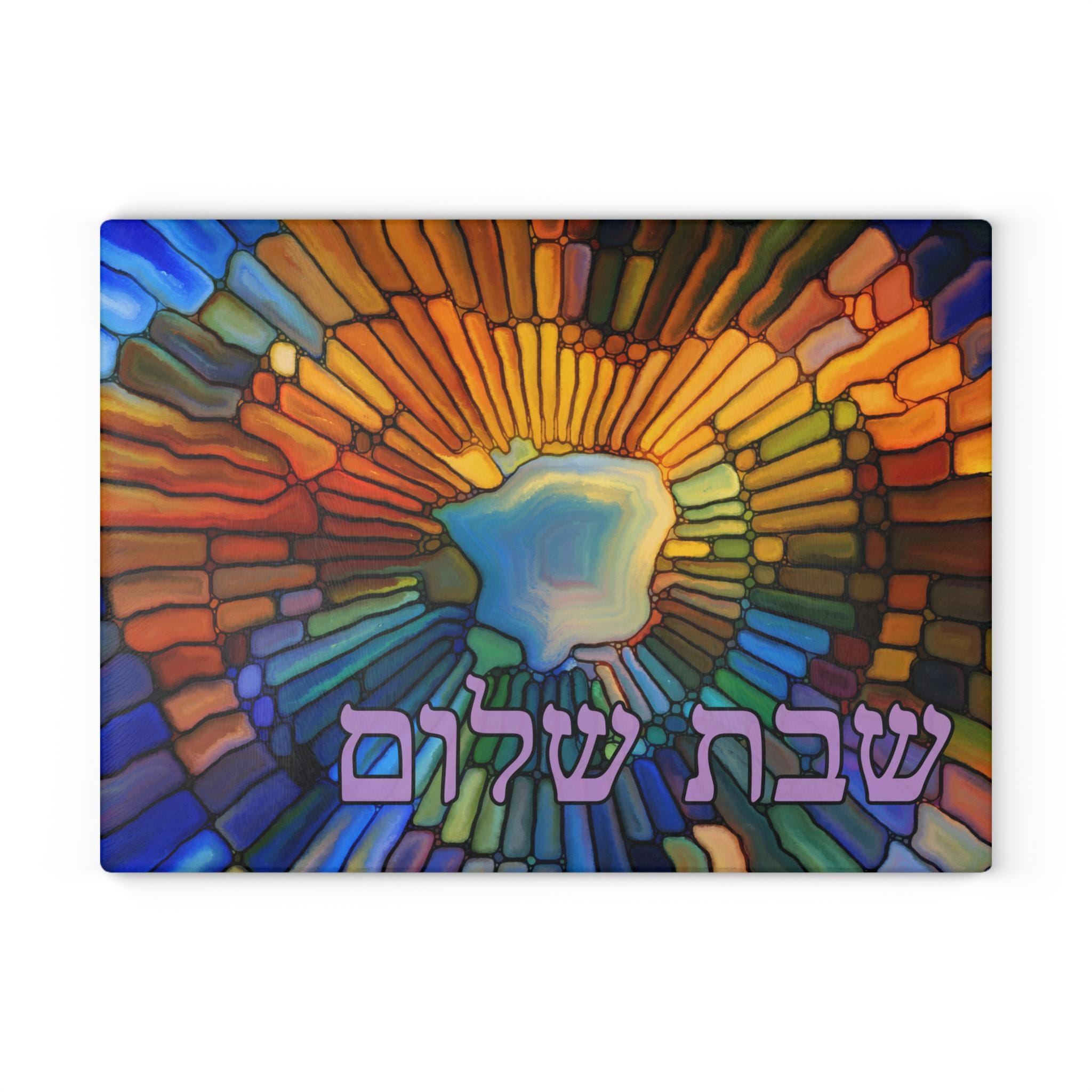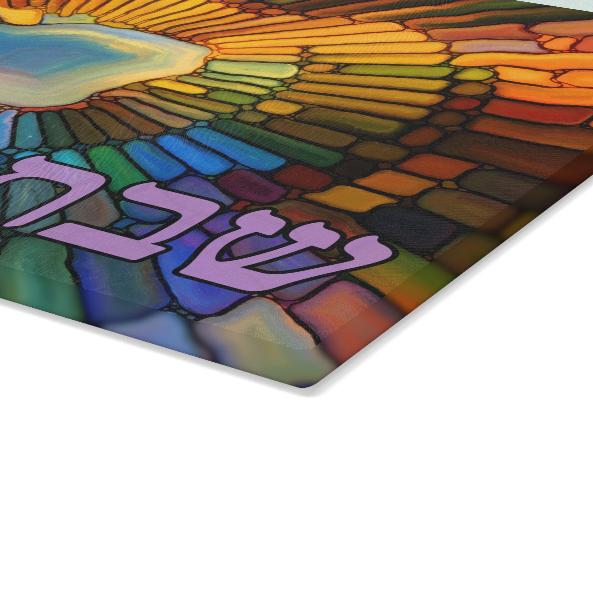 Bring elegance and spirituality to your Shabbat table with this exquisite glass challah board, featuring a vibrant stained-glass-inspired design and the words “Shabbat Shalom” in bold, timeless lettering. This tempered glass board is more than just functional — it’s a stunning Judaica statement piece that honors tradition while enhancing your home’s decor.