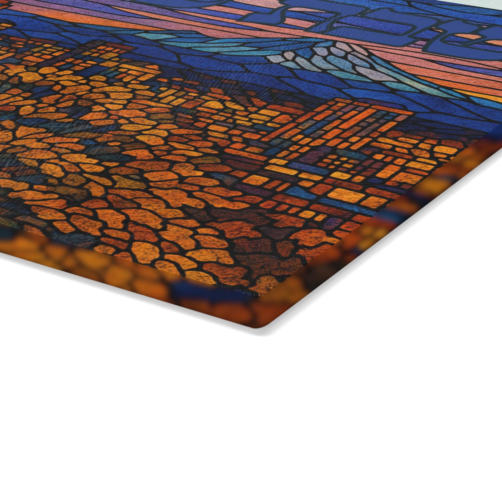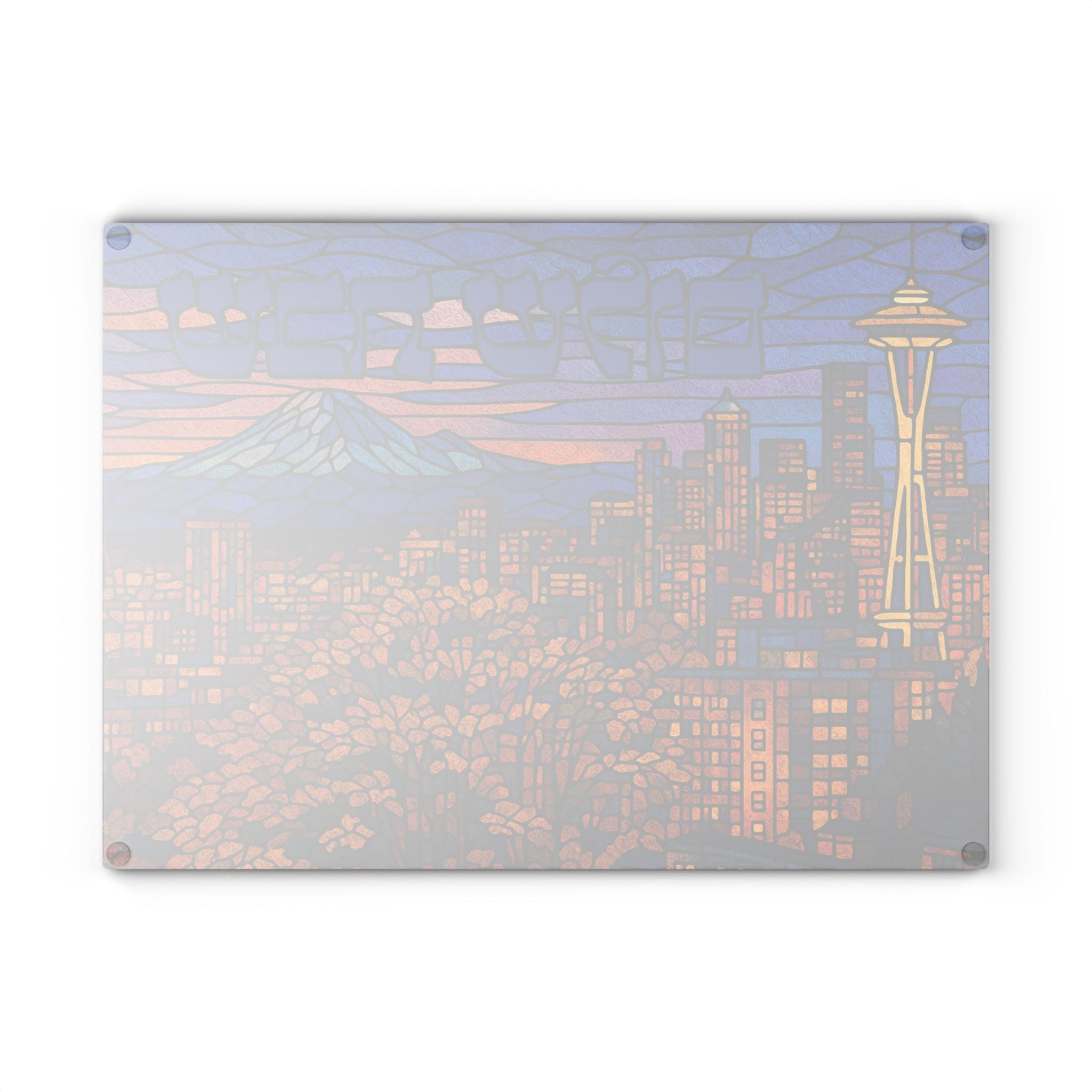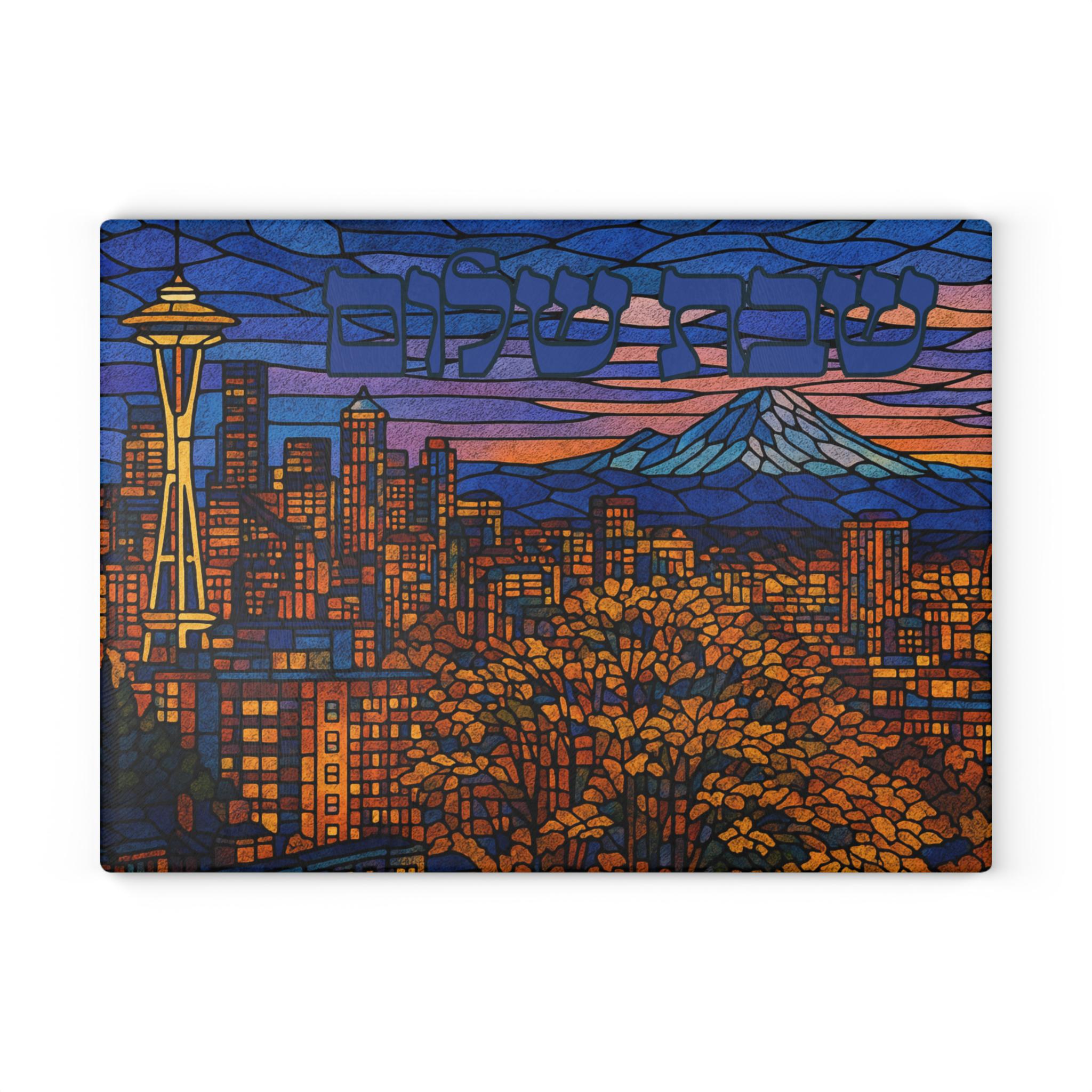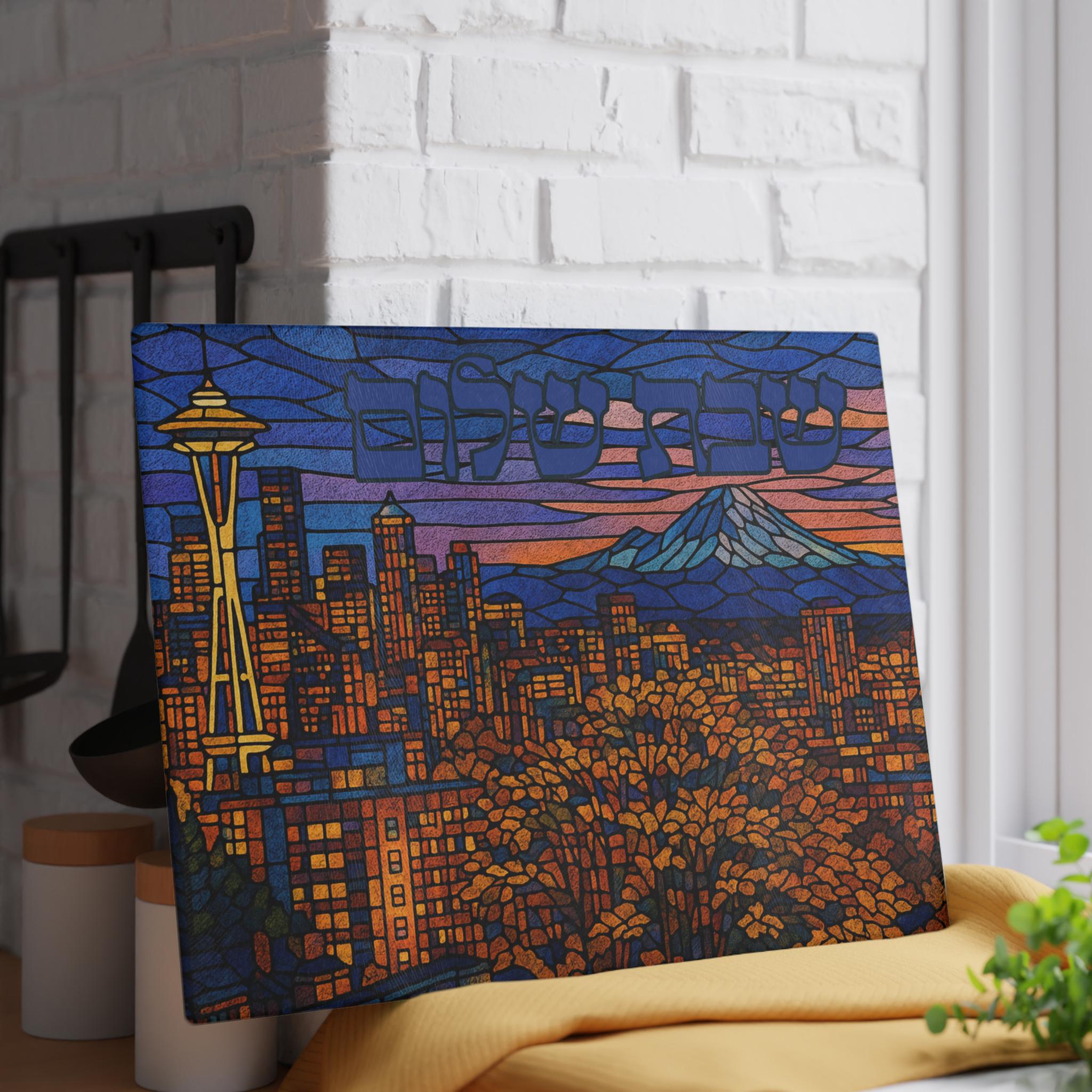 Celebrate Shabbat with Pacific Northwest pride through this Seattle Skyline challah board featuring the iconic Space Needle and city skyline in a vibrant stained glass–inspired design. It is a meaningful fusion of Jewish tradition and modern urban style, perfect for elevating your Shabbat table.