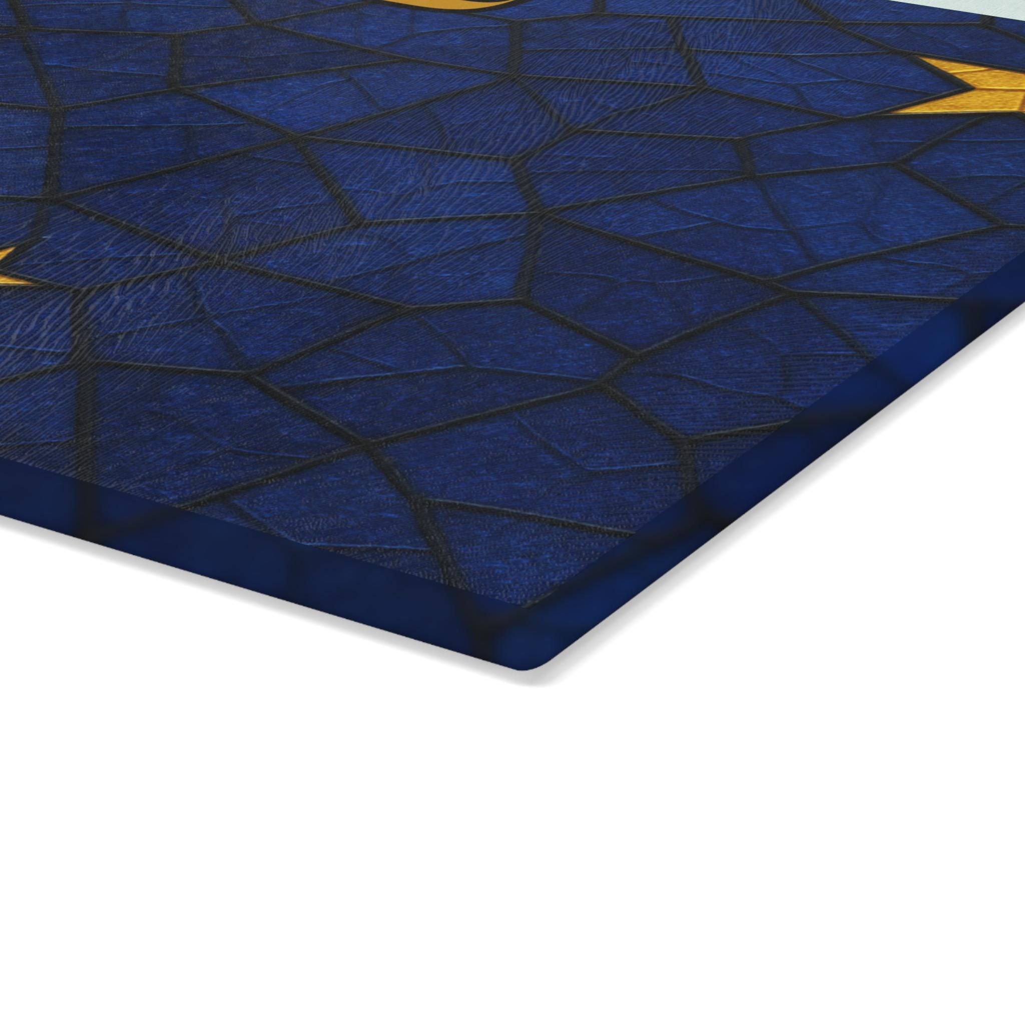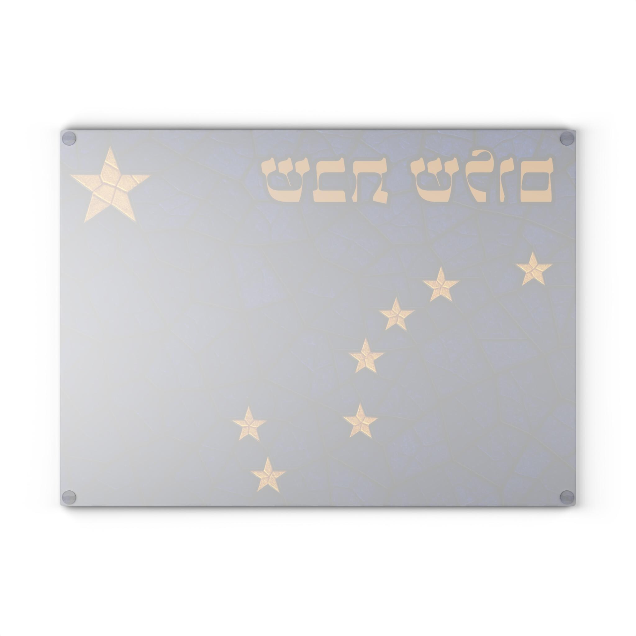 Alaska Challah Board crafted in stained glass style, featuring the iconic Alaska state flag with its golden Big Dipper and North Star set against deep navy tones. Displaying “Shabbat Shalom” in elegant Hebrew script, this tempered glass challah plate honors both Jewish tradition and Alaskan pride.