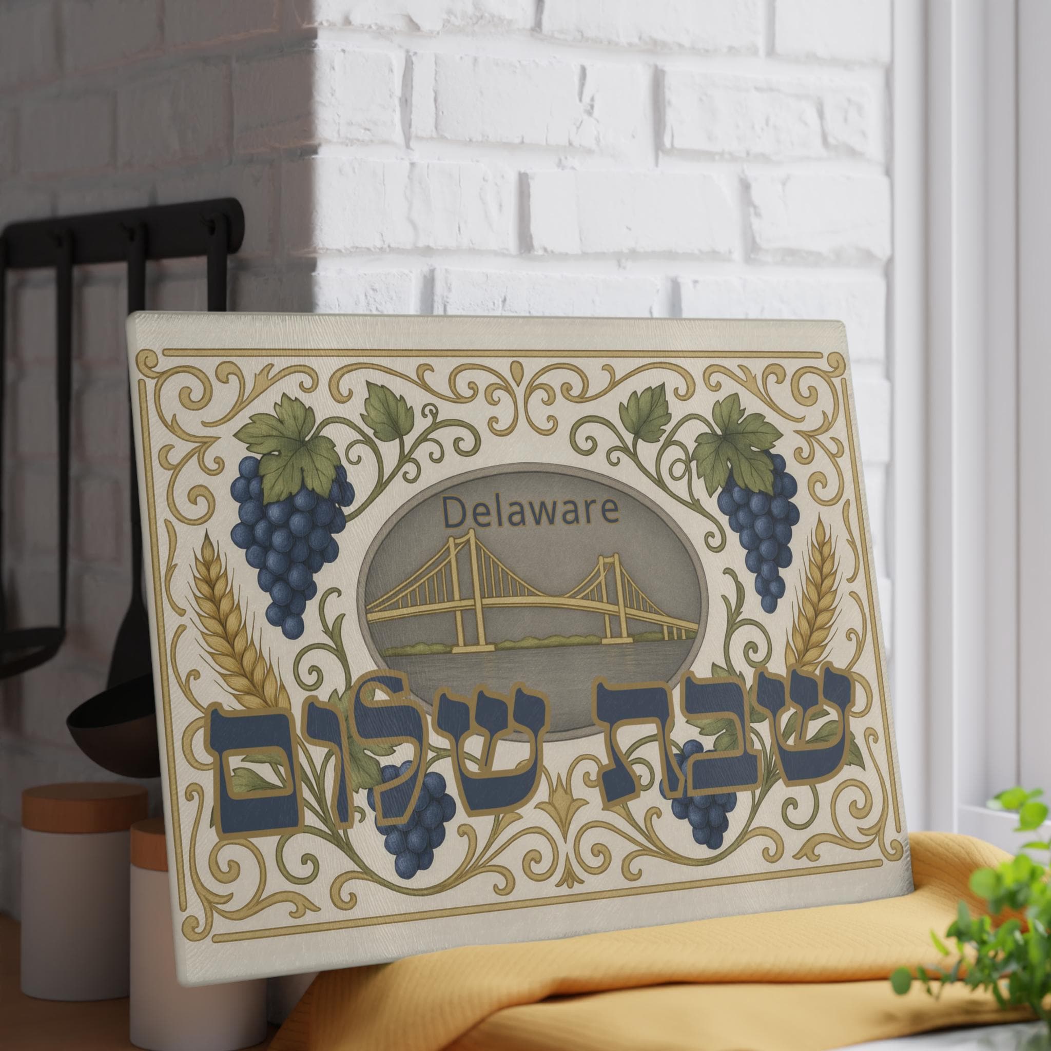 Printed on durable tempered glass, this challah board merges function with sentiment, creating the perfect centerpiece for your Shabbat table. Its refined design appeals to those who love traditional Judaica with a modern, regional twist. Whether you’re celebrating Shabbat weekly or gifting to a loved one, this piece blends Jewish heritage with Delaware pride.