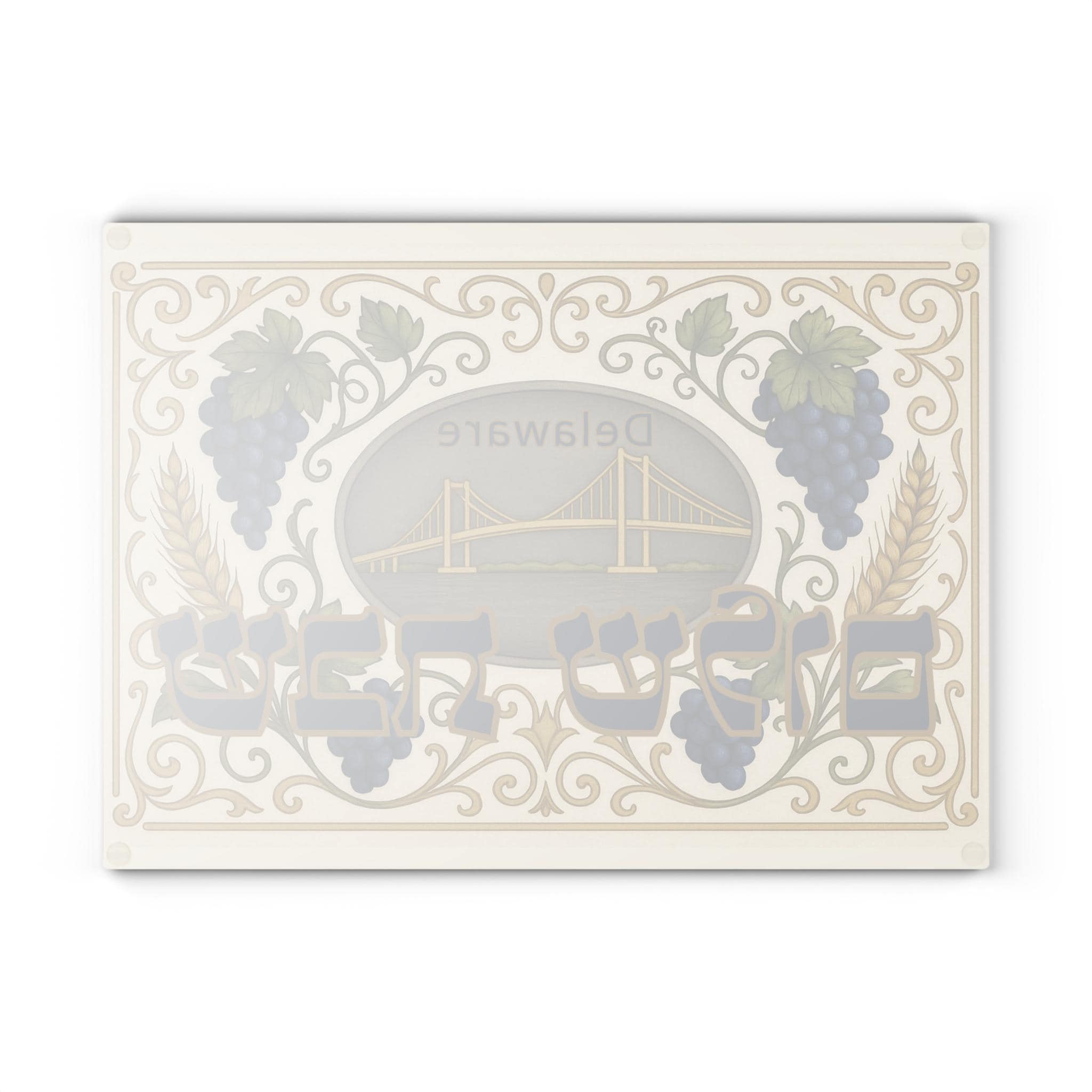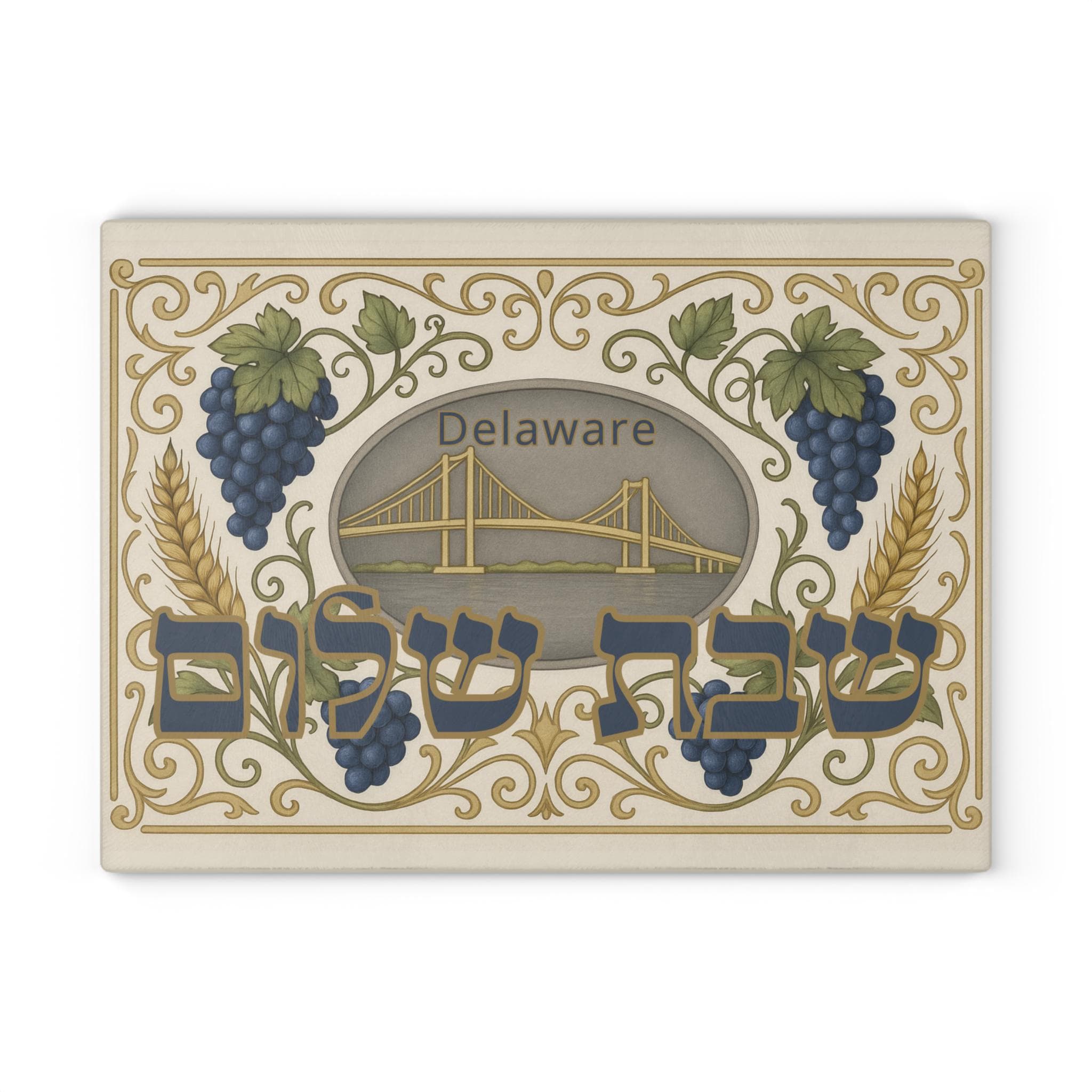 Honor Shabbat with timeless elegance and a touch of Delaware charm. This beautifully designed challah plate features a classic motif of grapes and wheat—symbols of abundance and tradition—framing the iconic golden bridge, representing Delaware’s proud identity and connection to the East Coast.