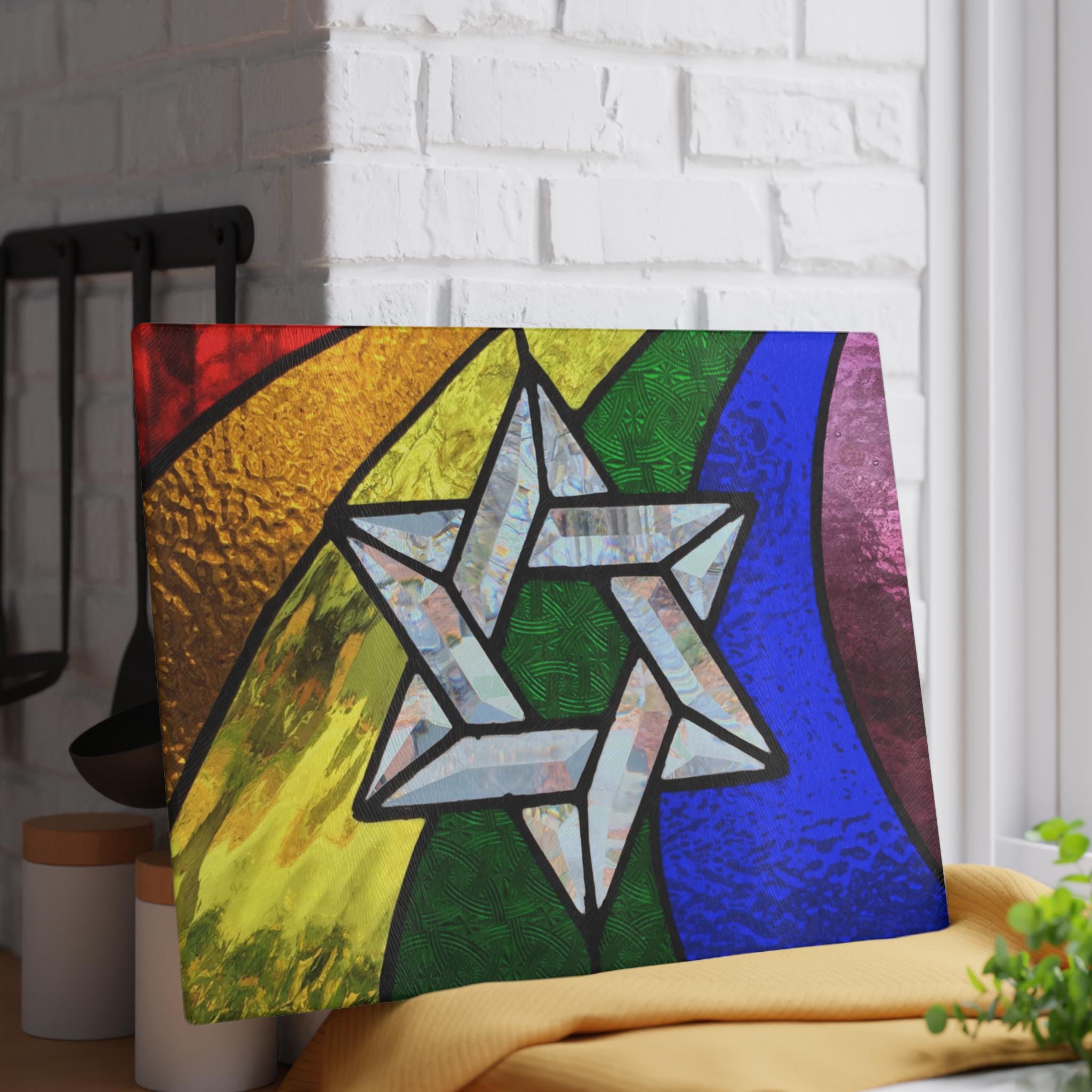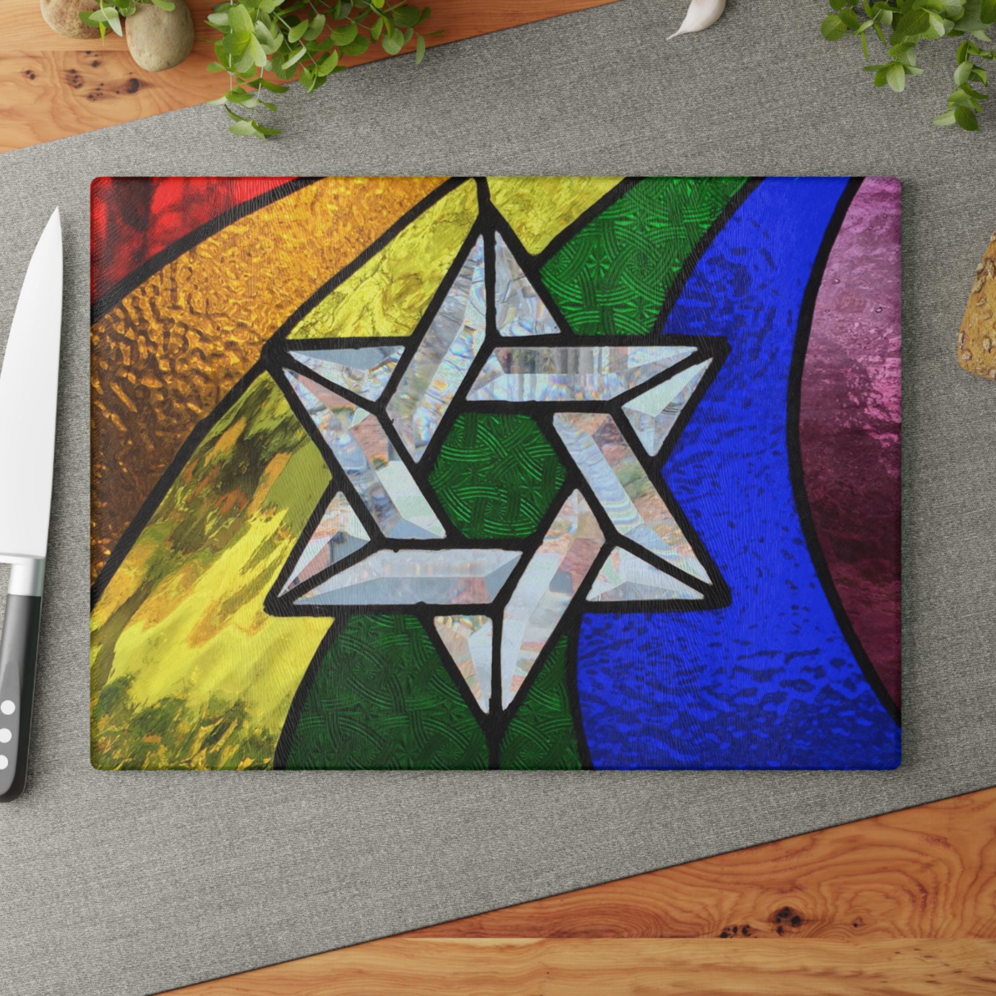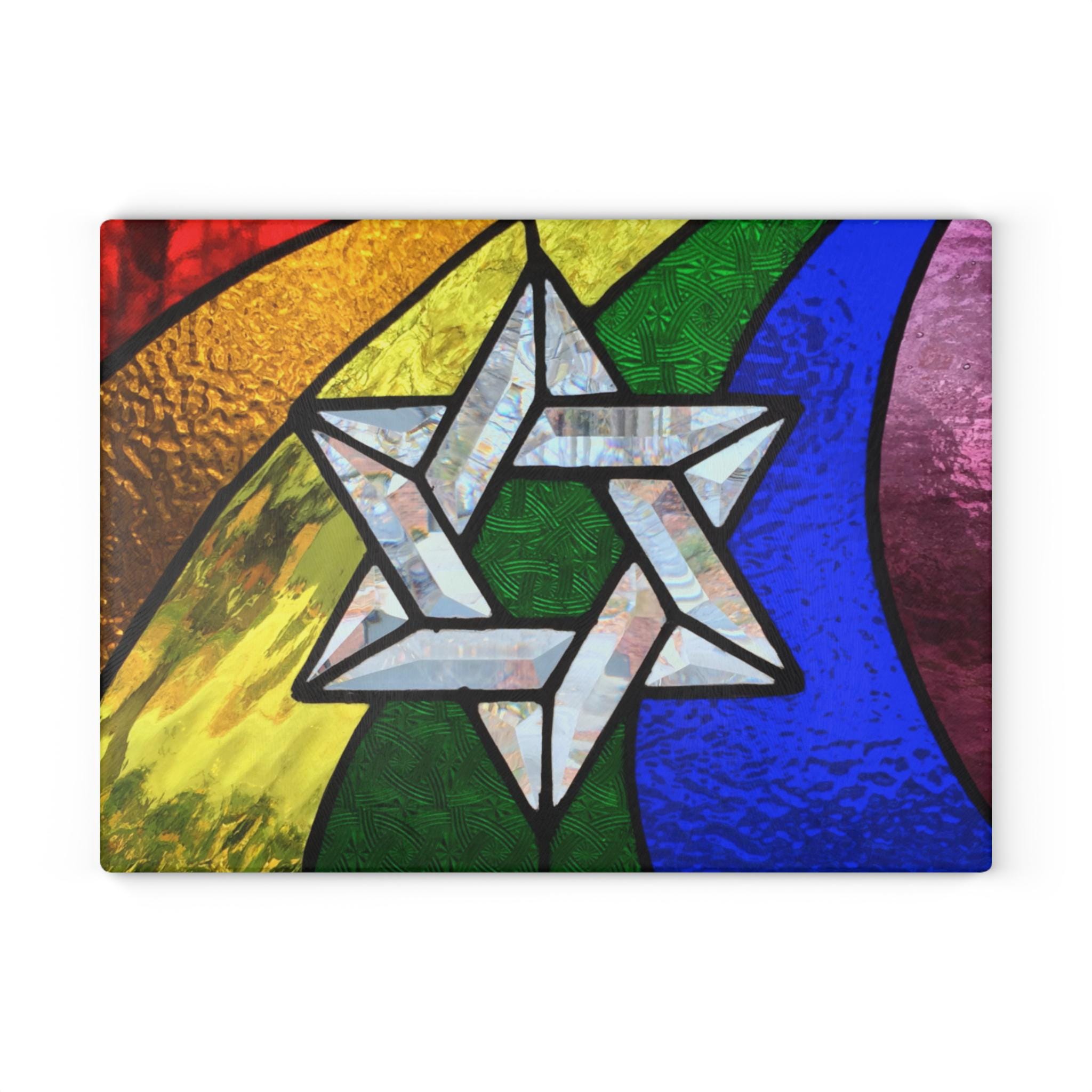 Celebrate your Jewish heritage with vibrant pride through this rainbow stained glass–style challah board featuring a bold Star of David in the full spectrum of Pride colors. Designed to honor both Jewish tradition and LGBTQ+ identity, this Shabbat plate is a meaningful and joyful centerpiece for your table.