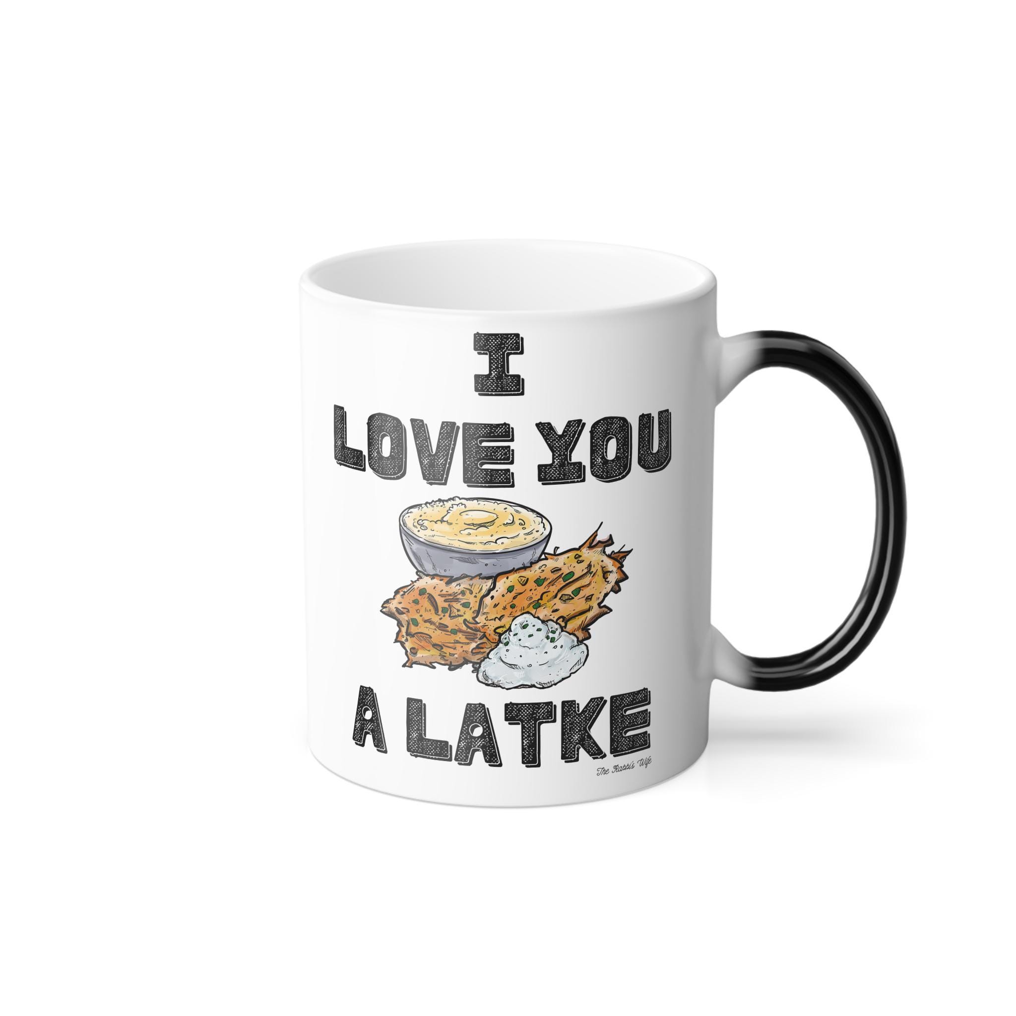 At first glance, the mug appears sleek and glossy black. Pour in a hot drink and watch the festive I Love You a Latke design magically reveal itself. It is a playful surprise that feels perfect for Hanukkah mornings, candle lighting nights, or cozy winter afternoons with coffee, tea, or hot cocoa.