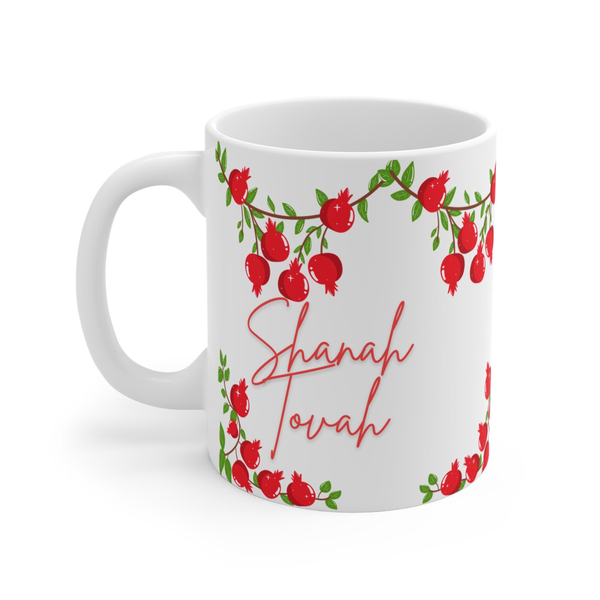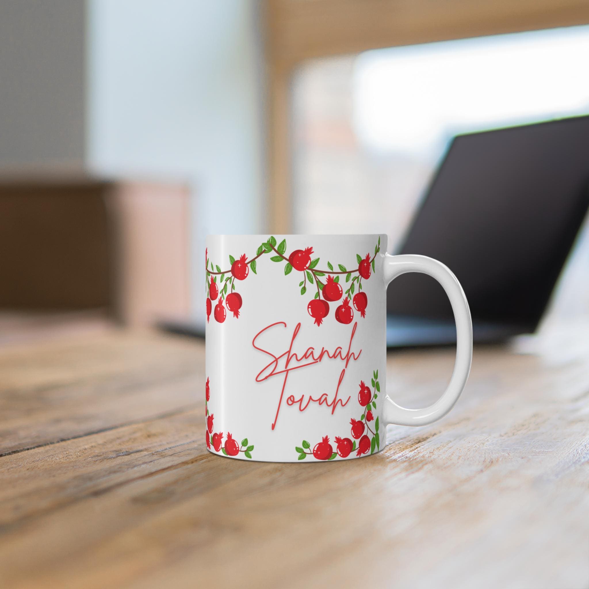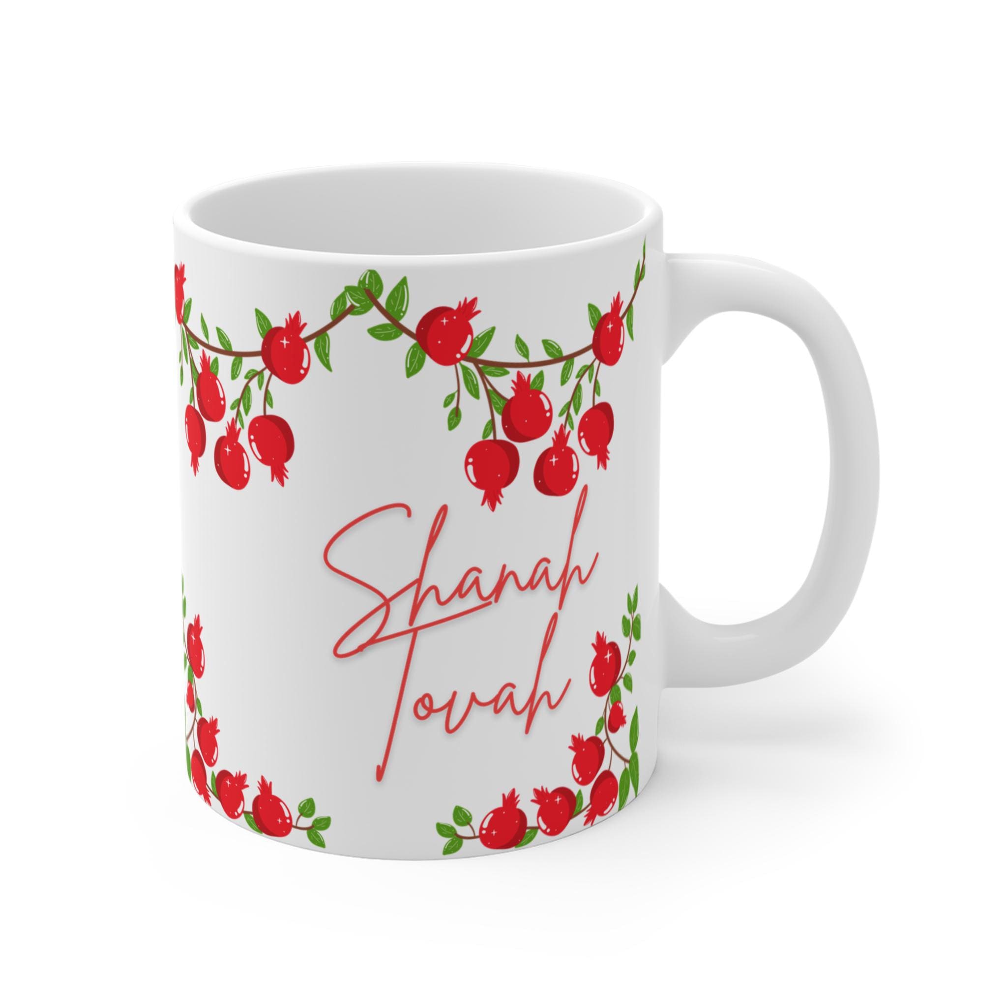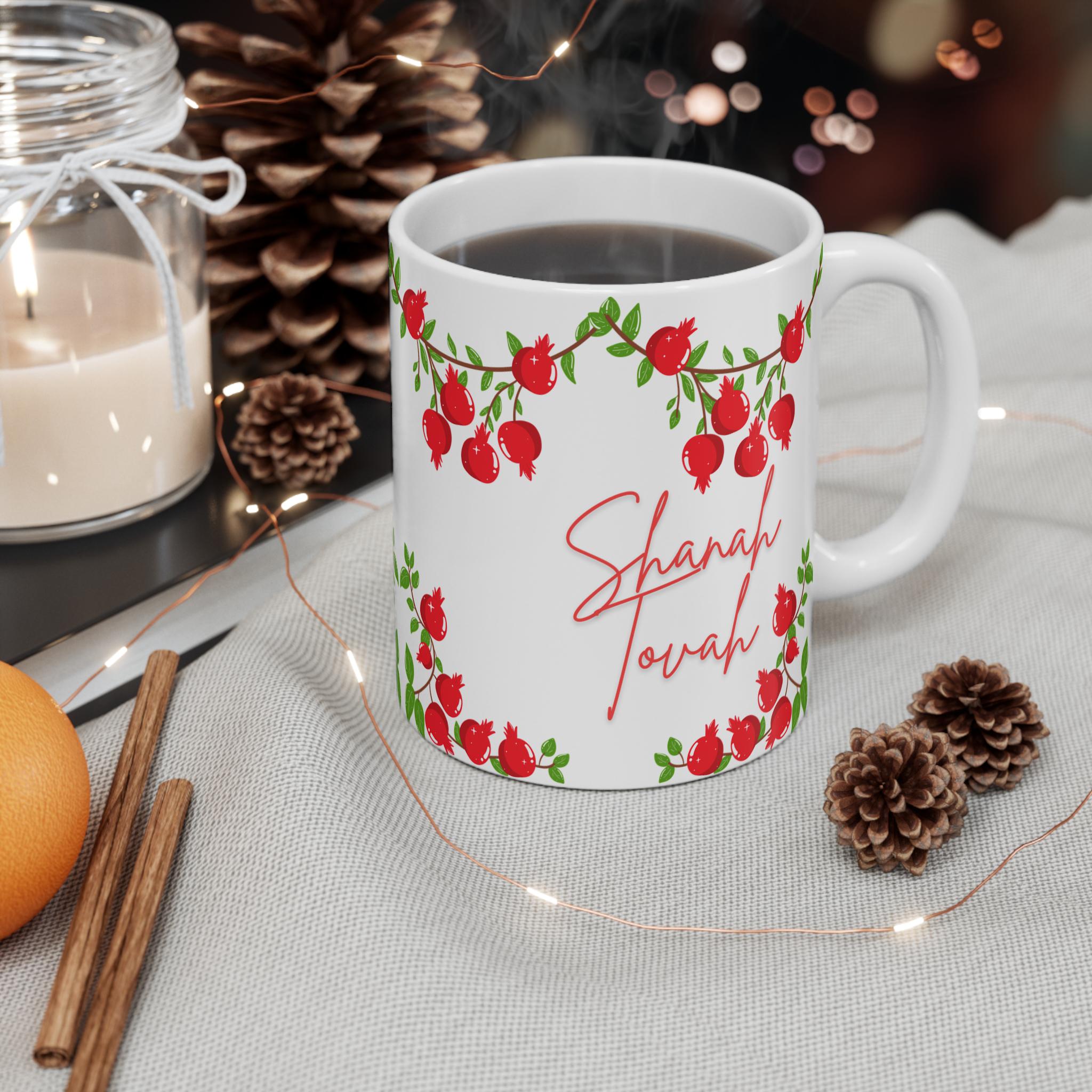 Celebrate a sweet new year with every warm sip. This Rosh Hashanah mug is adorned with vibrant pomegranates and the greeting Shanah Tovah, blending meaningful Jewish symbolism with everyday comfort.