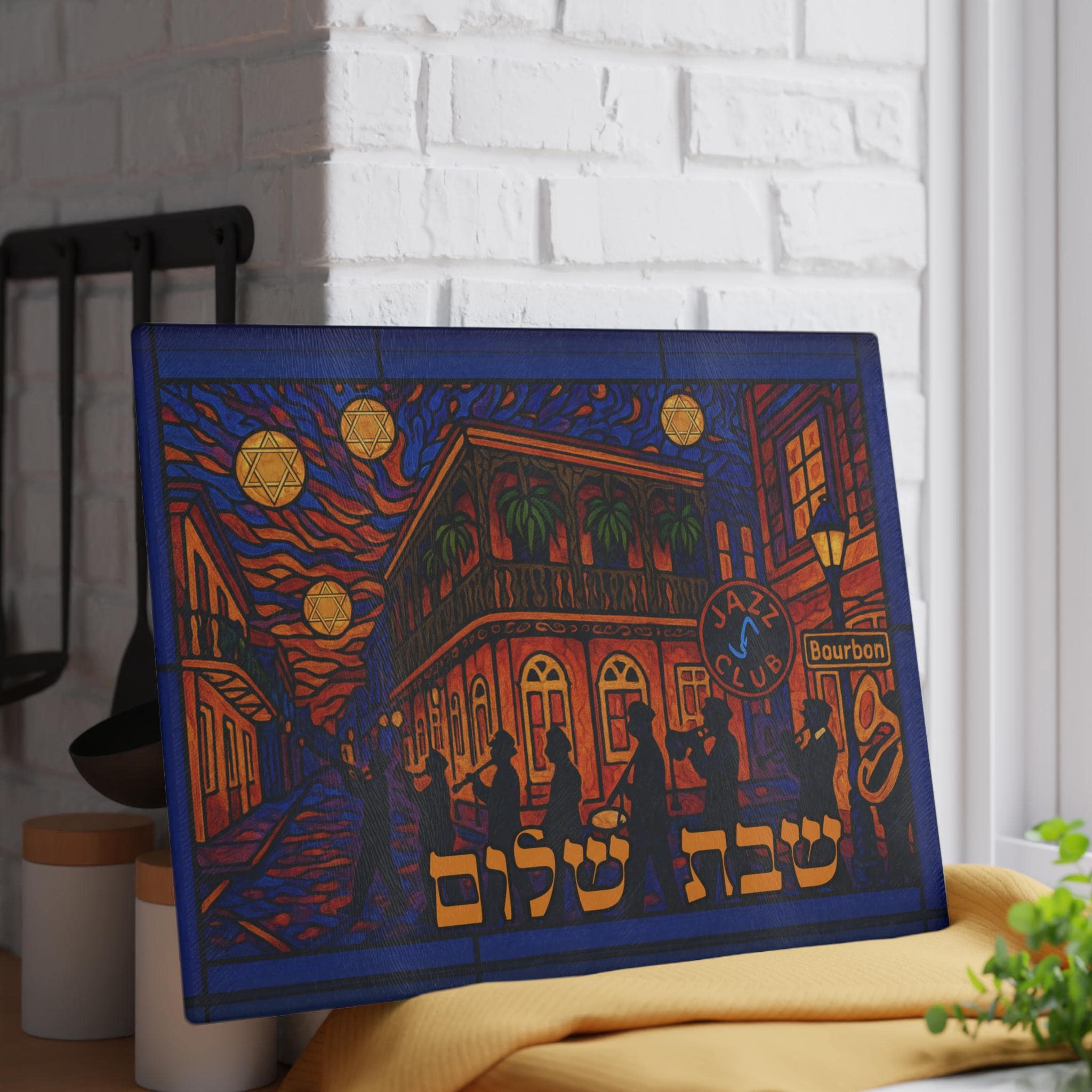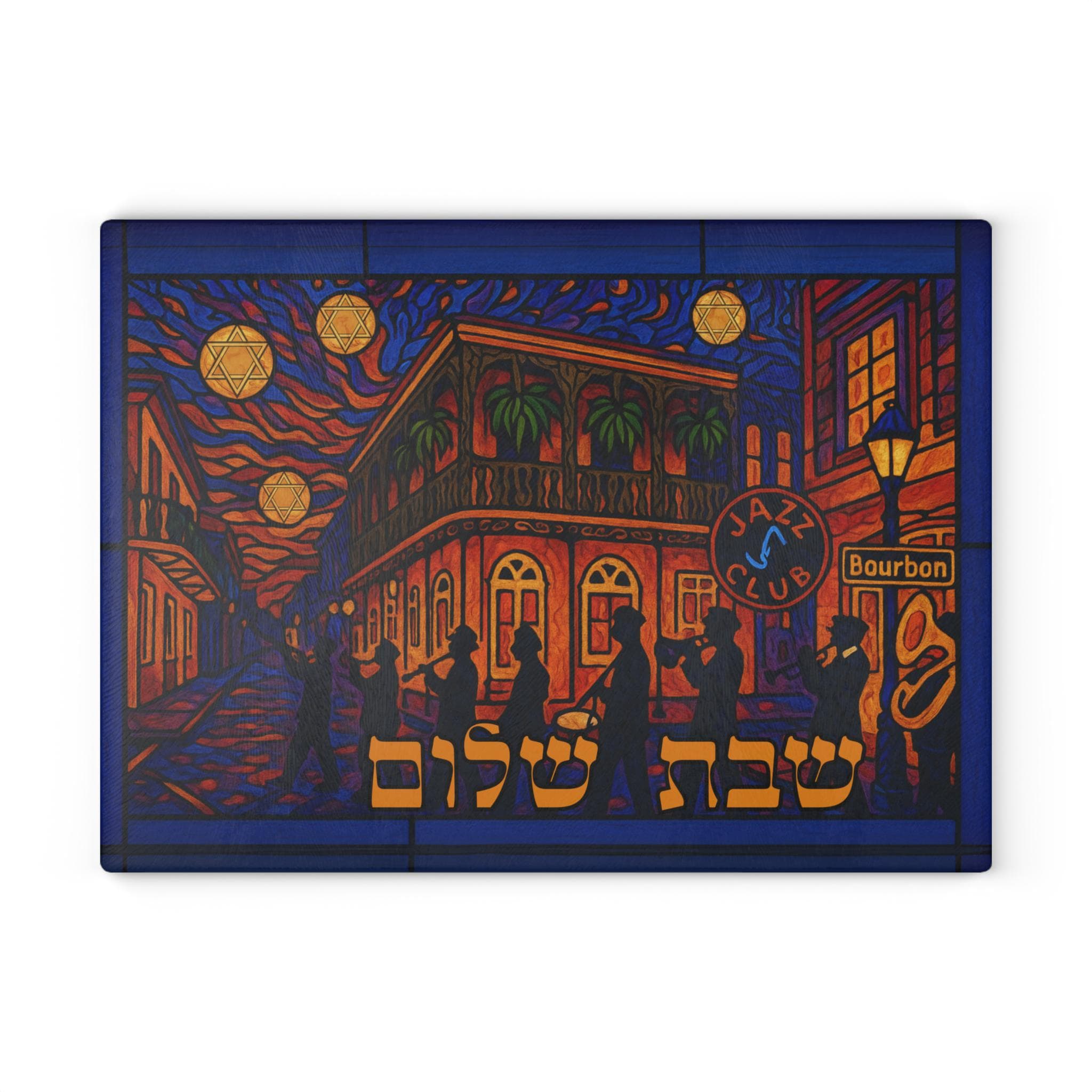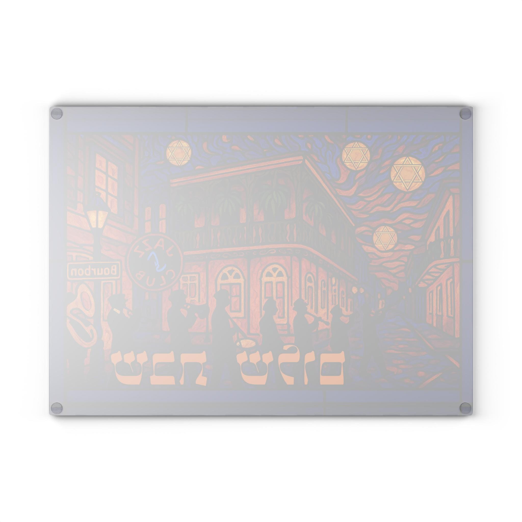 Sized at 15 inches wide by 11 inches tall, this board showcases high-resolution digital artwork with a stained glass aesthetic. Crafted for printing on glass, acrylic, or wood, it creates a vibrant focal point for your Shabbat or holiday table. The dynamic composition captures the heart of NOLA culture while honoring timeless Jewish tradition.