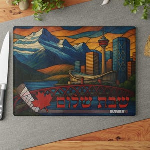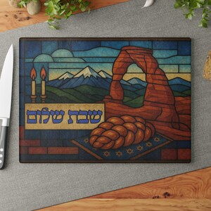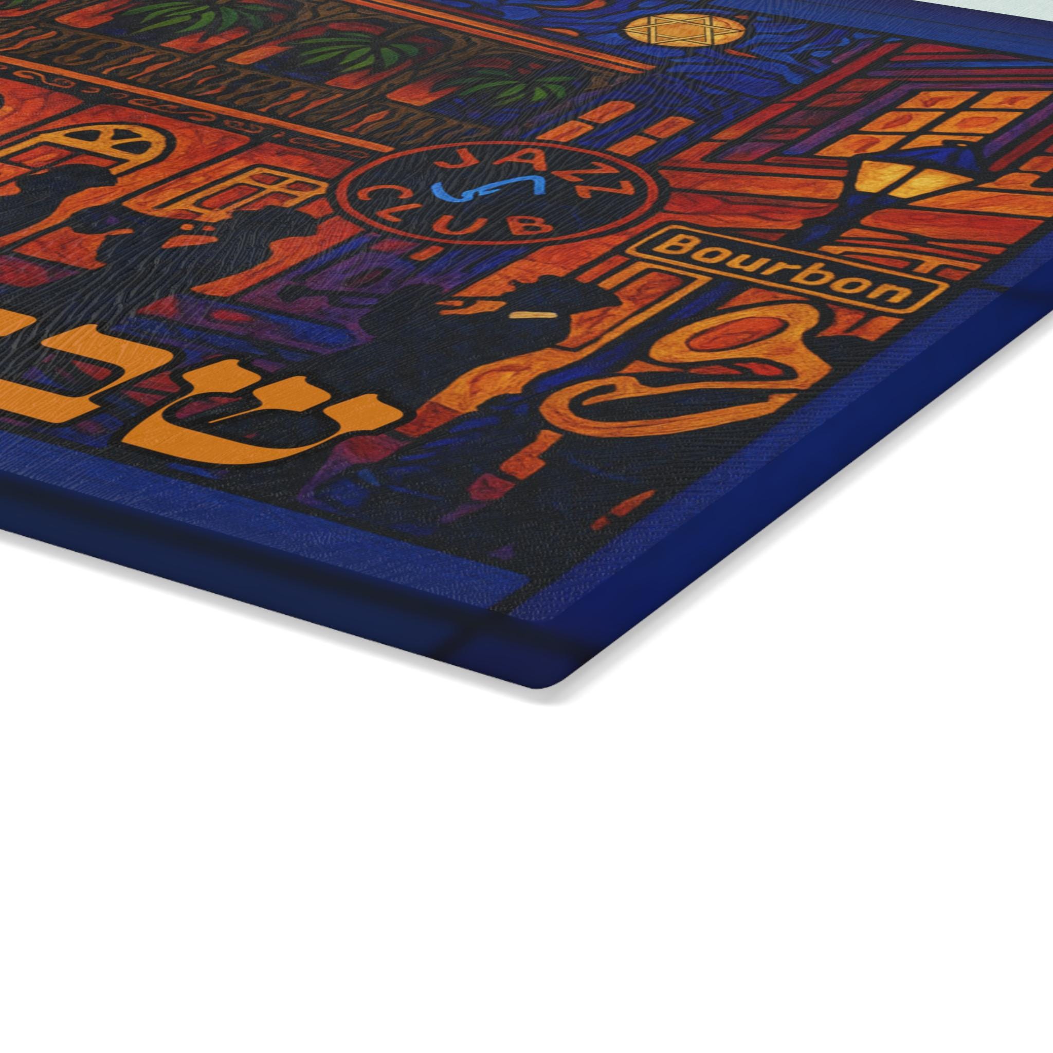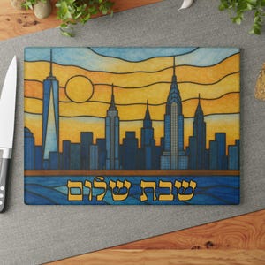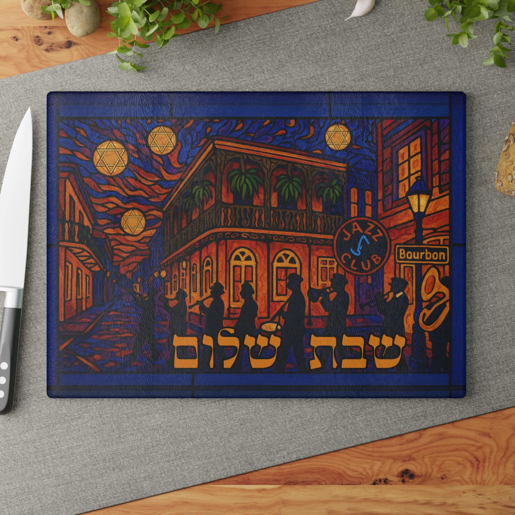 Sized at 15 inches wide by 11 inches tall, this board showcases high-resolution digital artwork with a stained glass aesthetic. Crafted for printing on glass, acrylic, or wood, it creates a vibrant focal point for your Shabbat or holiday table. The dynamic composition captures the heart of NOLA culture while honoring timeless Jewish tradition.