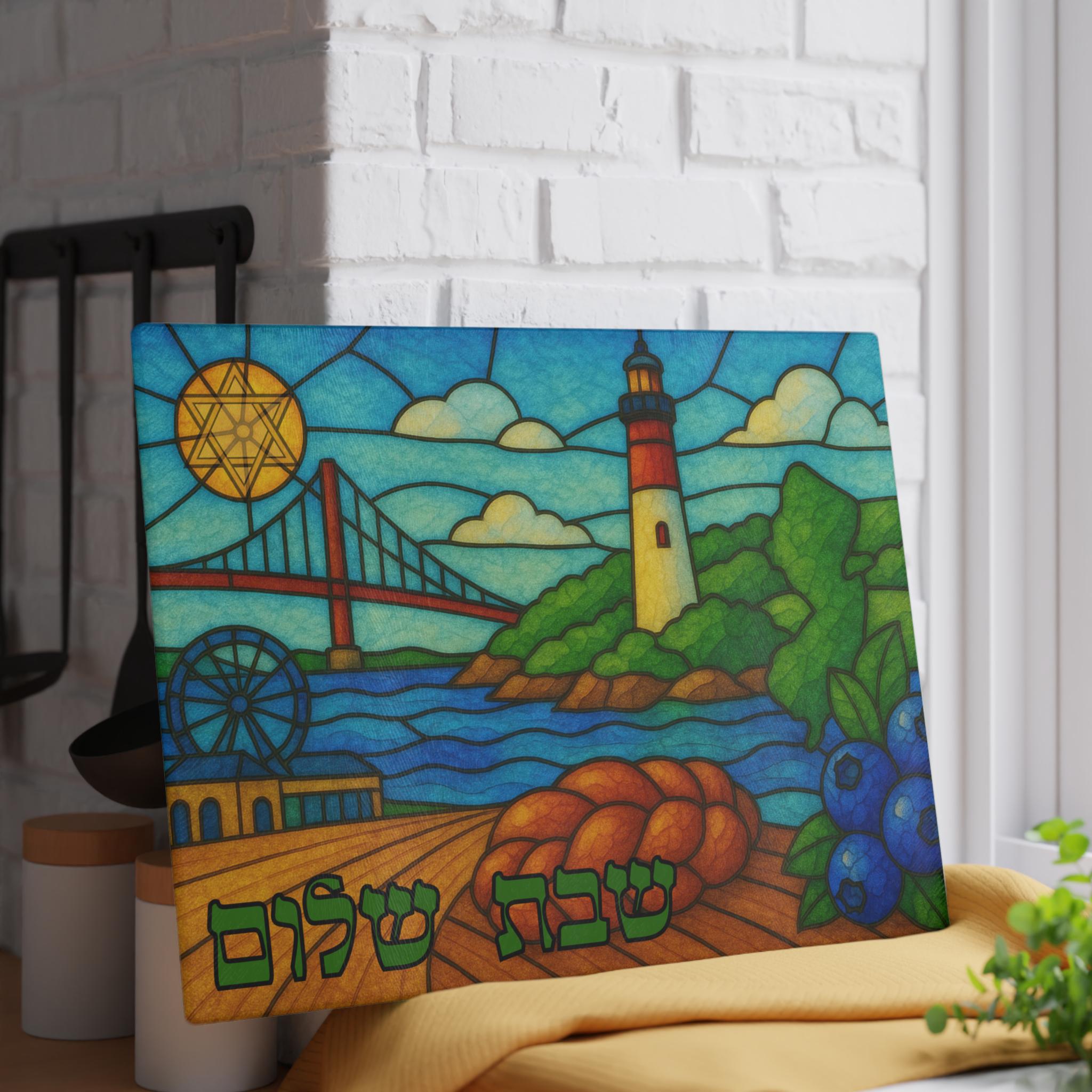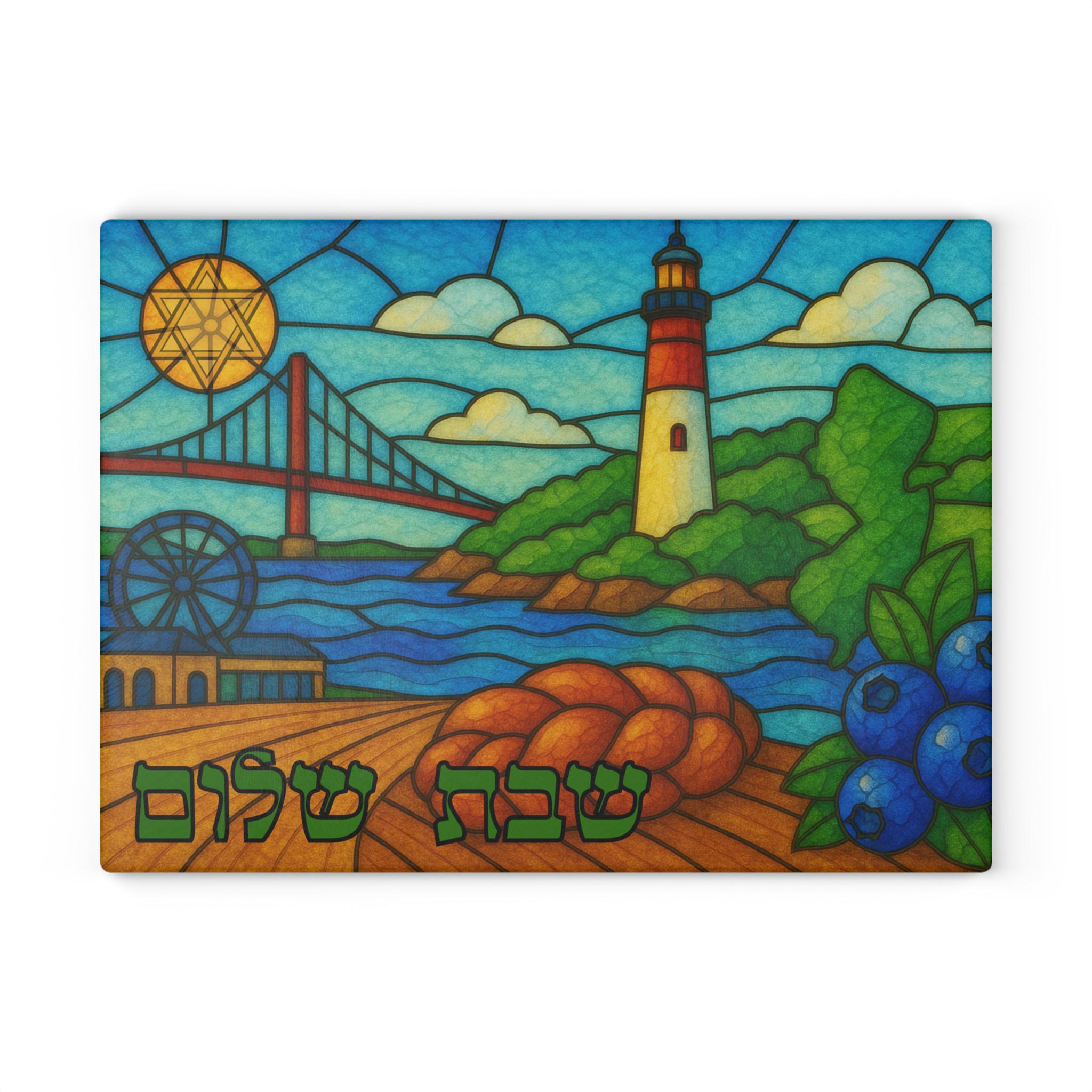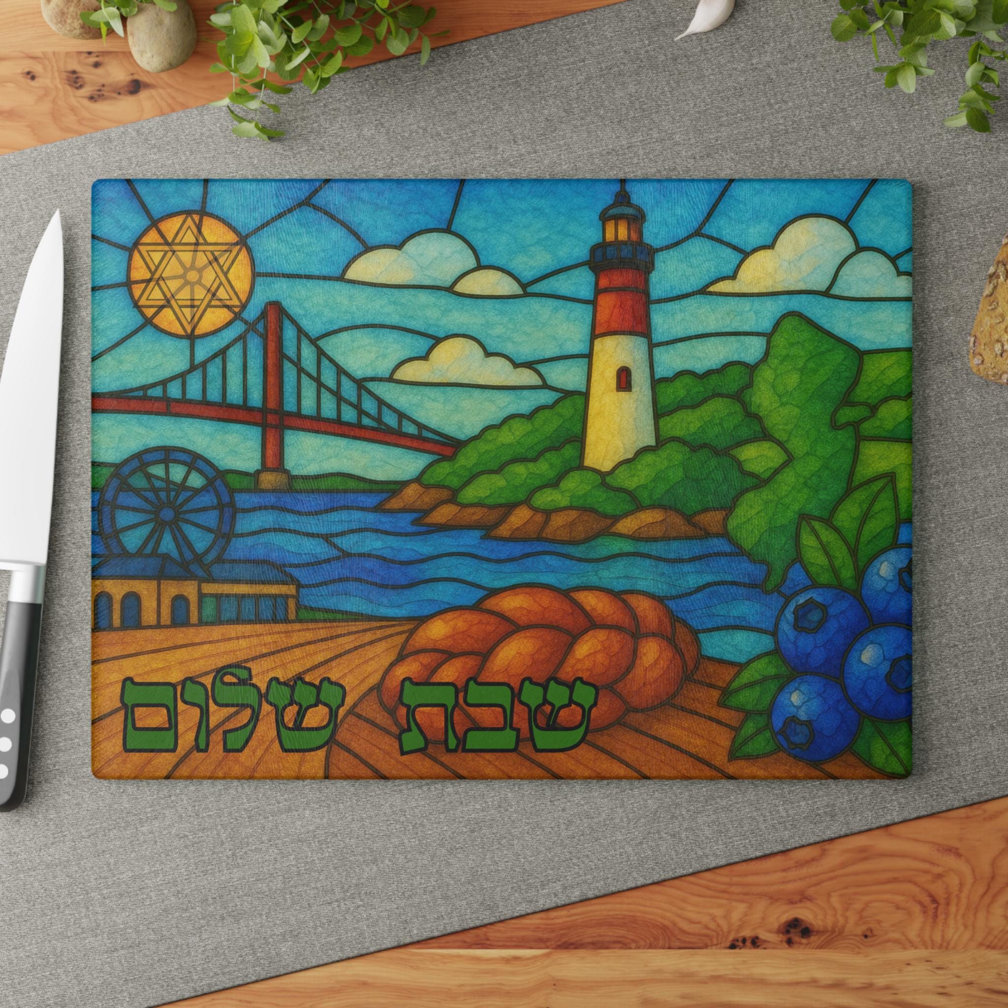 Celebrate the spirit of New Jersey with this vibrant stained glass–style challah board featuring the iconic boardwalk, a classic bridge, the beloved Barnegat Lighthouse, and touches of coastal charm like local blueberries and fresh challah imagery. This artistic Shabbat tray blends regional pride with meaningful Jewish tradition in a piece that stands out on any table.