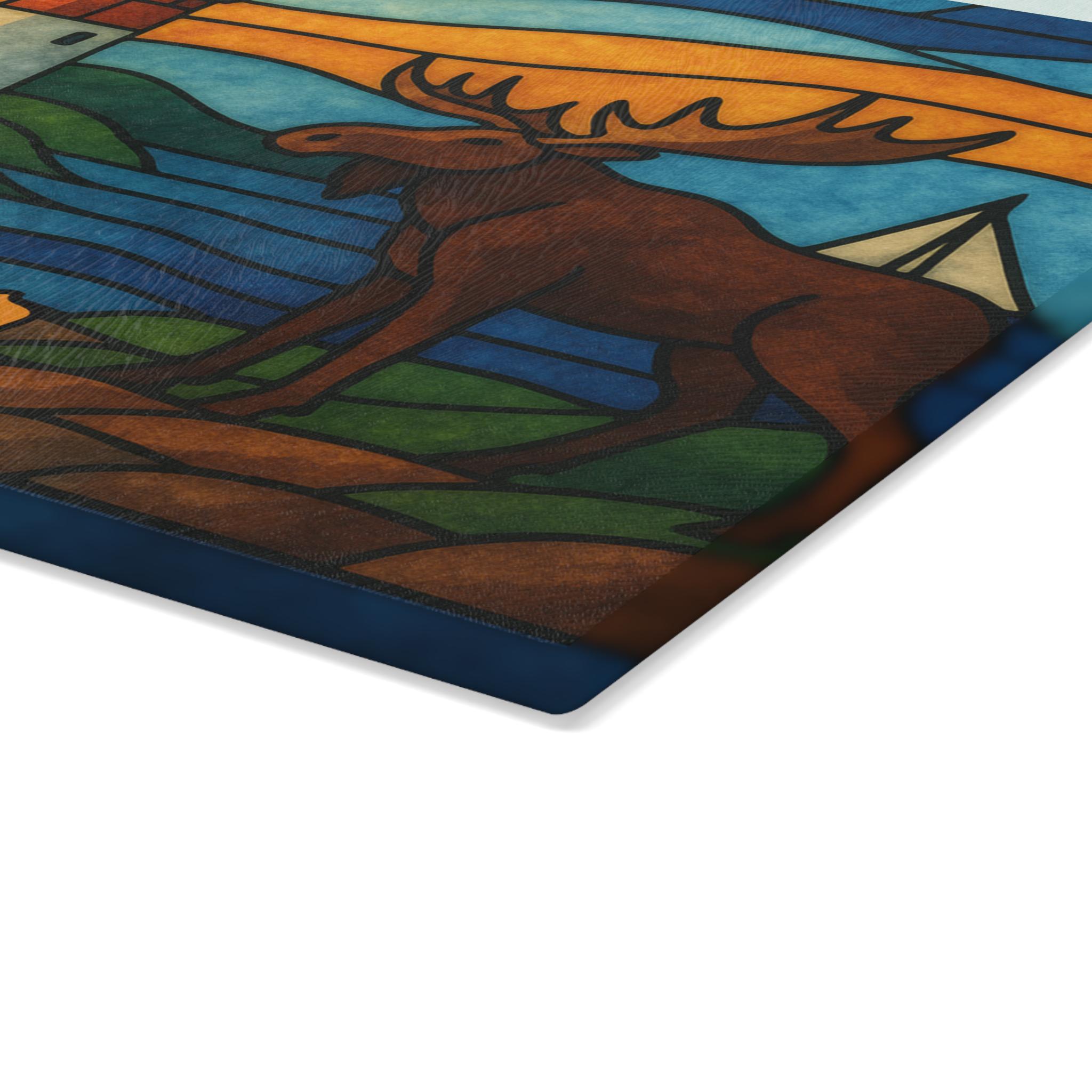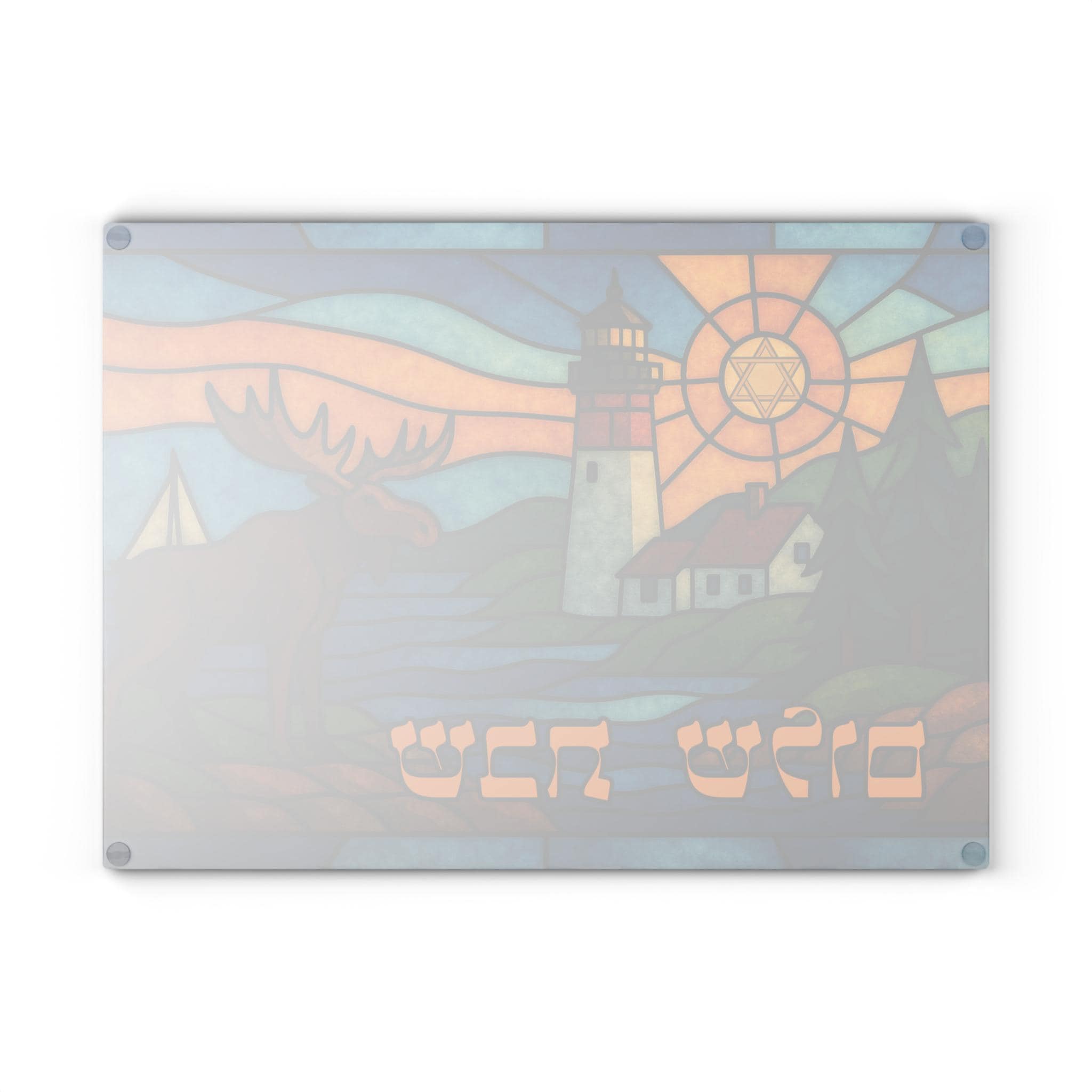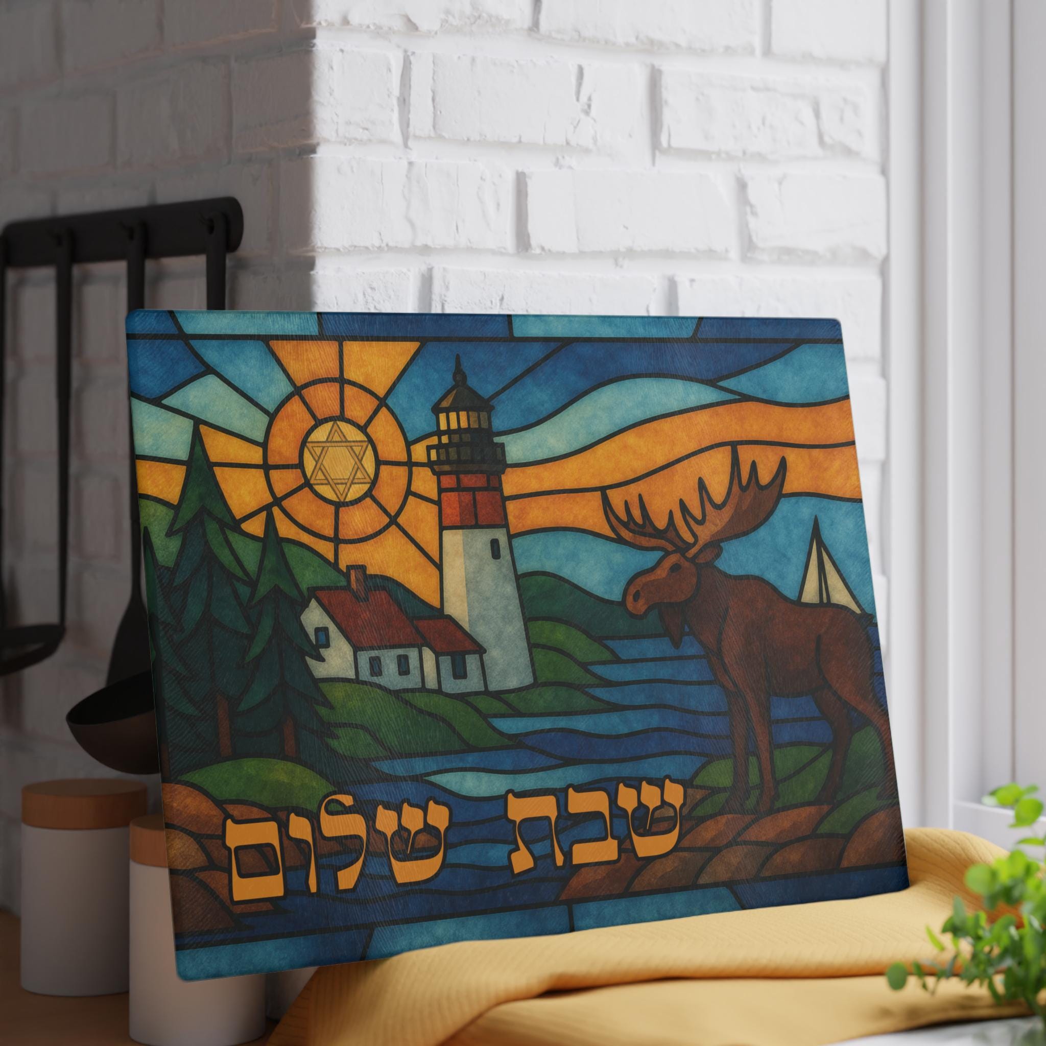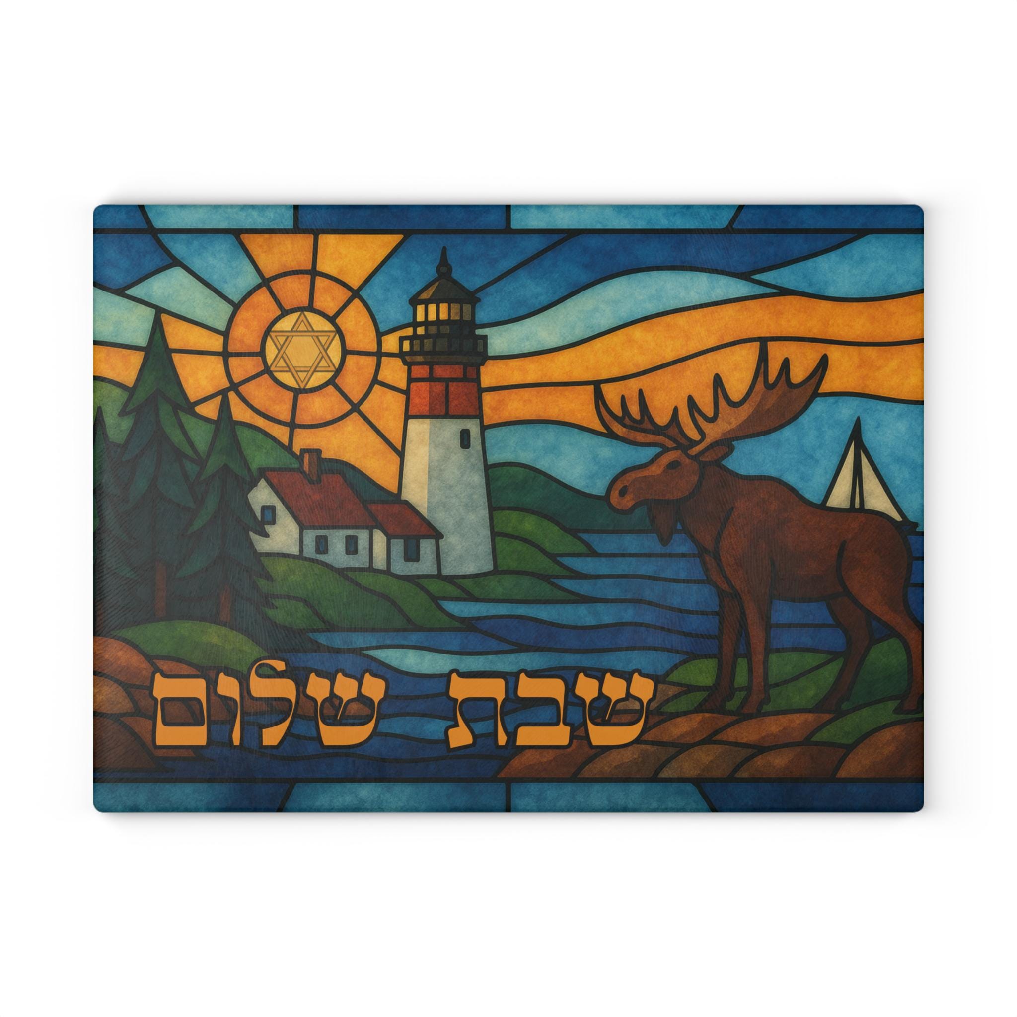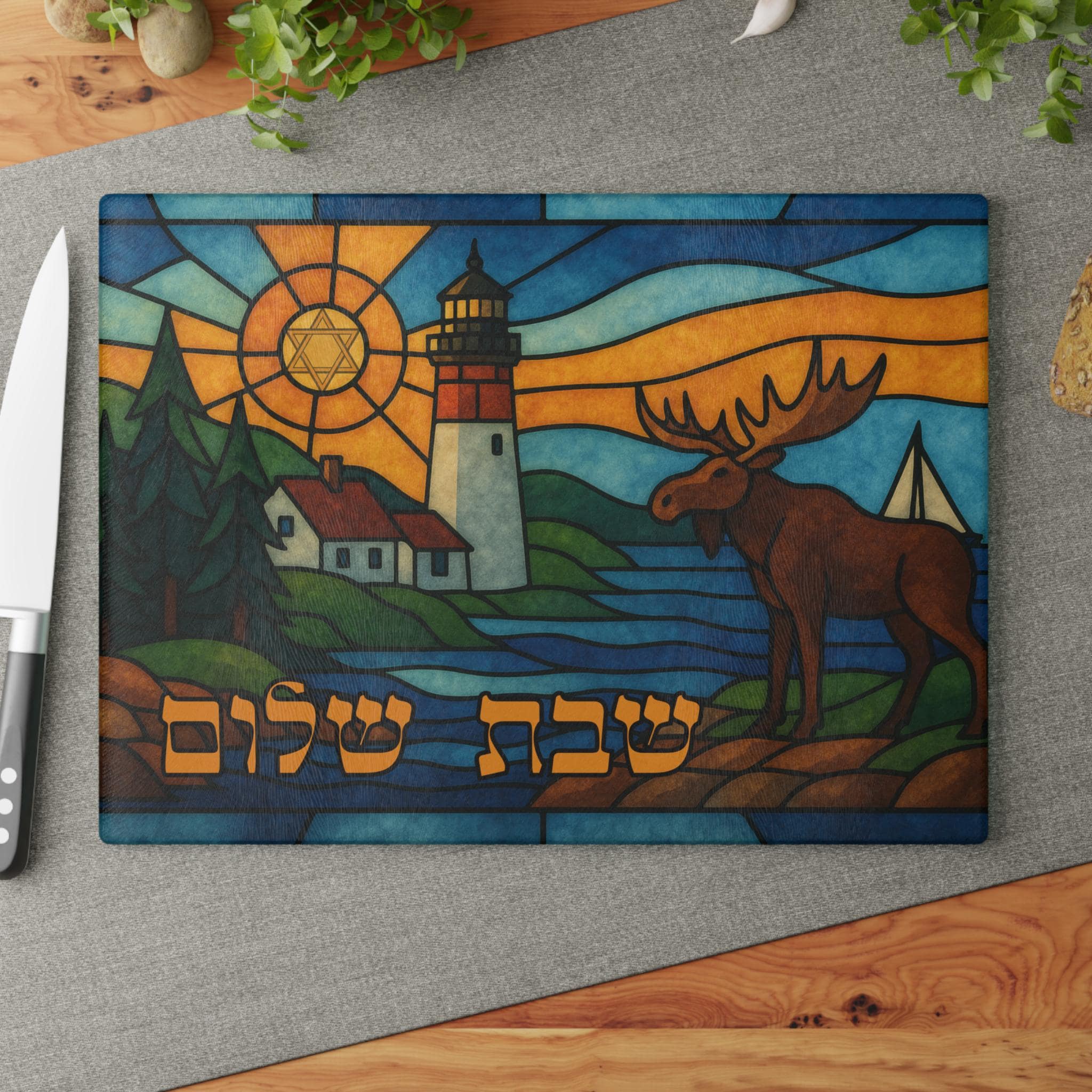Maine Challah Board featuring a majestic moose, Portland Head Lighthouse, and “Shabbat Shalom” in elegant Hebrew. This tempered glass challah tray brings New England coastal charm to your Shabbat table in a way that feels both personal and deeply rooted in Jewish tradition.