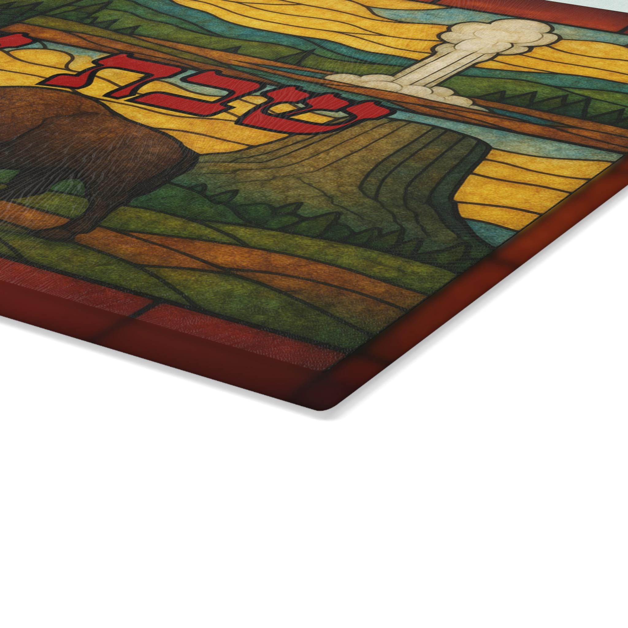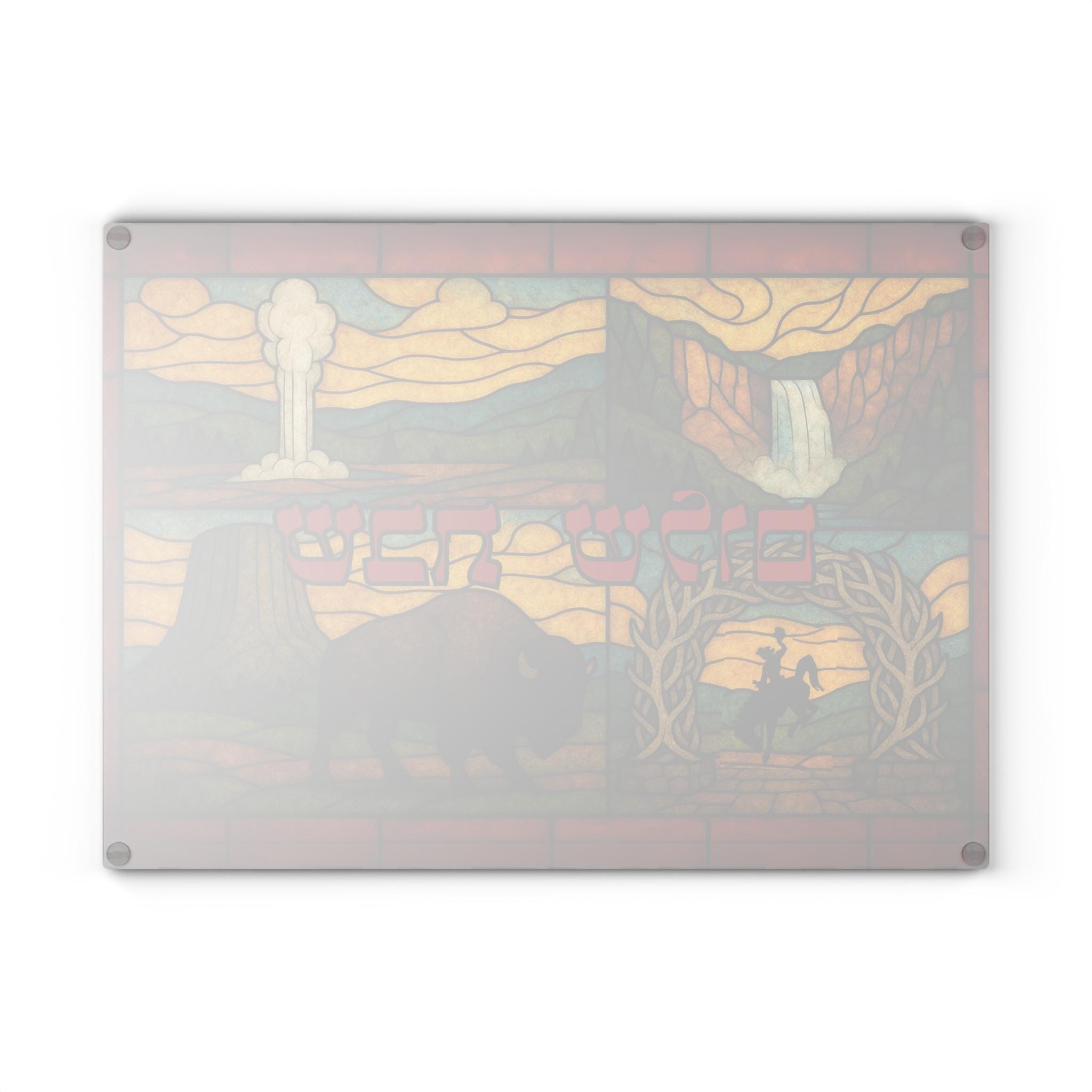 Bring the rugged beauty of Wyoming to your Shabbat table with this stained glass–style challah board featuring Devils Tower, the iconic Antler Arch, Yellowstone National Park, and Old Faithful. Designed to capture the spirit of the American West, this 15×11 inch Shabbat glass tray blends breathtaking landscapes with meaningful Jewish tradition.