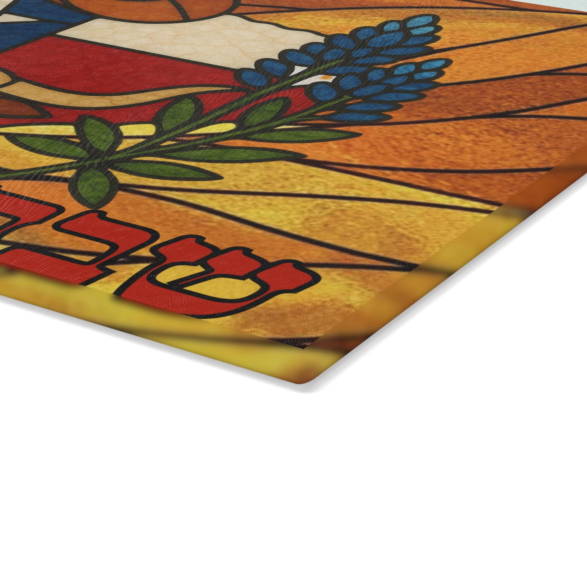 Crafted from durable tempered glass, the hygienic surface is heat-resistant and perfect for serving challah at weekly Shabbat dinners and holiday gatherings. The vivid stained glass artwork adds bold Lone Star character to your table, while non-slip rubber feet provide stability on your countertop or dining surface.