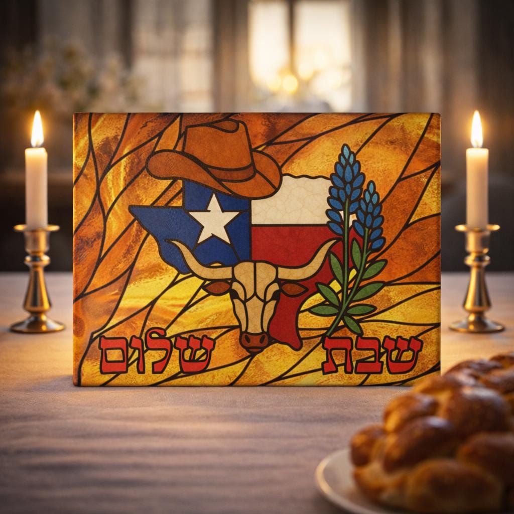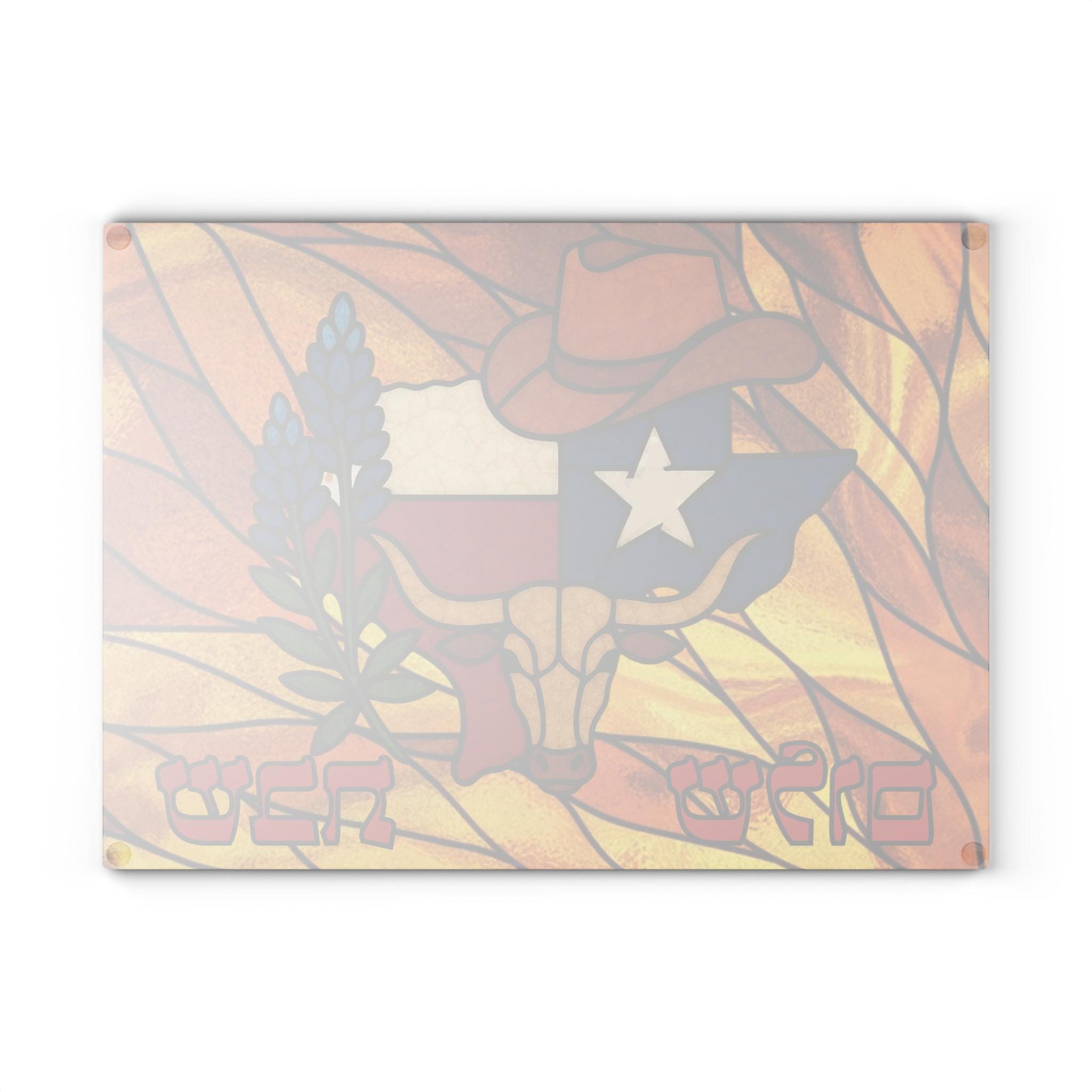 Show your Texas pride at the Shabbat table with this stained glass–style challah board featuring the Texas state outline filled with the state flag, a classic cowboy hat, and vibrant bluebonnets. This 15×11 inch Shabbat glass tray blends Western charm with meaningful Jewish tradition in one striking piece.