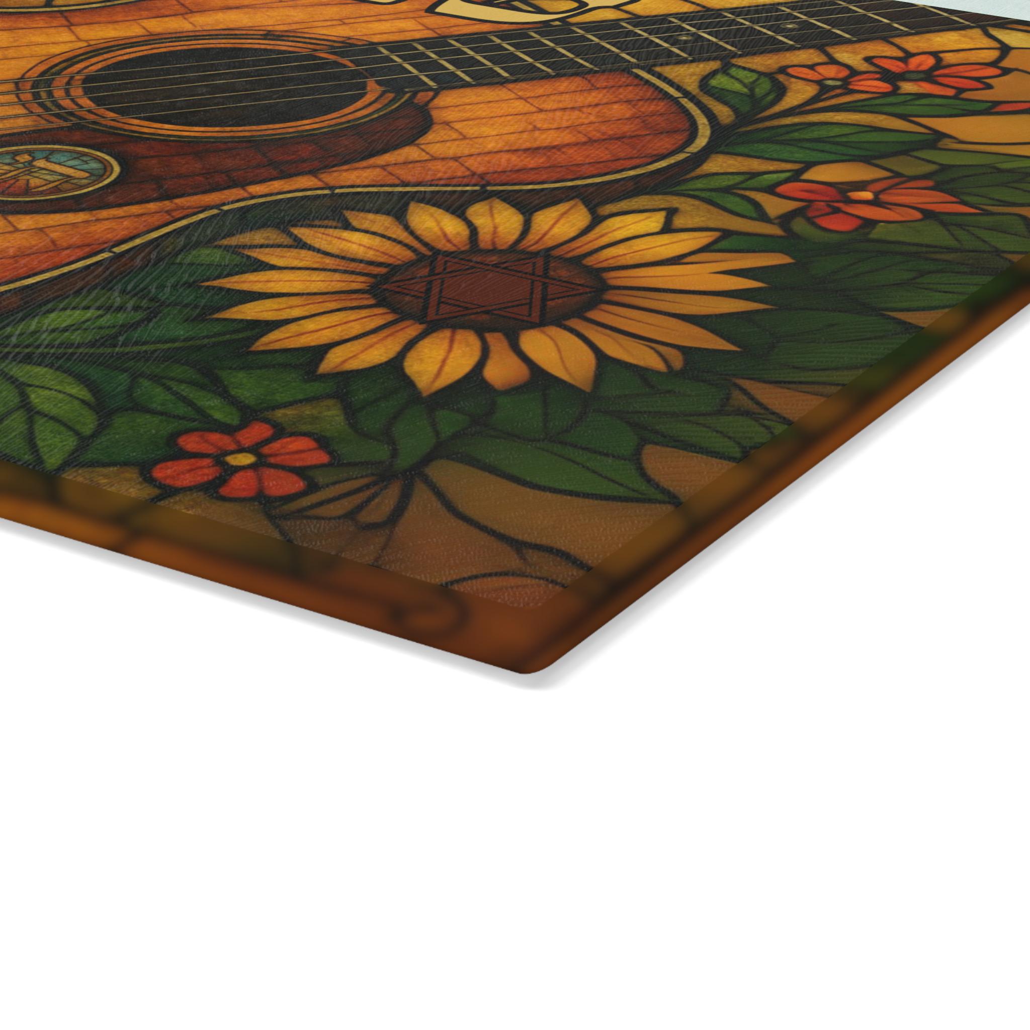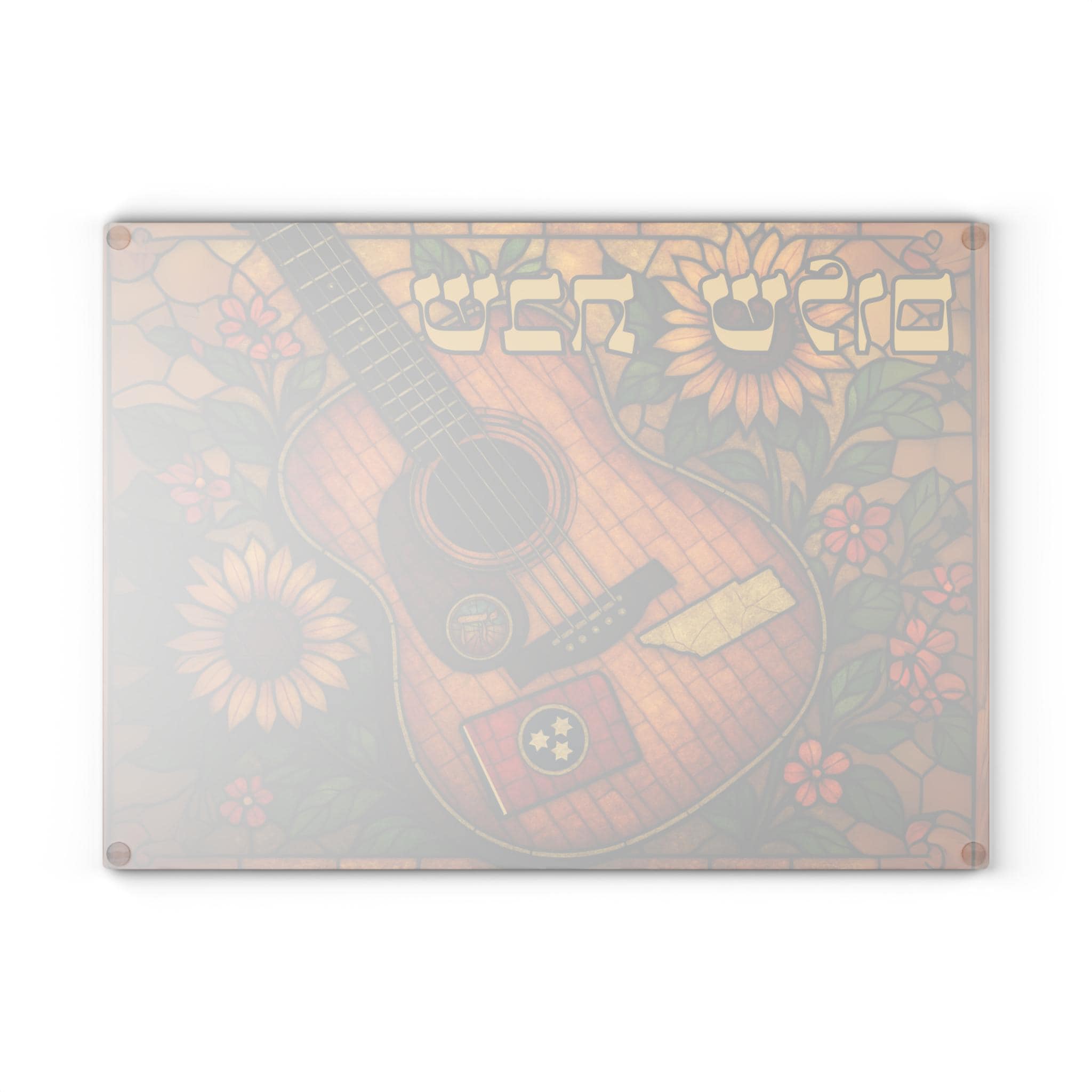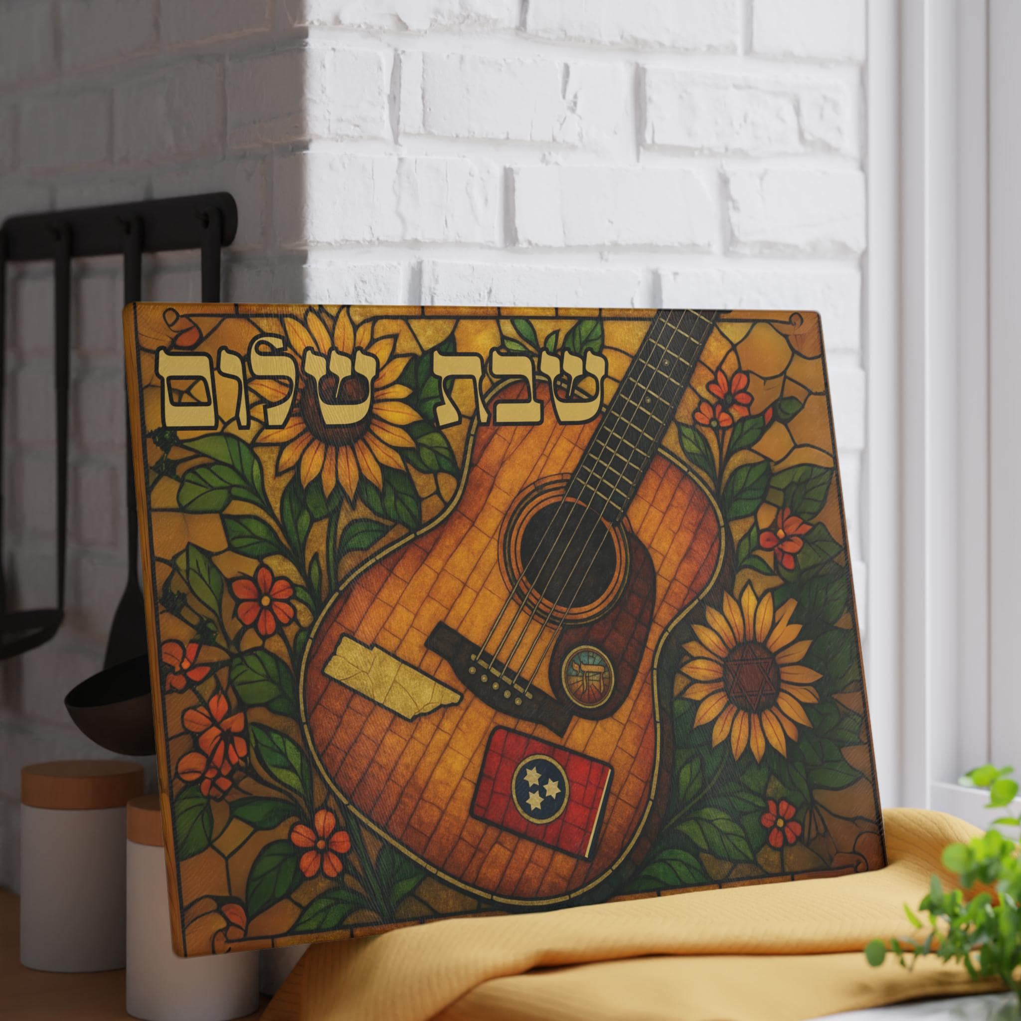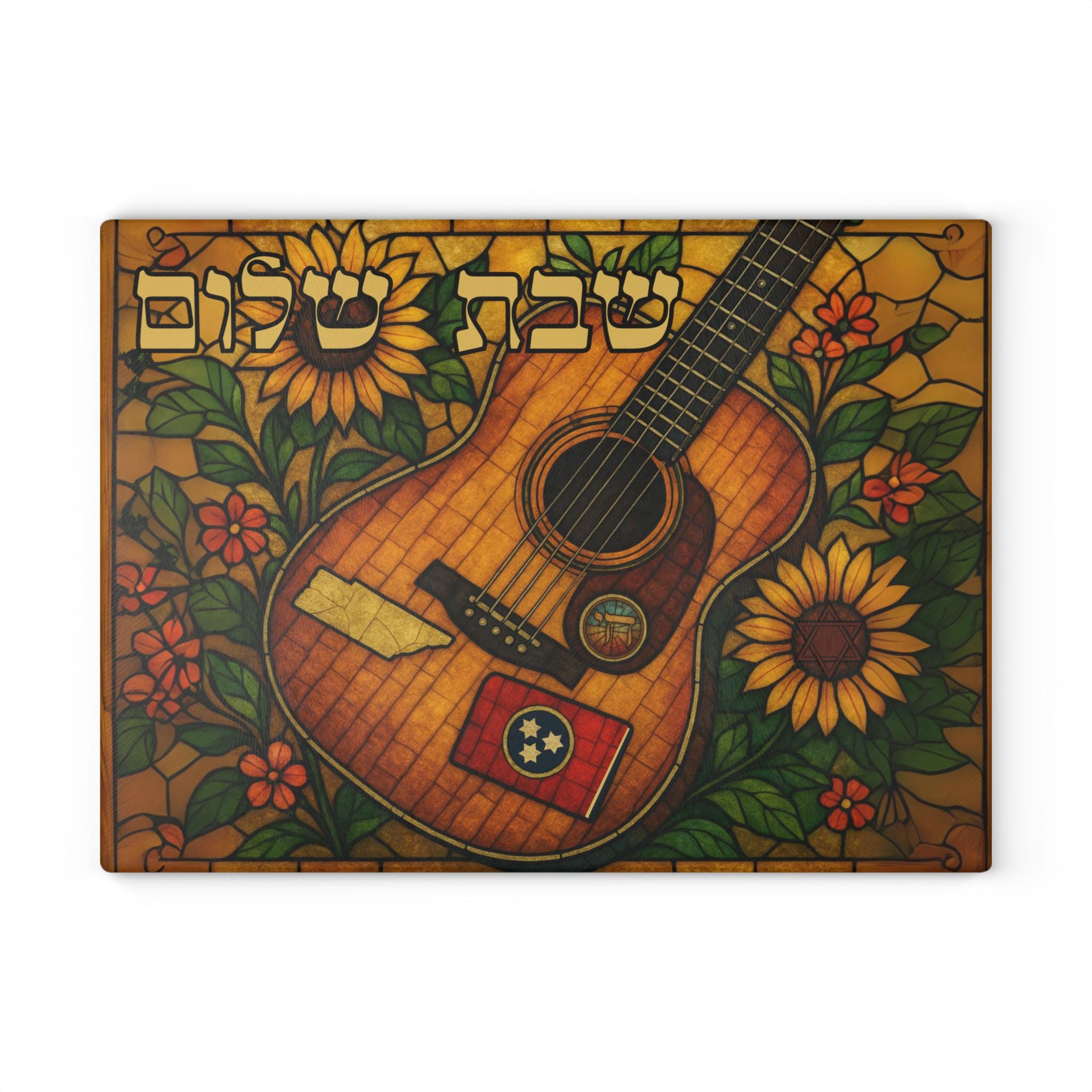 Celebrate Tennessee’s musical spirit and Southern warmth with this stained glass–style challah board featuring a rich-toned acoustic guitar and bright golden sunflowers. This 15×11 inch Shabbat glass tray beautifully blends country music heritage with meaningful Jewish tradition.