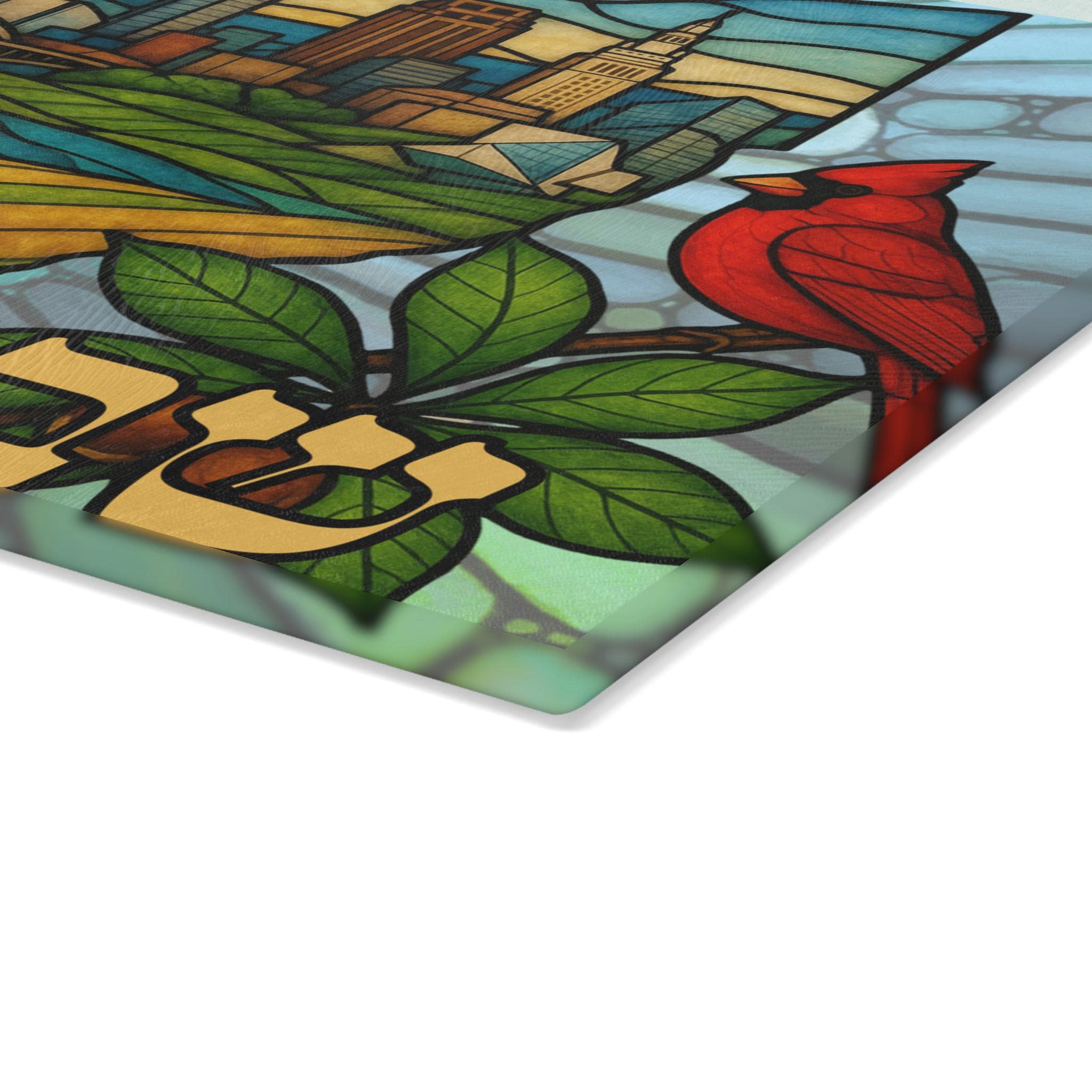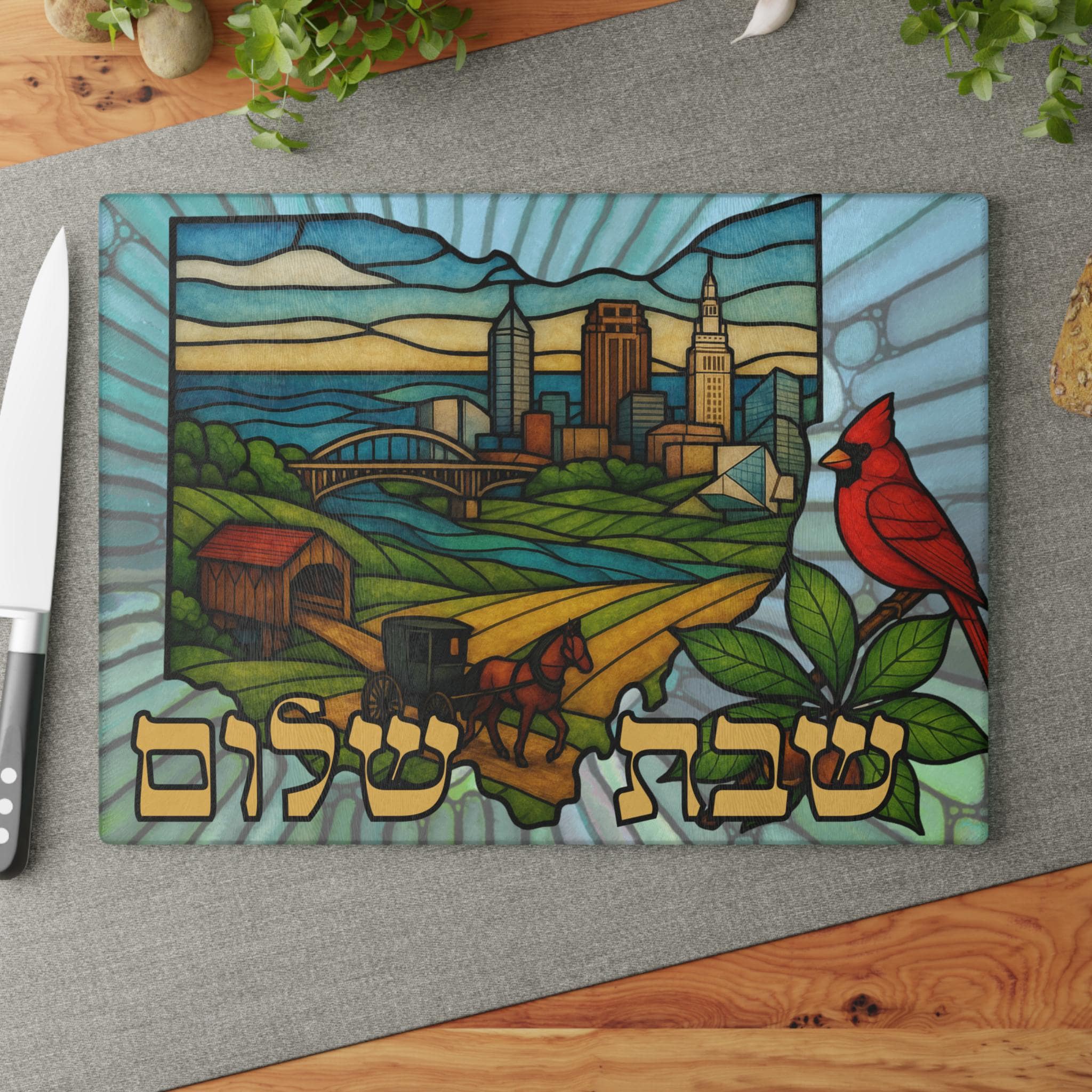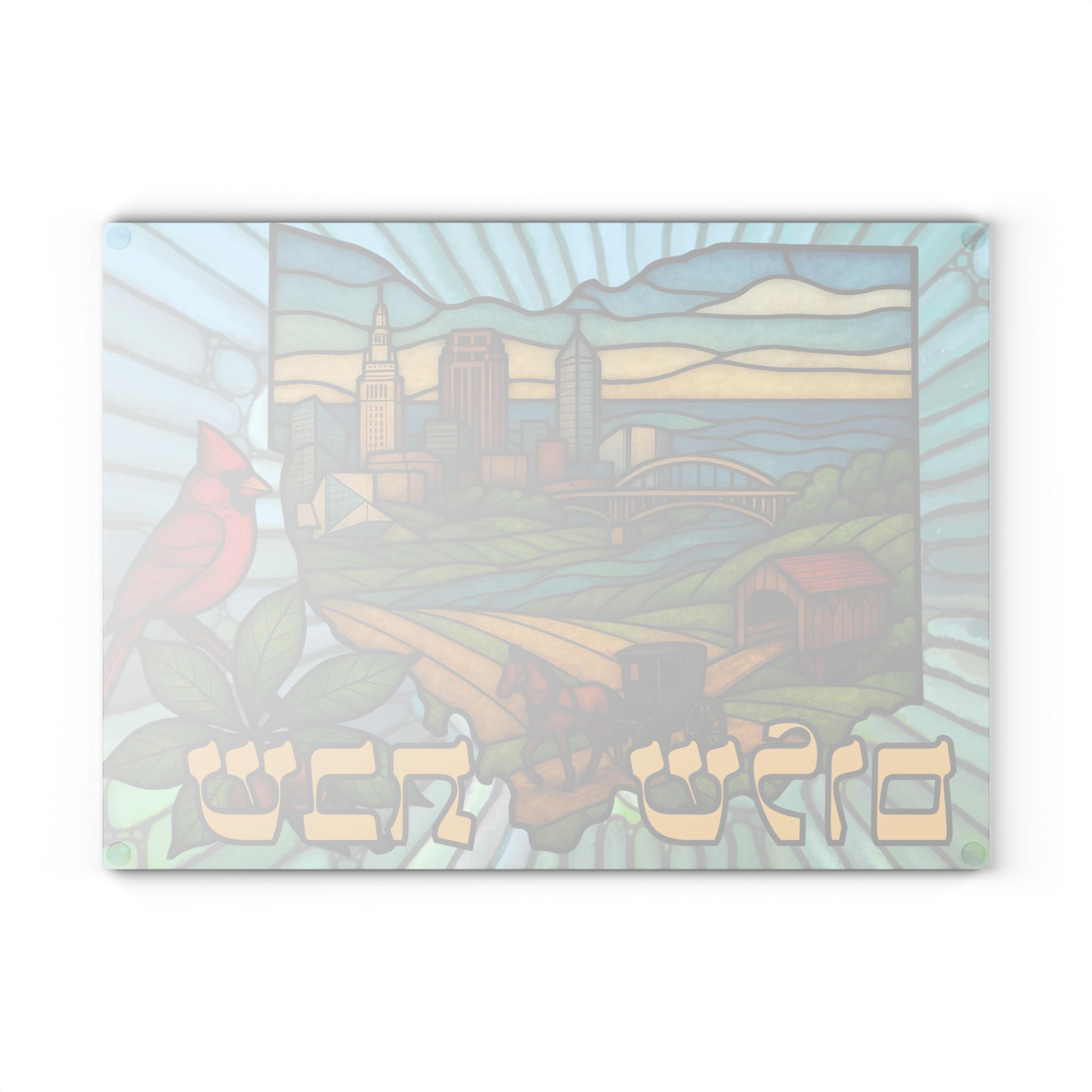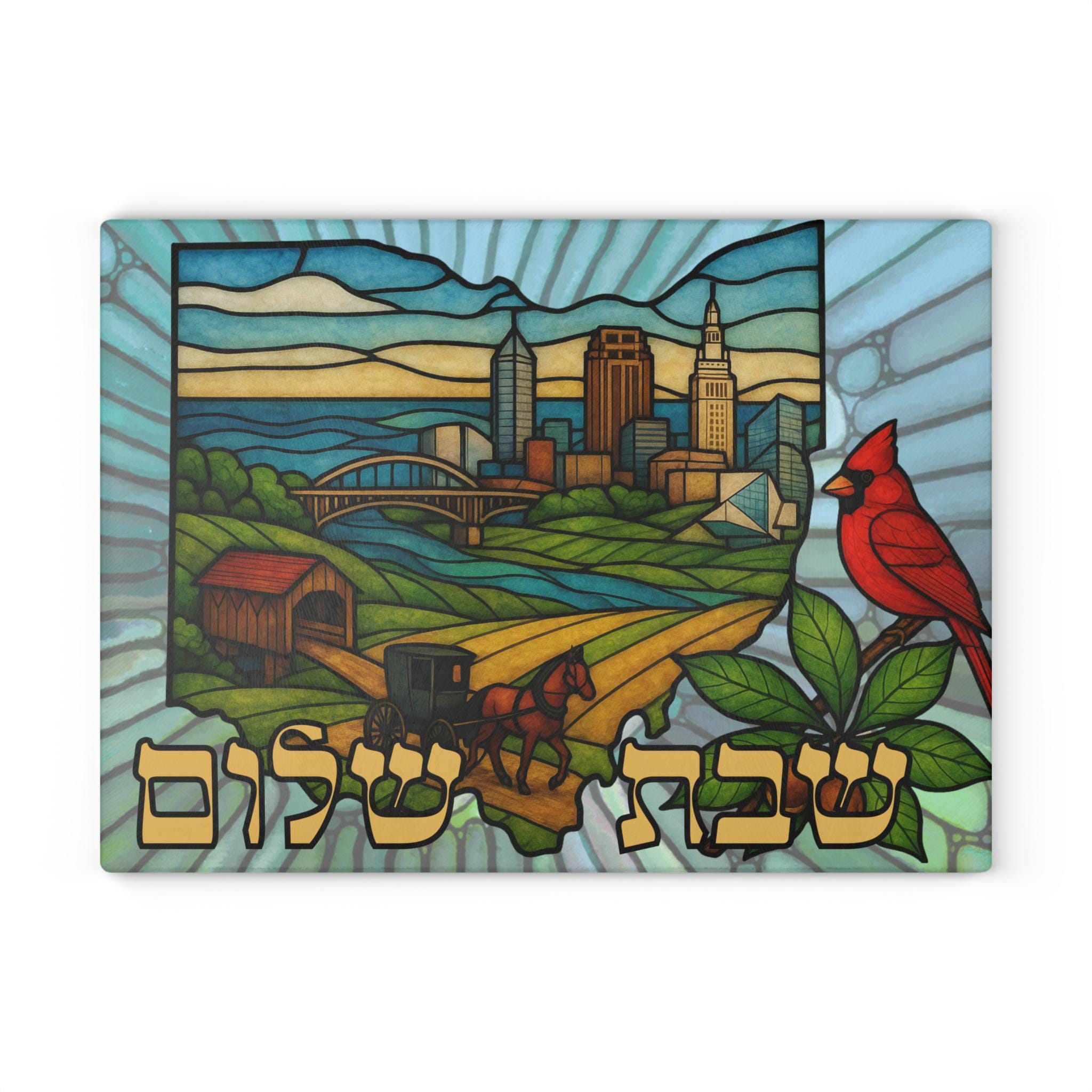 Ohio State Outline Challah Board featuring an Amish horse and buggy, red cardinal, and Rock & Roll Hall of Fame in stained glass style — created for Jewish homes that celebrate Shabbat with Midwest pride. This 15x11 tempered glass Shabbat tray blends Ohio heritage with meaningful Judaica design.