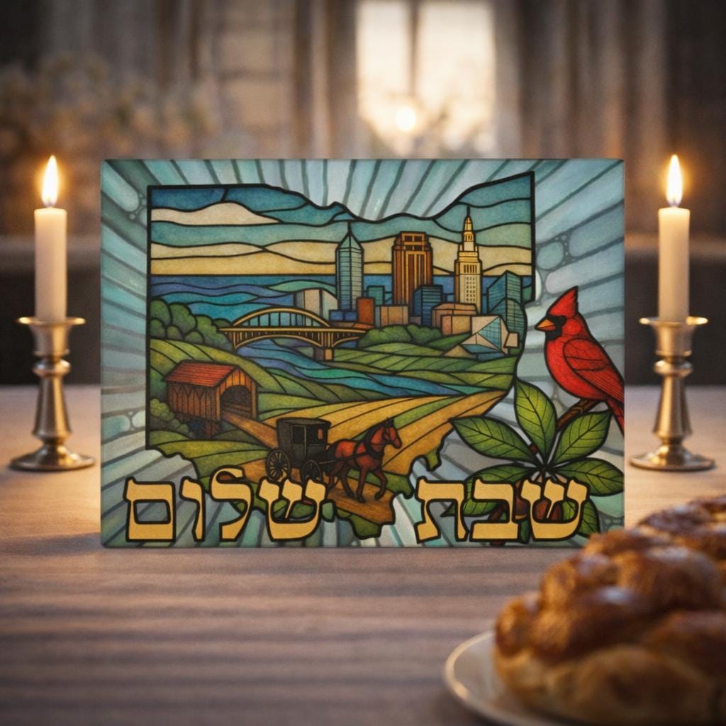 The artwork showcases the Ohio state outline alongside iconic cultural elements including an Amish cart, a vibrant cardinal, city highlights, and the Rock & Roll Hall of Fame. Rendered in stained glass artistry, the design adds color, warmth, and personality to your Shabbat table while honoring the heart of the Buckeye State.