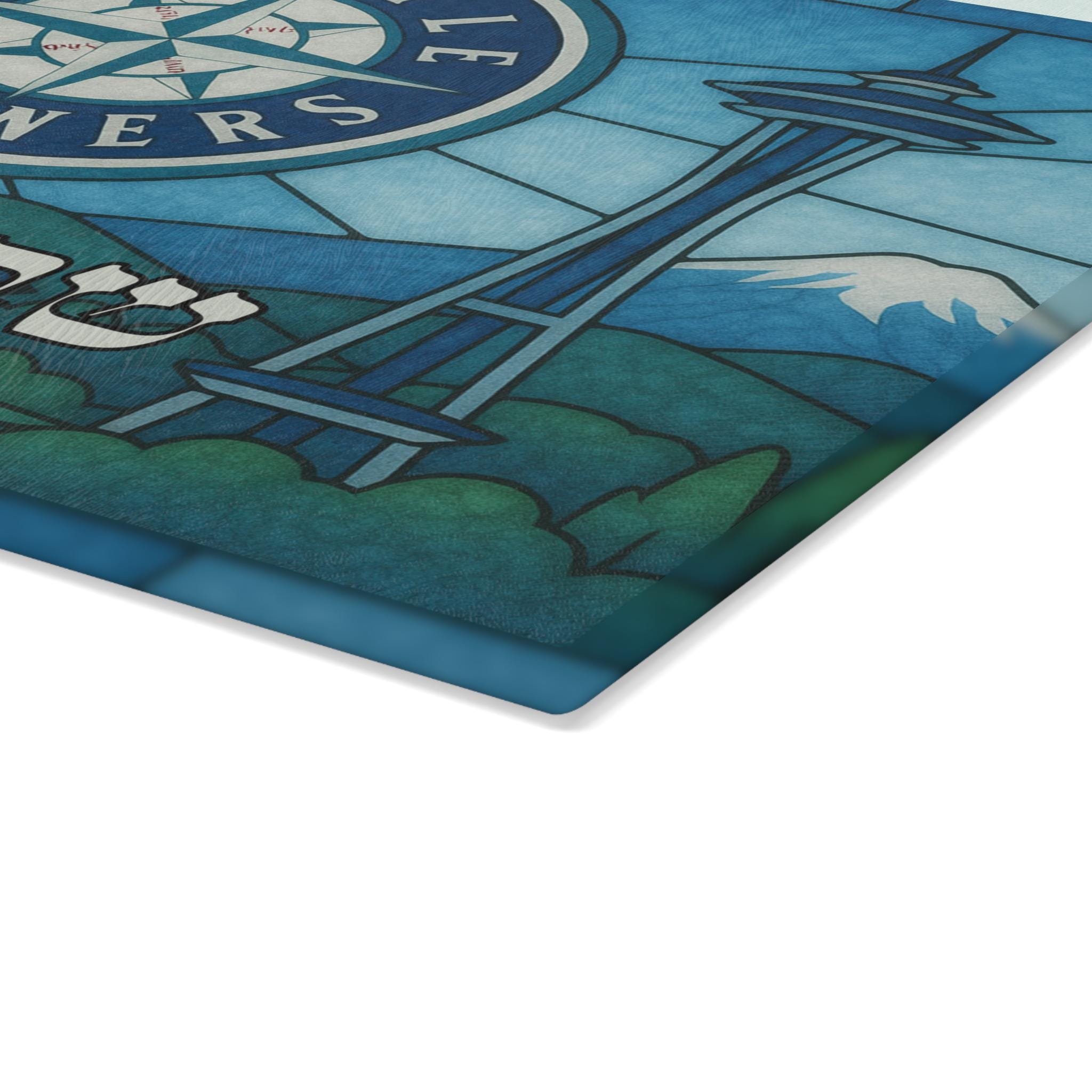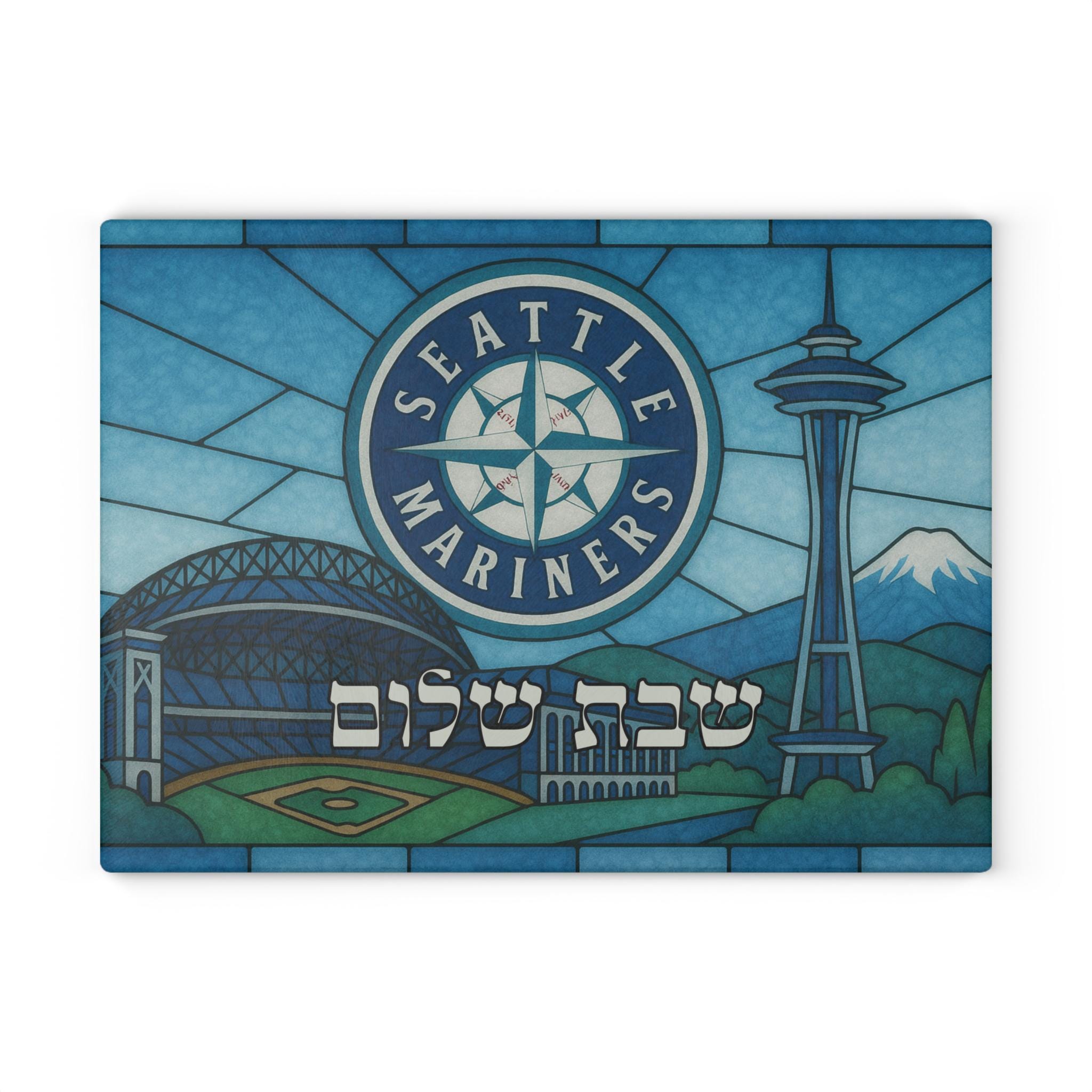 Celebrate Shabbat and your love of the Seattle Mariners with this stained glass–style Mariners challah board designed for Jewish baseball fans. Sized at 15 inches wide by 11 inches high, this tempered glass Shabbat tray blends Jewish tradition with team pride in a bold, artistic display.