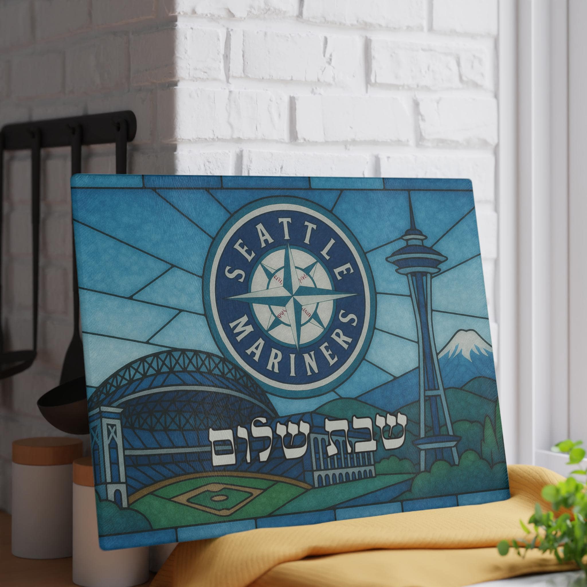 Featuring Mariners colors and a stained glass stadium-inspired design, this board makes a striking centerpiece for your Shabbat table. It is crafted from durable tempered glass that is both hygienic and heat-resistant, making it as practical as it is meaningful. Four non-slip rubber feet are included for added stability whether you are slicing challah or showcasing it as kitchen décor.