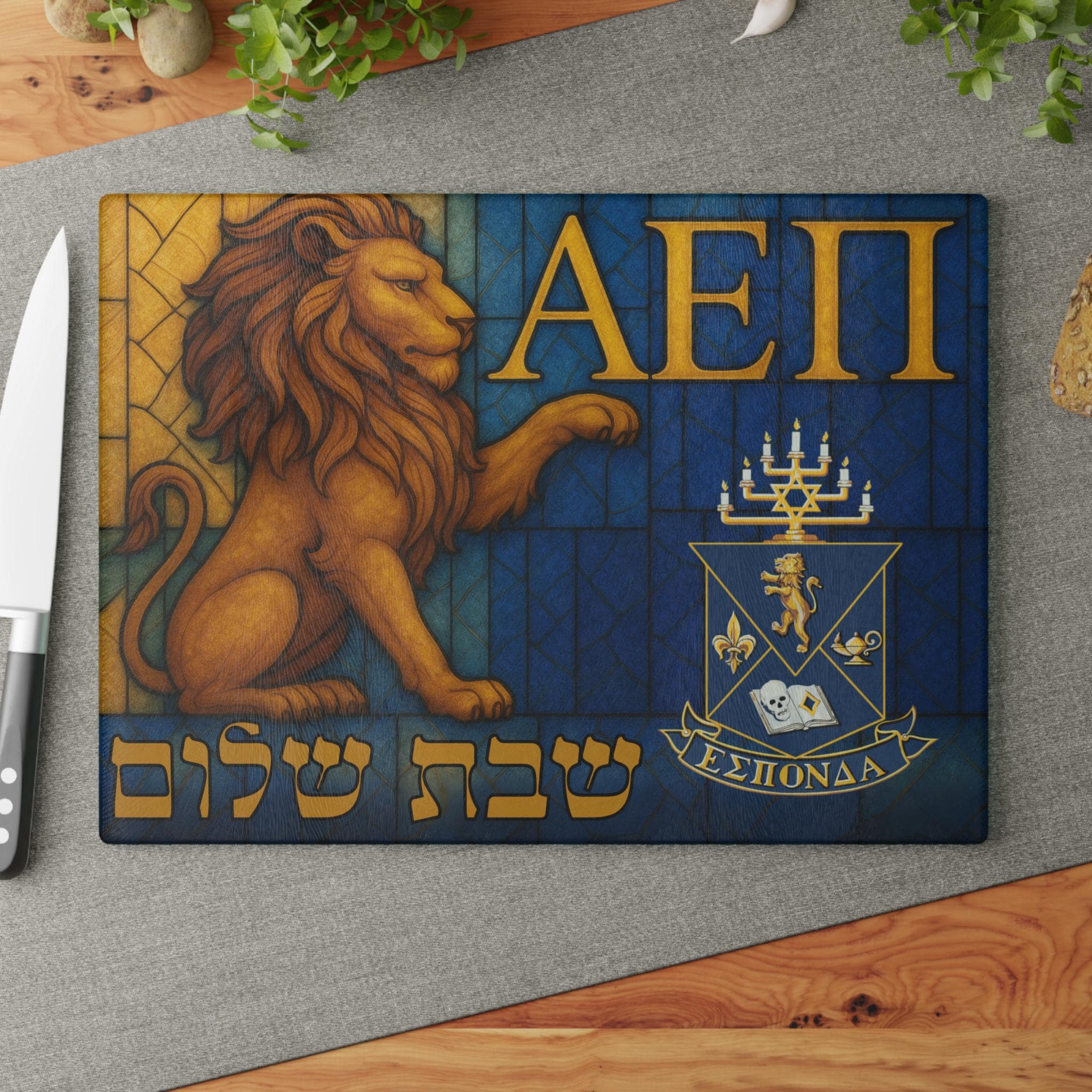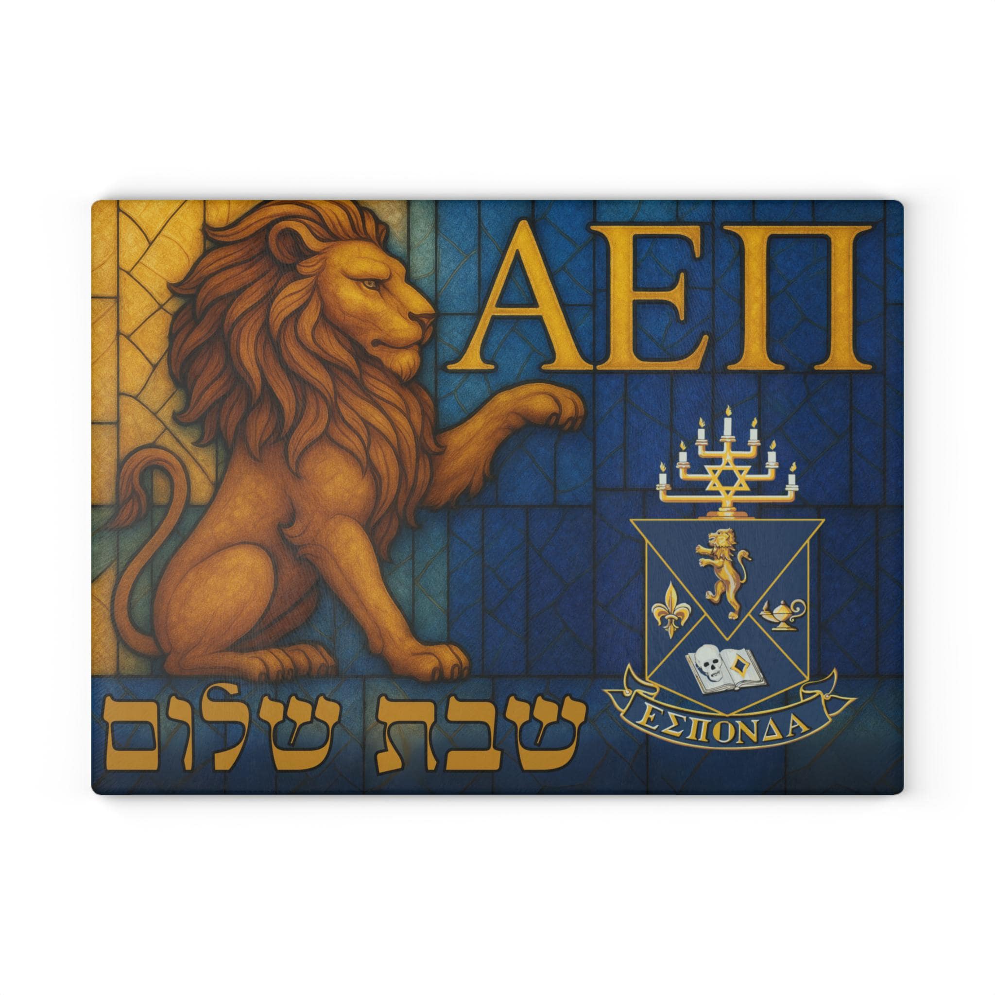 Celebrate Jewish fraternity pride with this AEPi stained glass–style challah board featuring a bold lion, the iconic fraternity crest, and official blue and gold colors. Designed to honor brotherhood and tradition, this 15×11 inch Shabbat glass tray blends fraternity spirit with meaningful Judaica artistry.