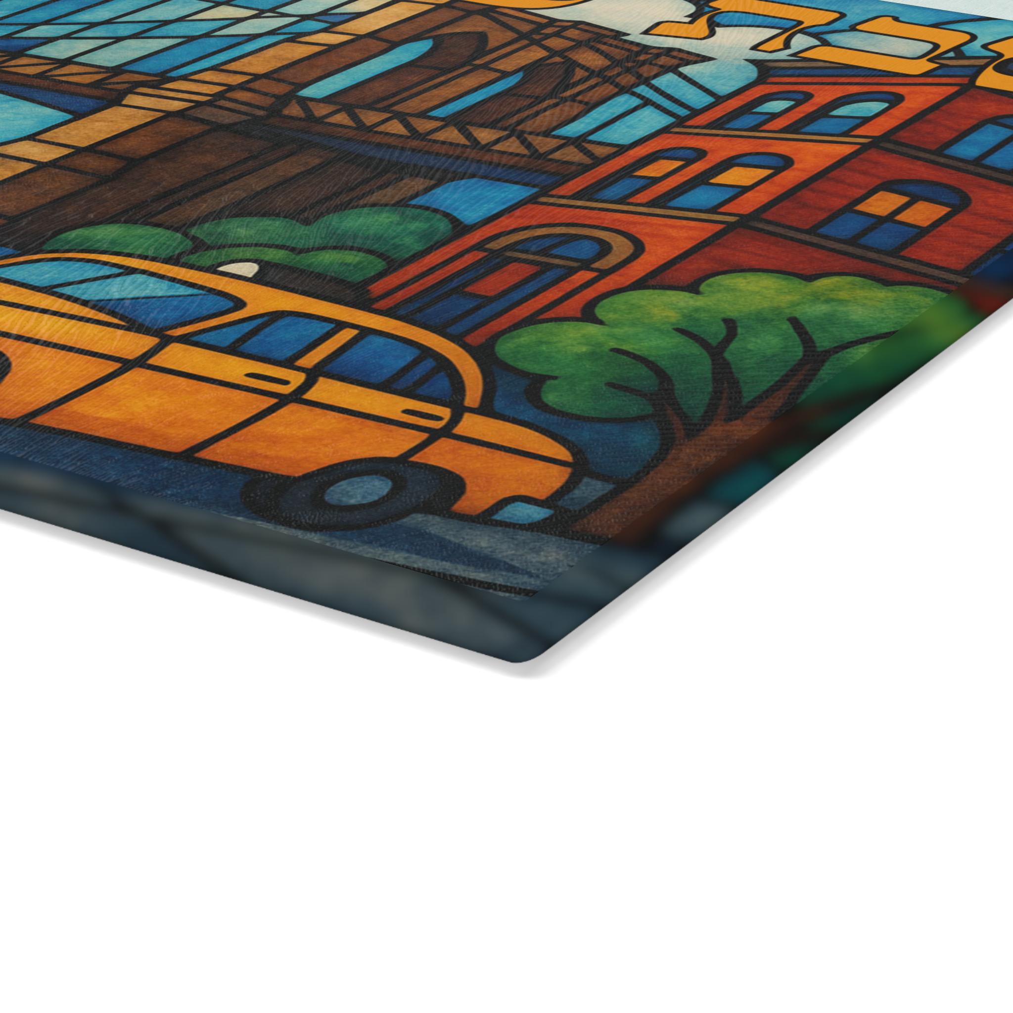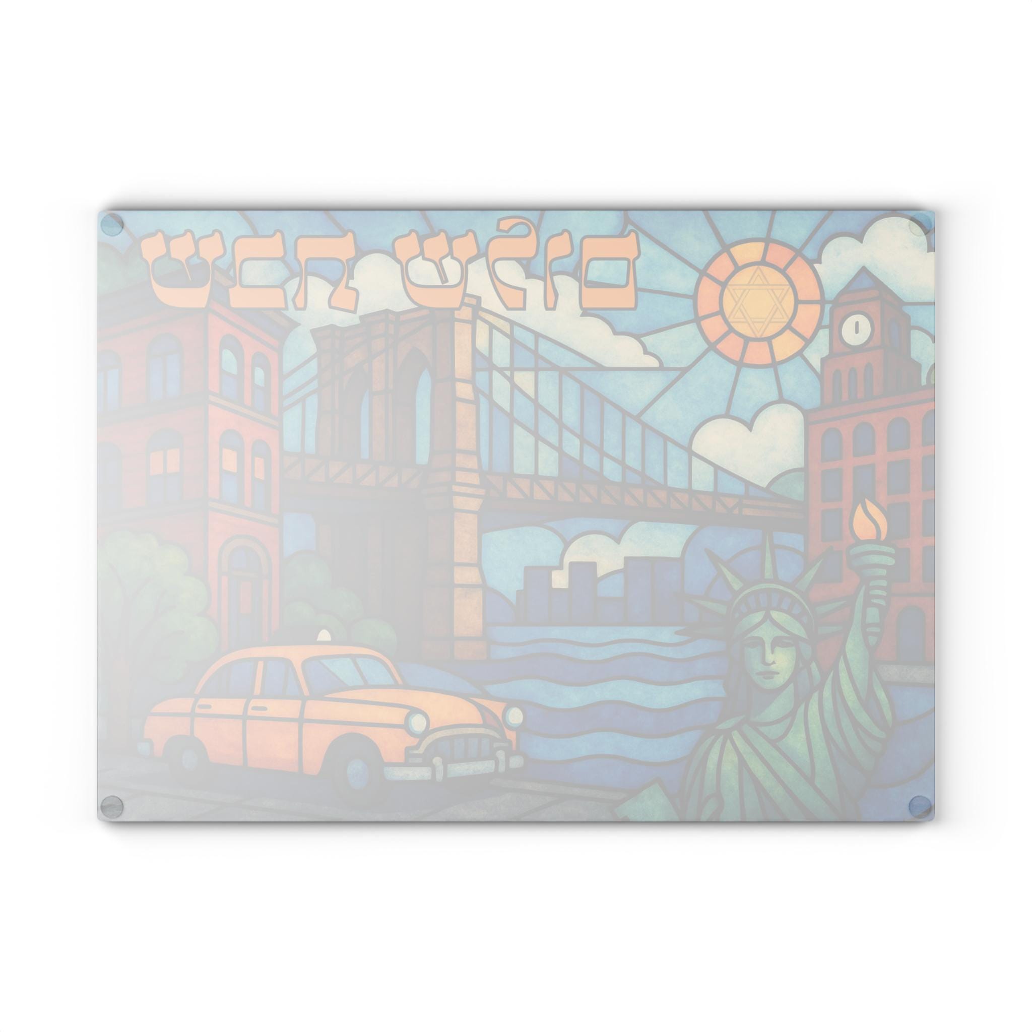 Brooklyn New York Challah Board crafted in stained glass style, featuring the Brooklyn Bridge, Statue of Liberty, and a classic yellow NYC taxi. This 15 × 11 inch tempered glass Shabbat tray brings iconic New York energy to your Jewish table.