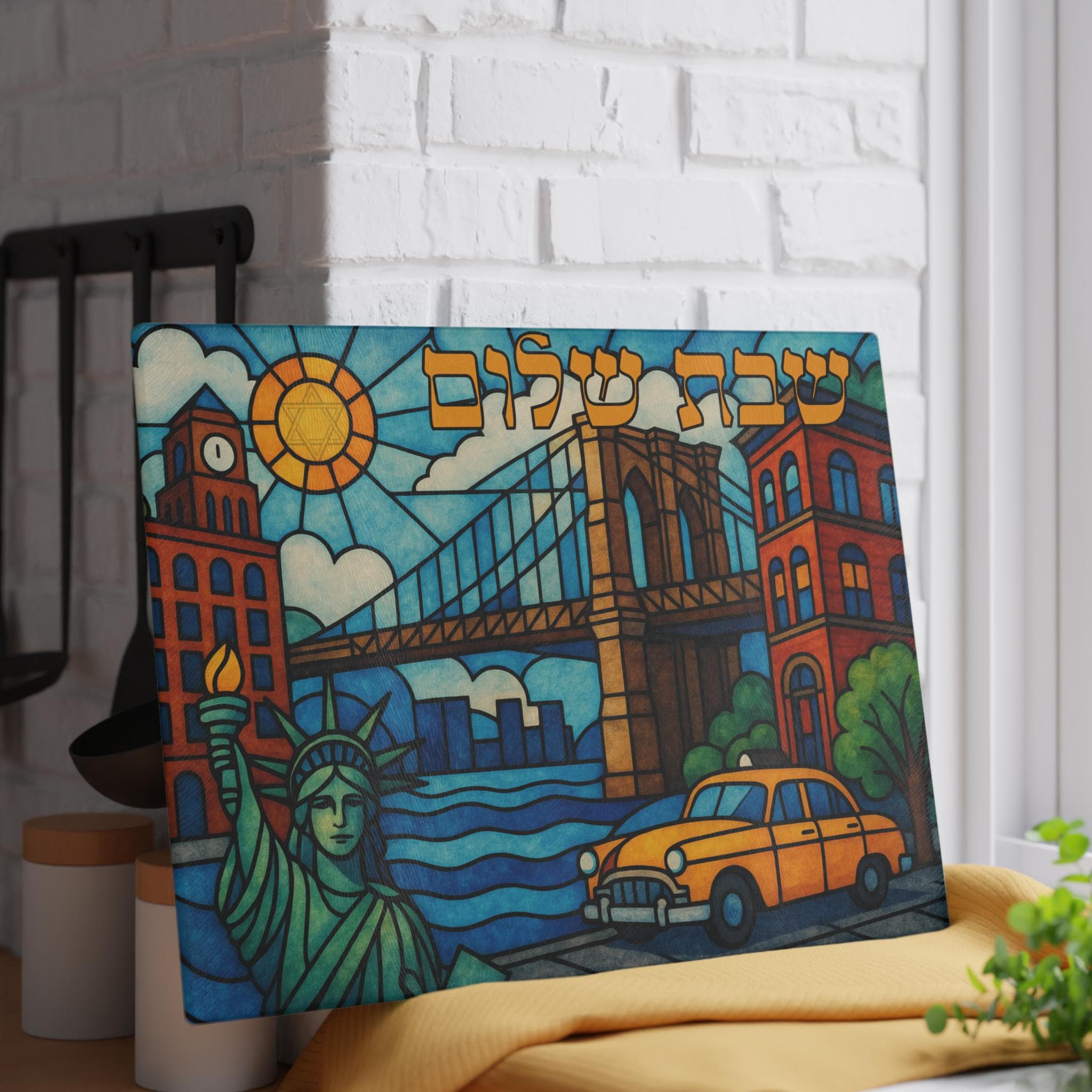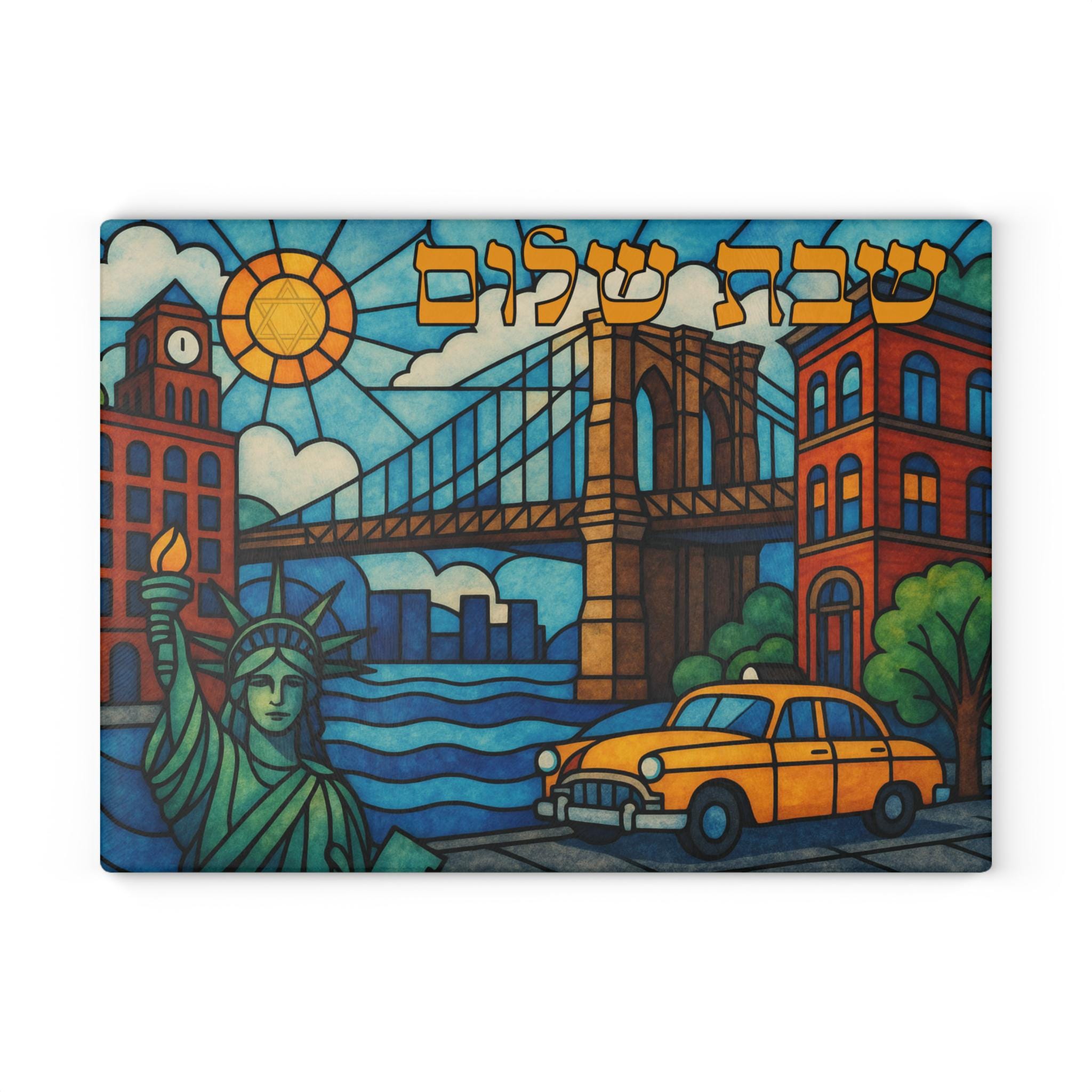 Designed for proud New Yorkers and families with Brooklyn roots, this challah board blends vibrant city culture with timeless Jewish tradition. The stained glass–inspired artwork creates a bold and artistic centerpiece that feels equally at home on your Shabbat table or displayed in your kitchen.