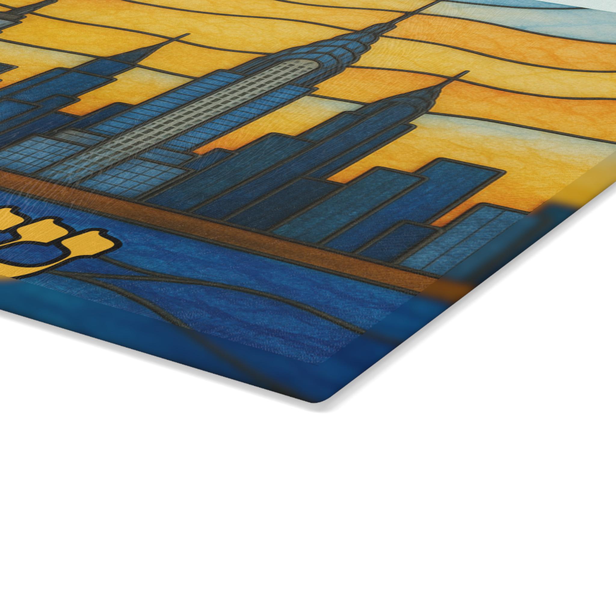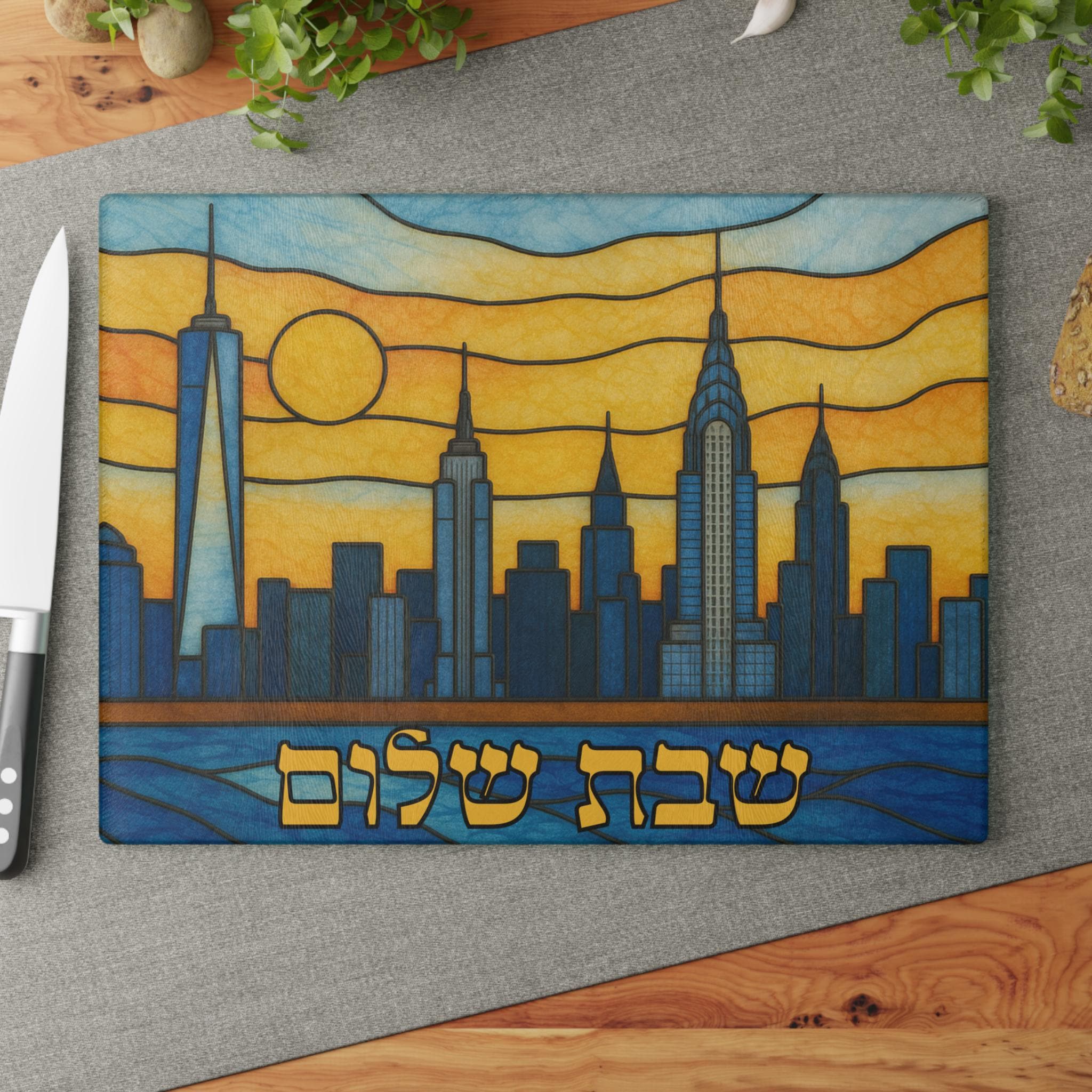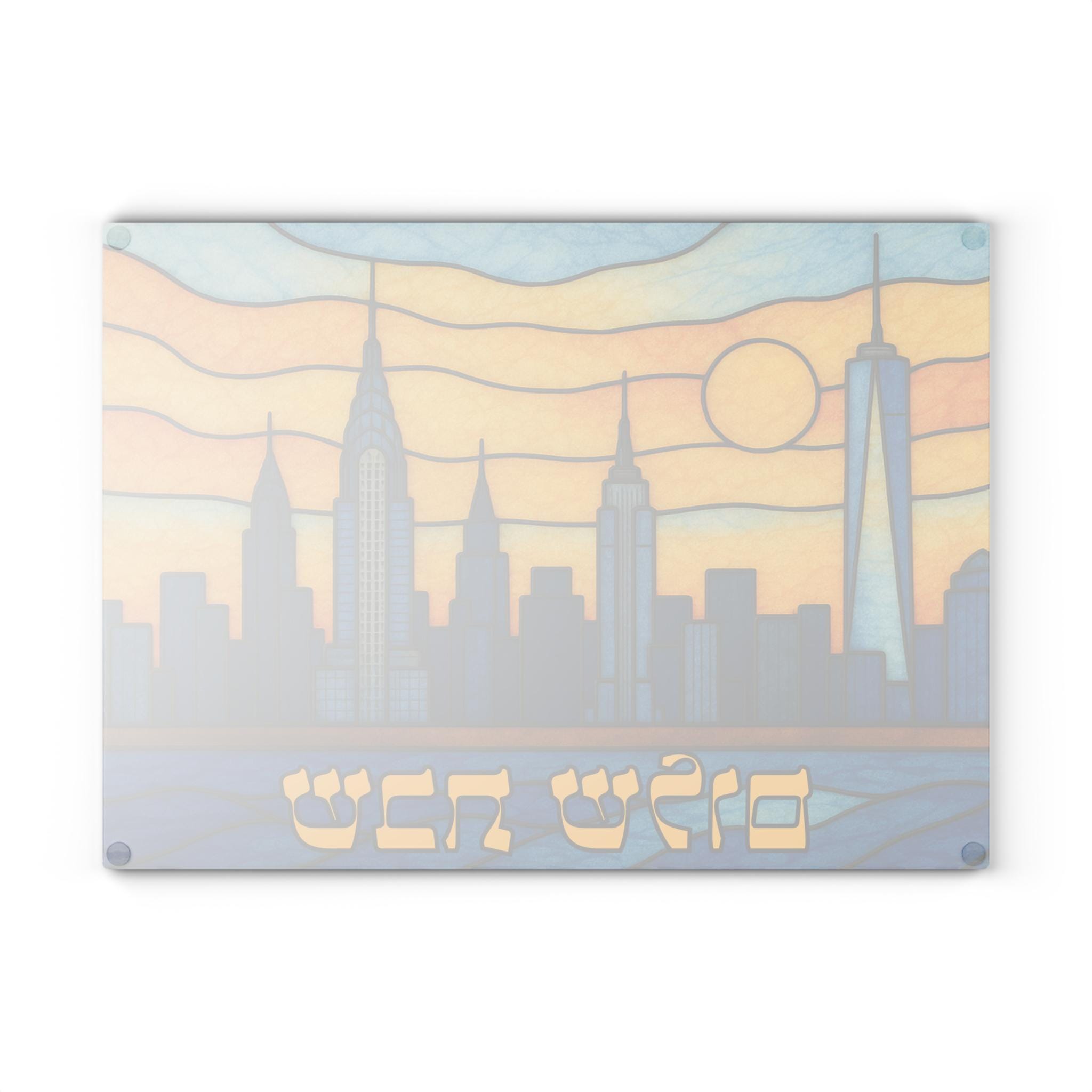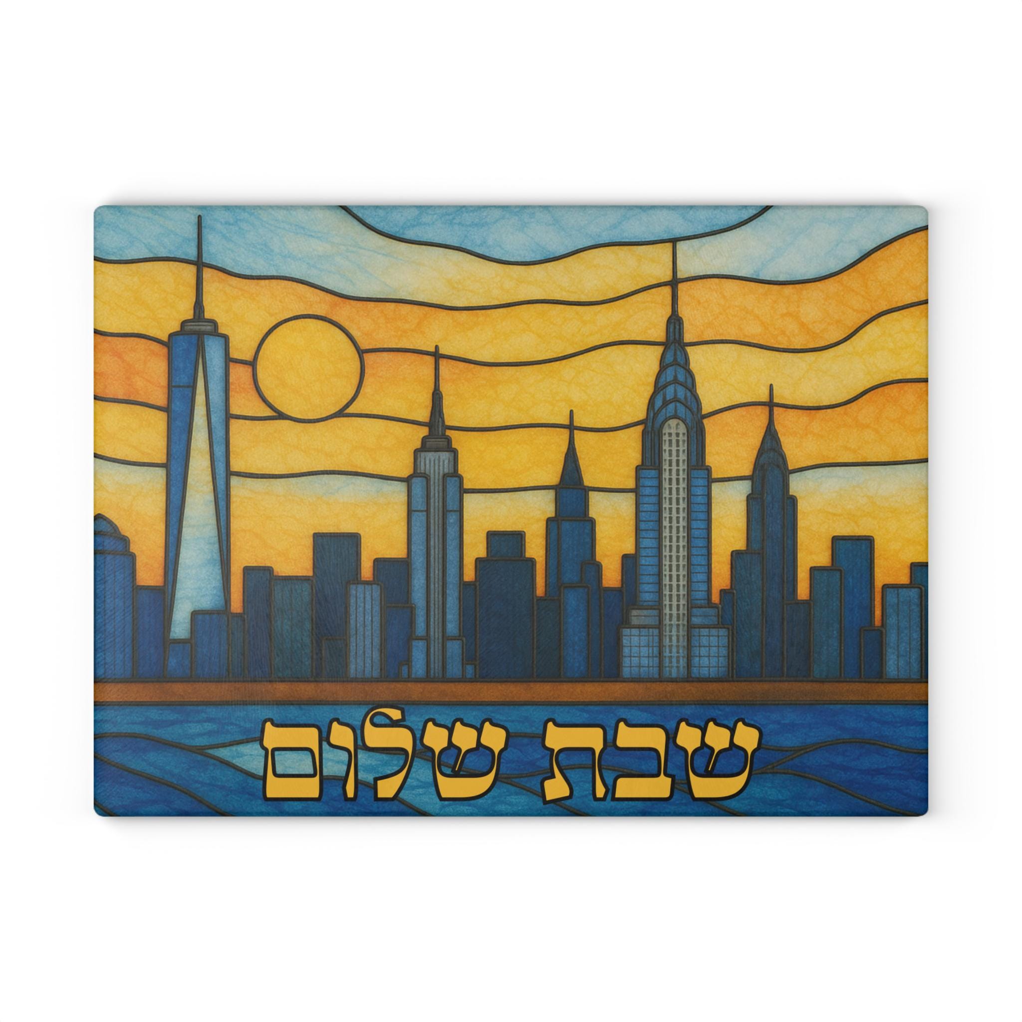 New York Skyline Challah Board designed for Shabbat tables that celebrate both Jewish tradition and Manhattan pride. This 15×11 tempered glass Shabbat tray features a stained glass–style New York cityscape with iconic skyline elements and the Statue of Liberty, creating a bold yet meaningful Judaica centerpiece.