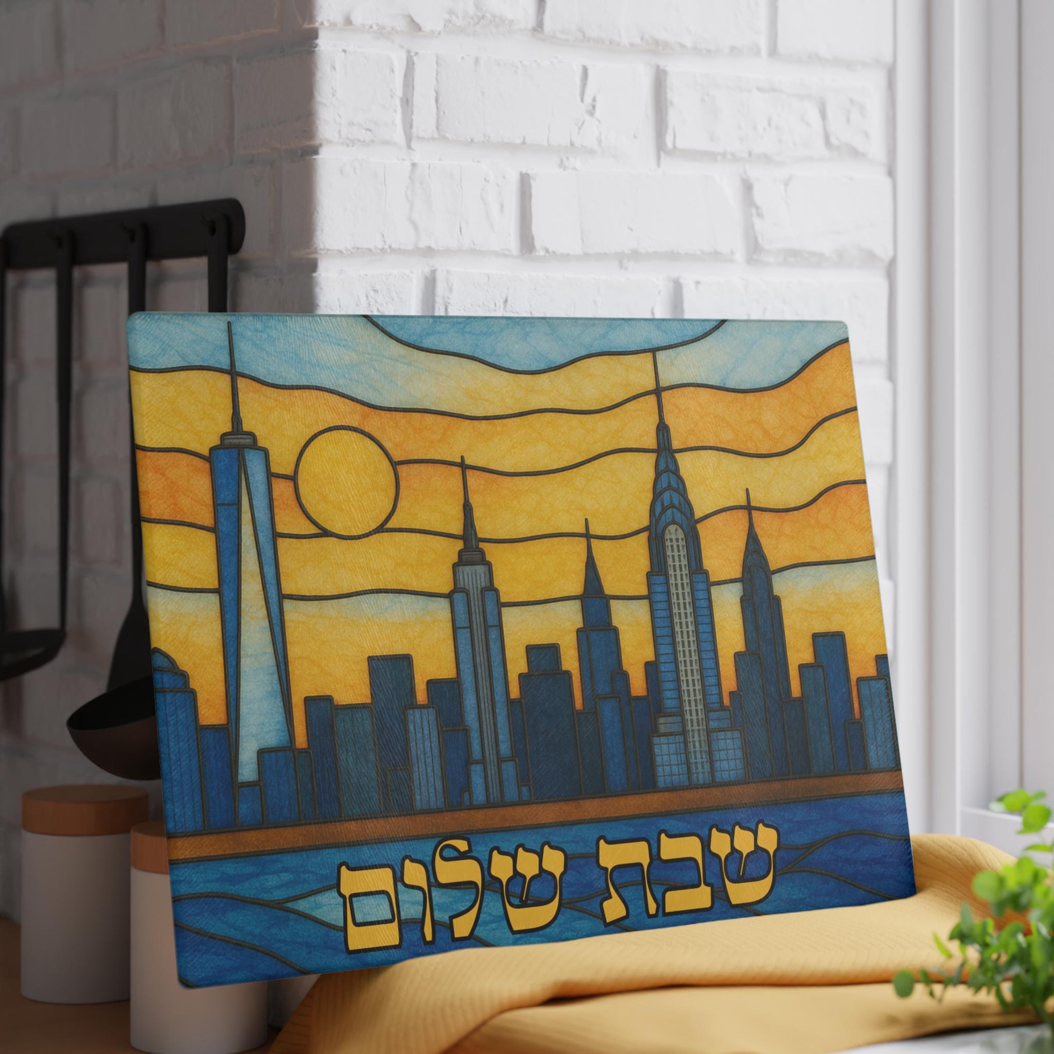 Crafted from durable, hygienic tempered glass, this challah board is as functional as it is artistic. The vibrant stained glass design captures the energy of New York while honoring the elegance of Shabbat rituals. Whether you are slicing challah or displaying it on your countertop, it brings warmth, heritage, and city spirit into your home.
