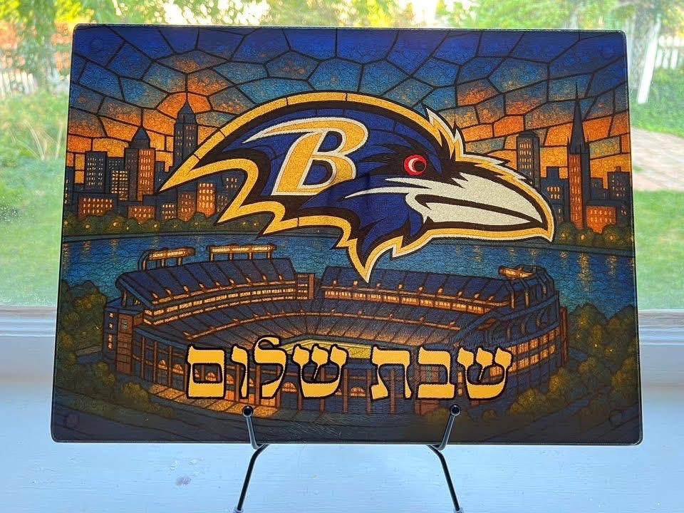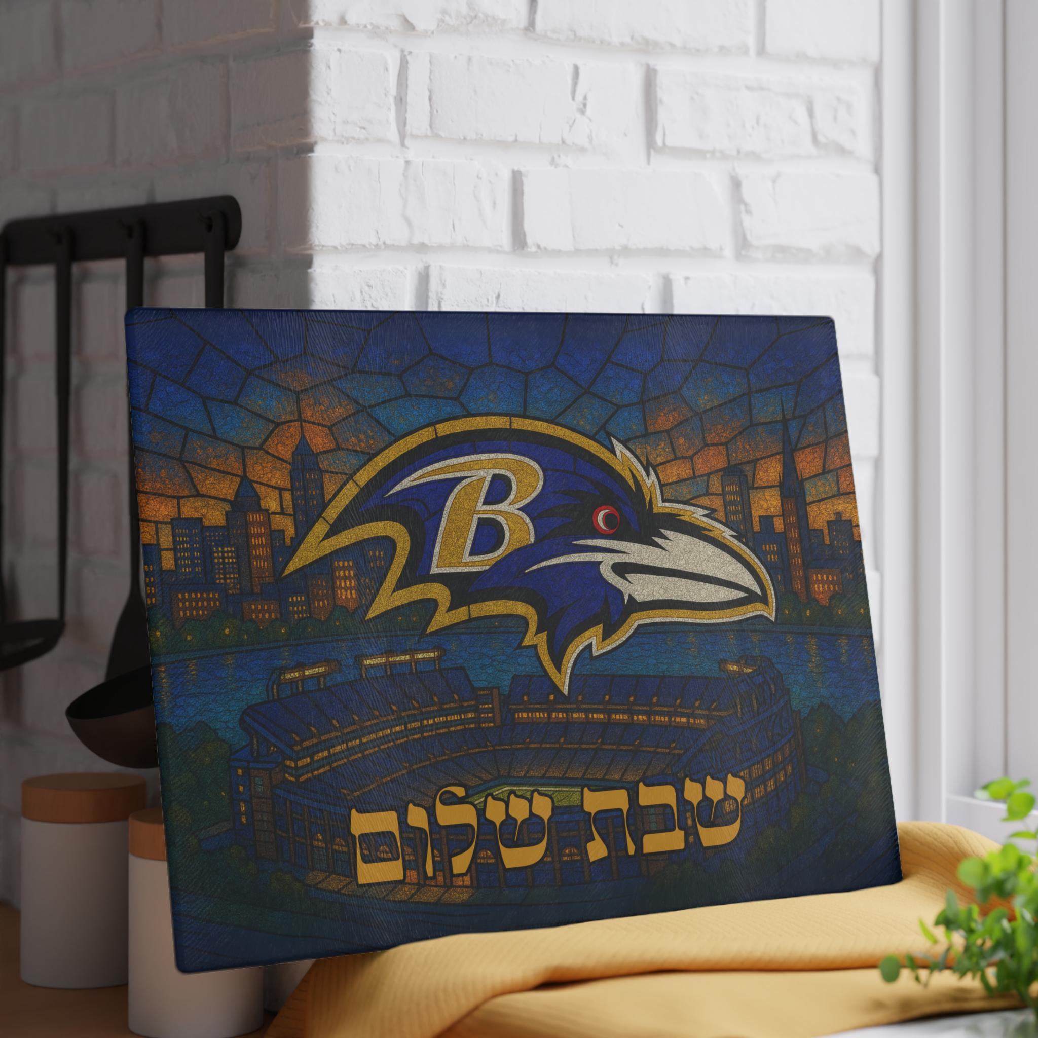 Baltimore Ravens Challah Board in stained glass style, designed for Jewish football fans who want to bring team pride to their Shabbat table. This 15 × 11 inch tempered glass board blends Ravens spirit with timeless Jewish tradition in one bold centerpiece.