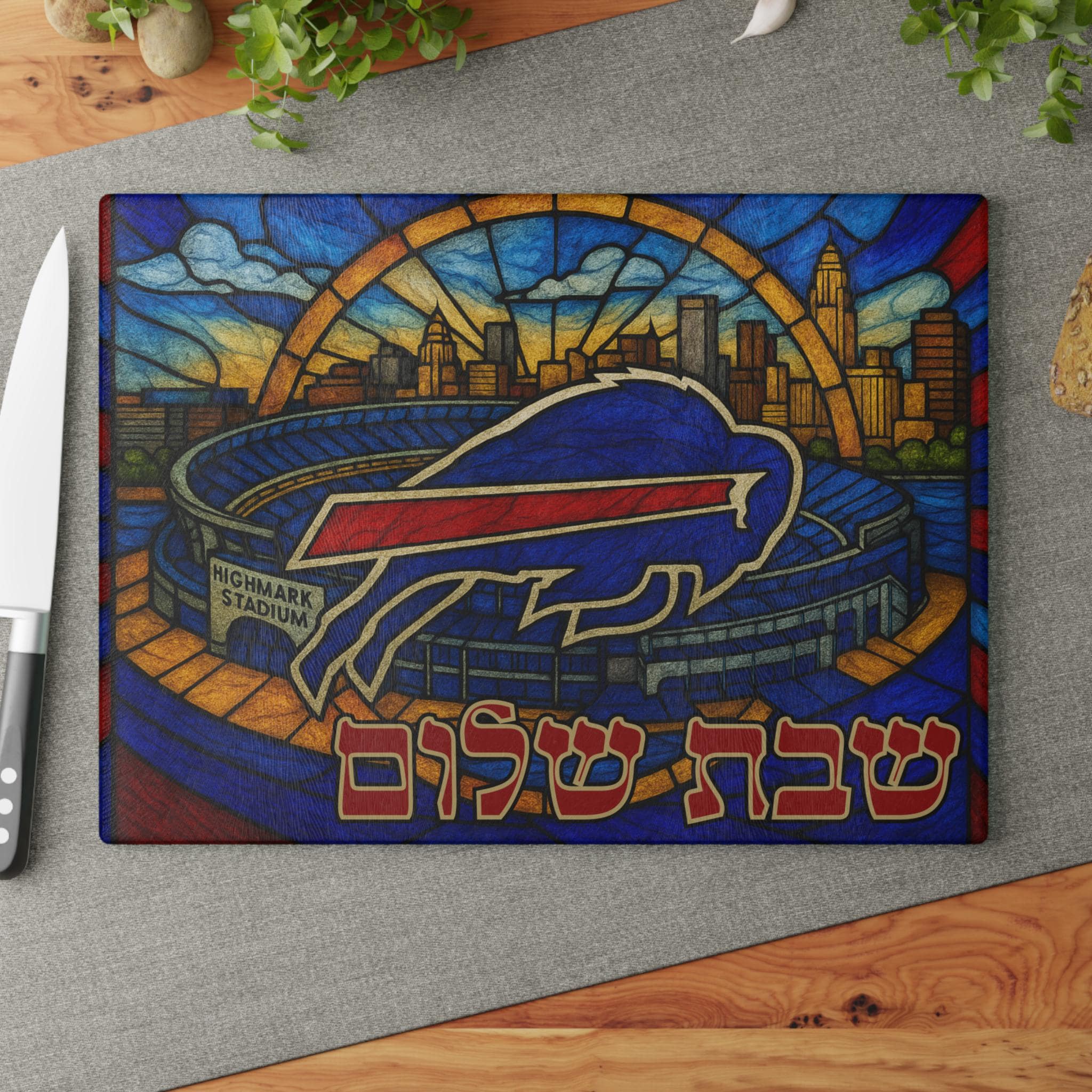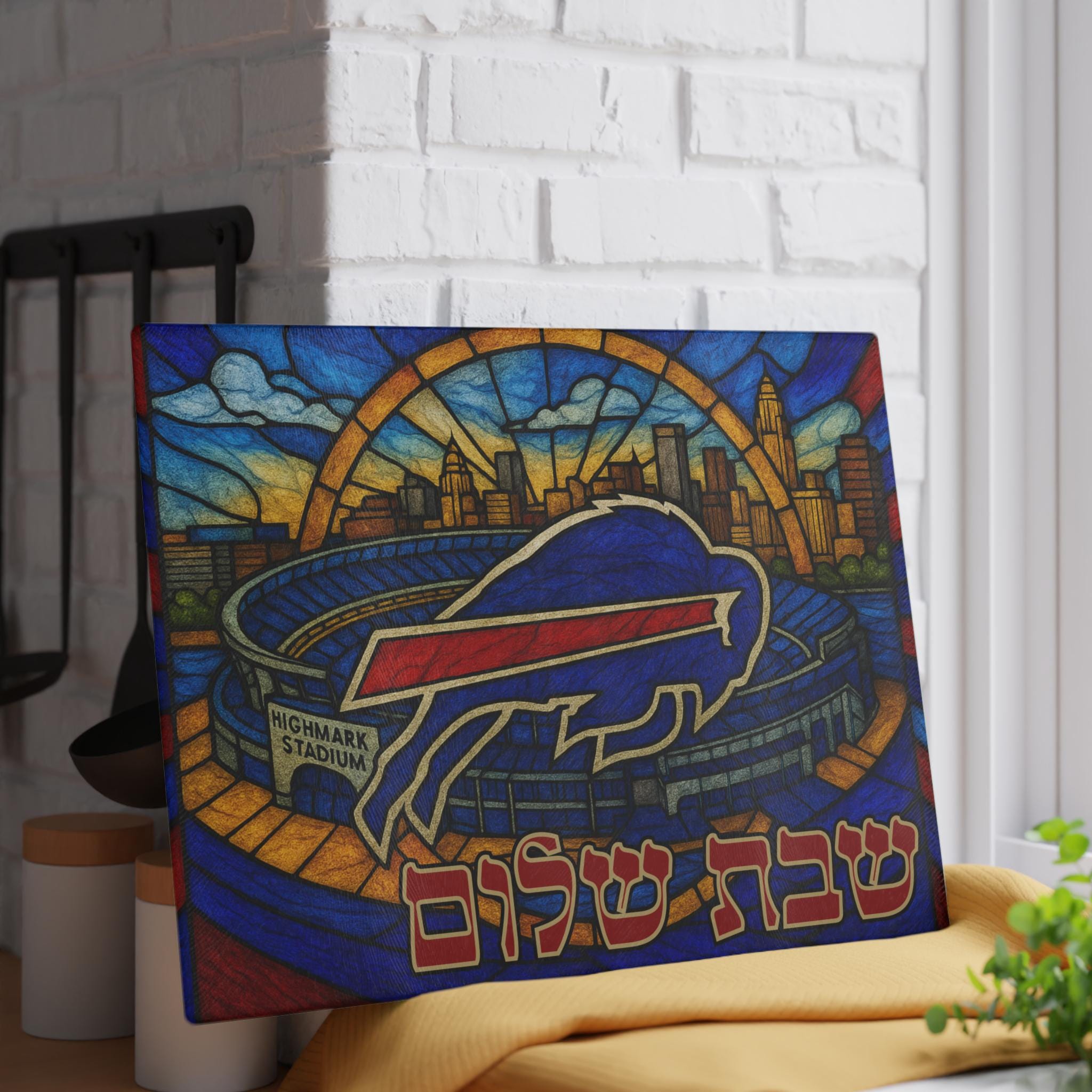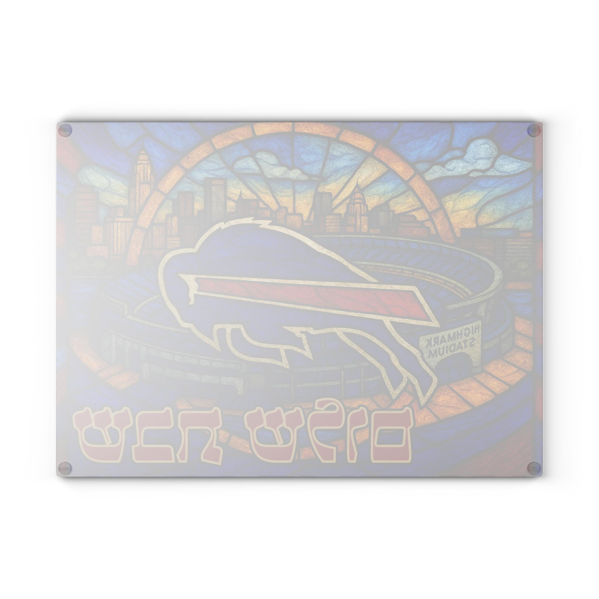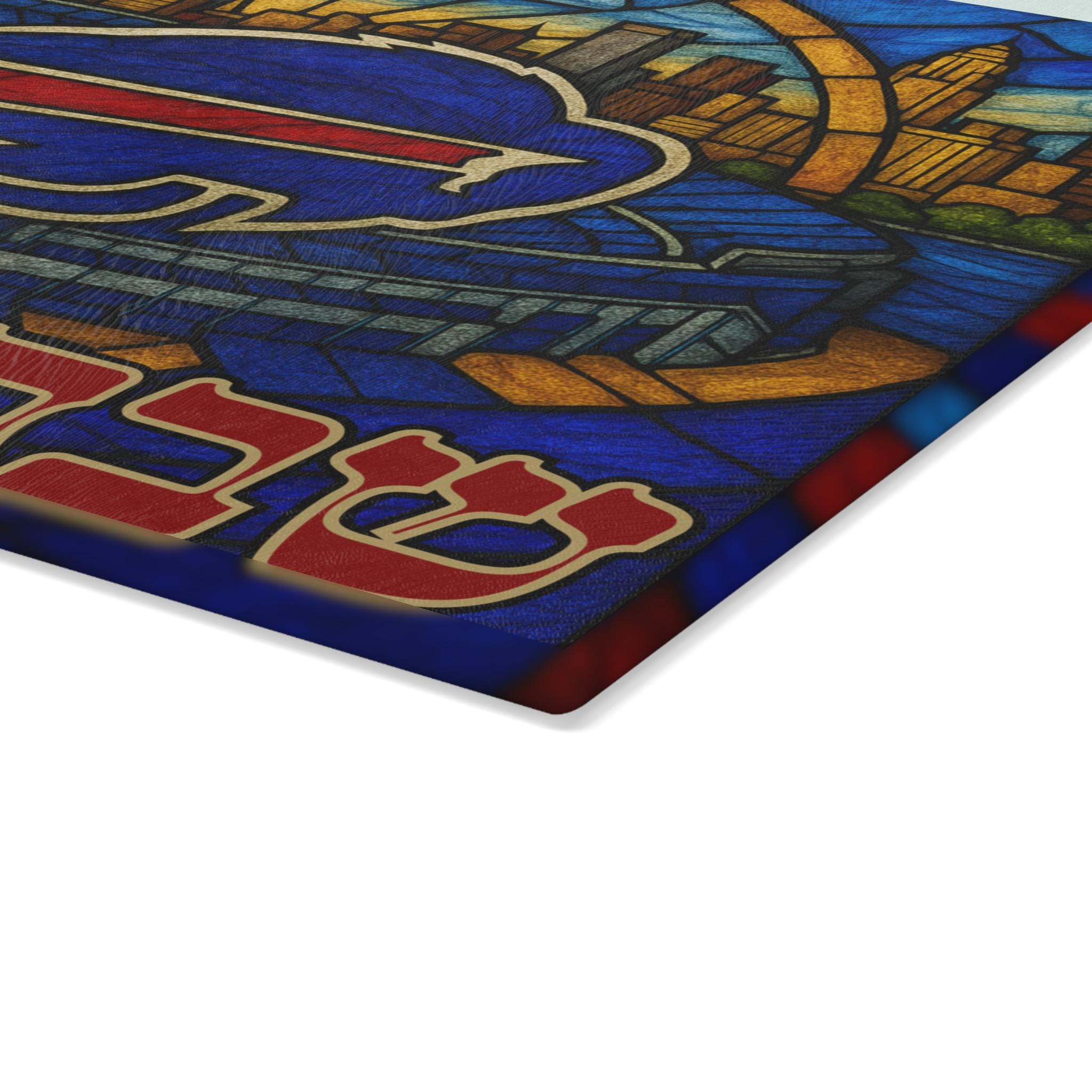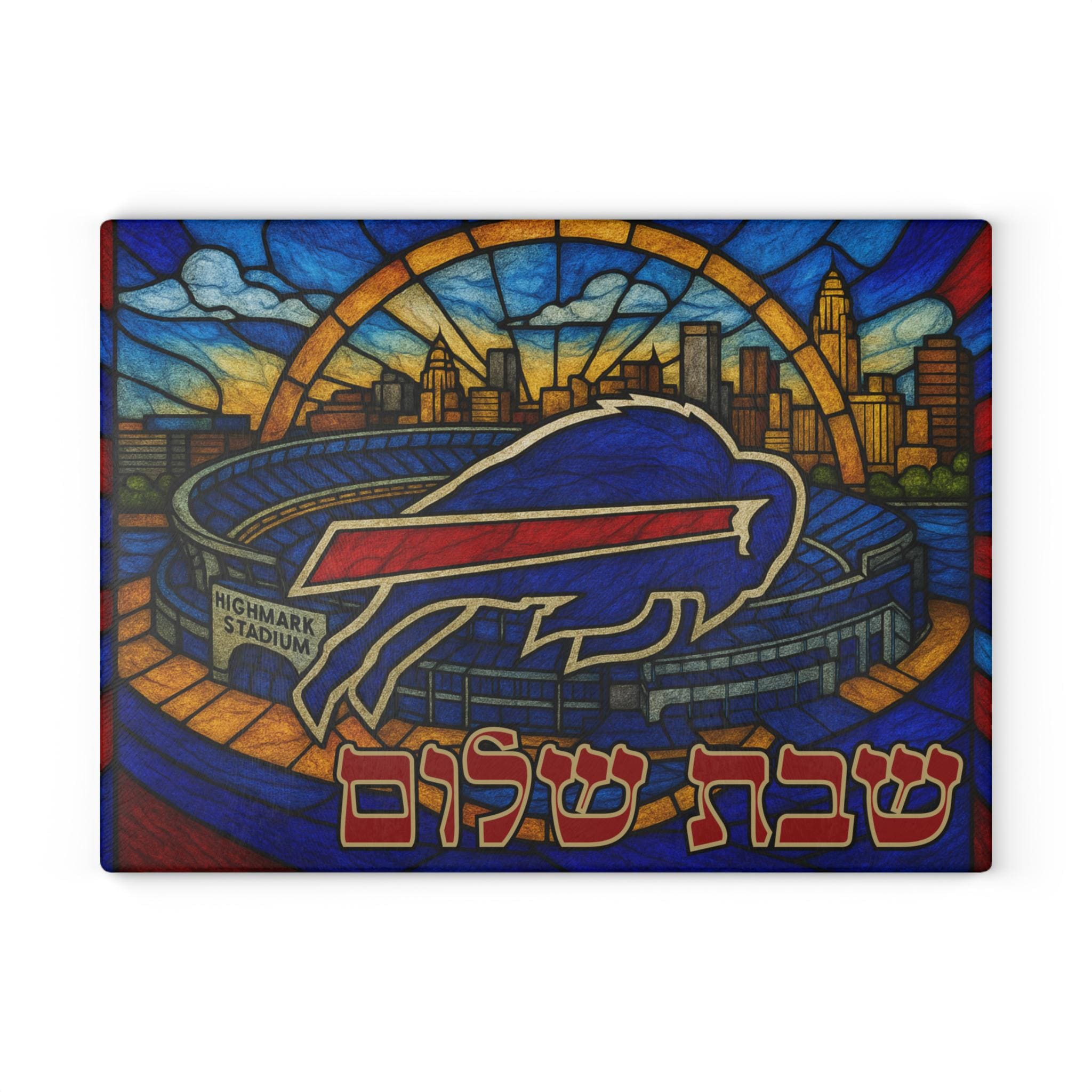 Celebrate Buffalo Bills pride and Jewish tradition with this glass challah board featuring the team logo, stadium, and Buffalo, New York skyline in a bold, vibrant design. Perfect for fans who want to bring hometown spirit to their Shabbat table or game day gatherings.