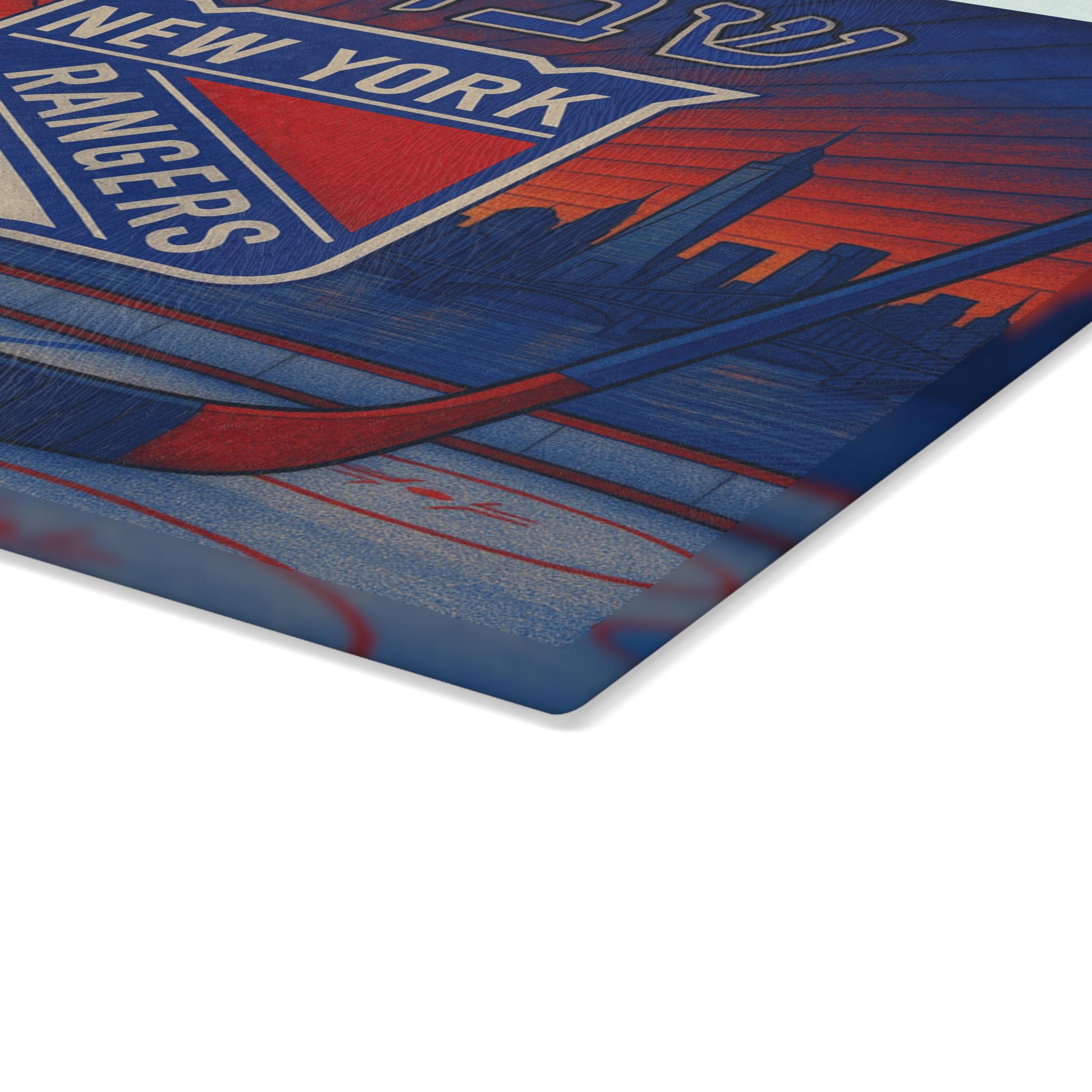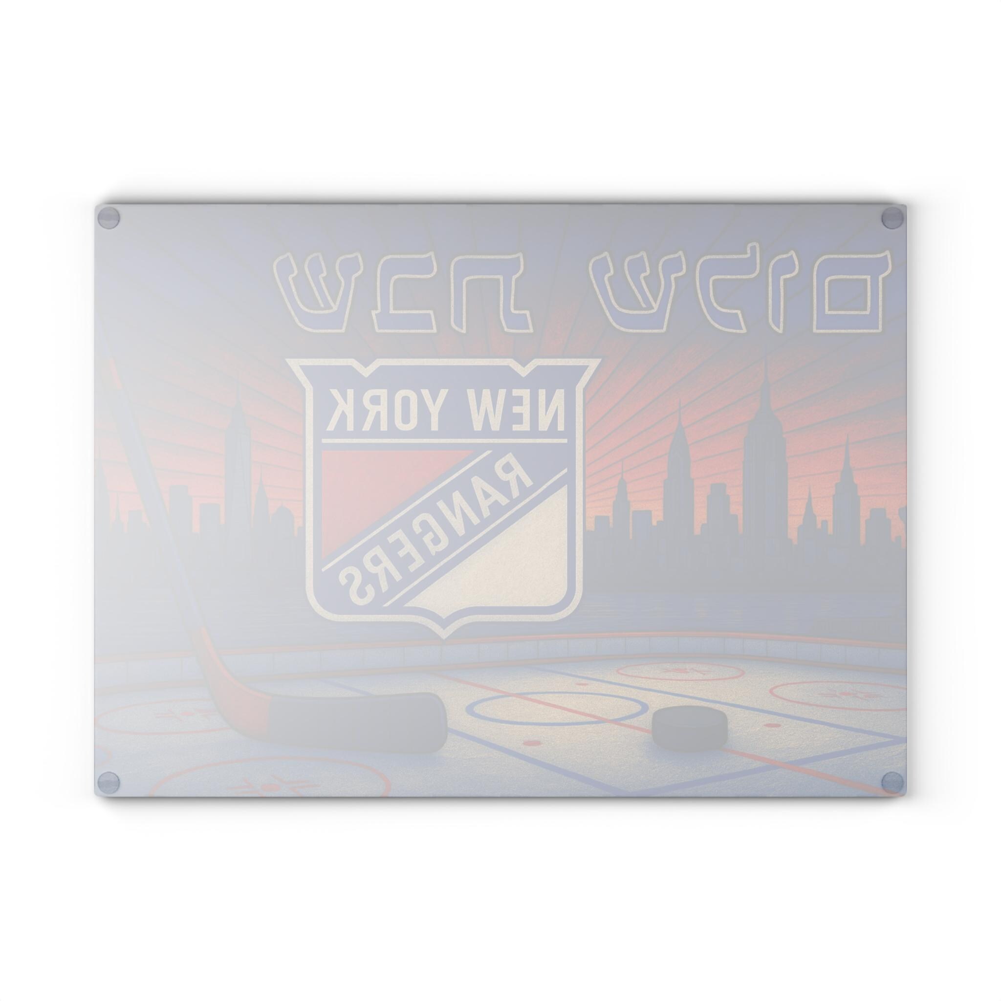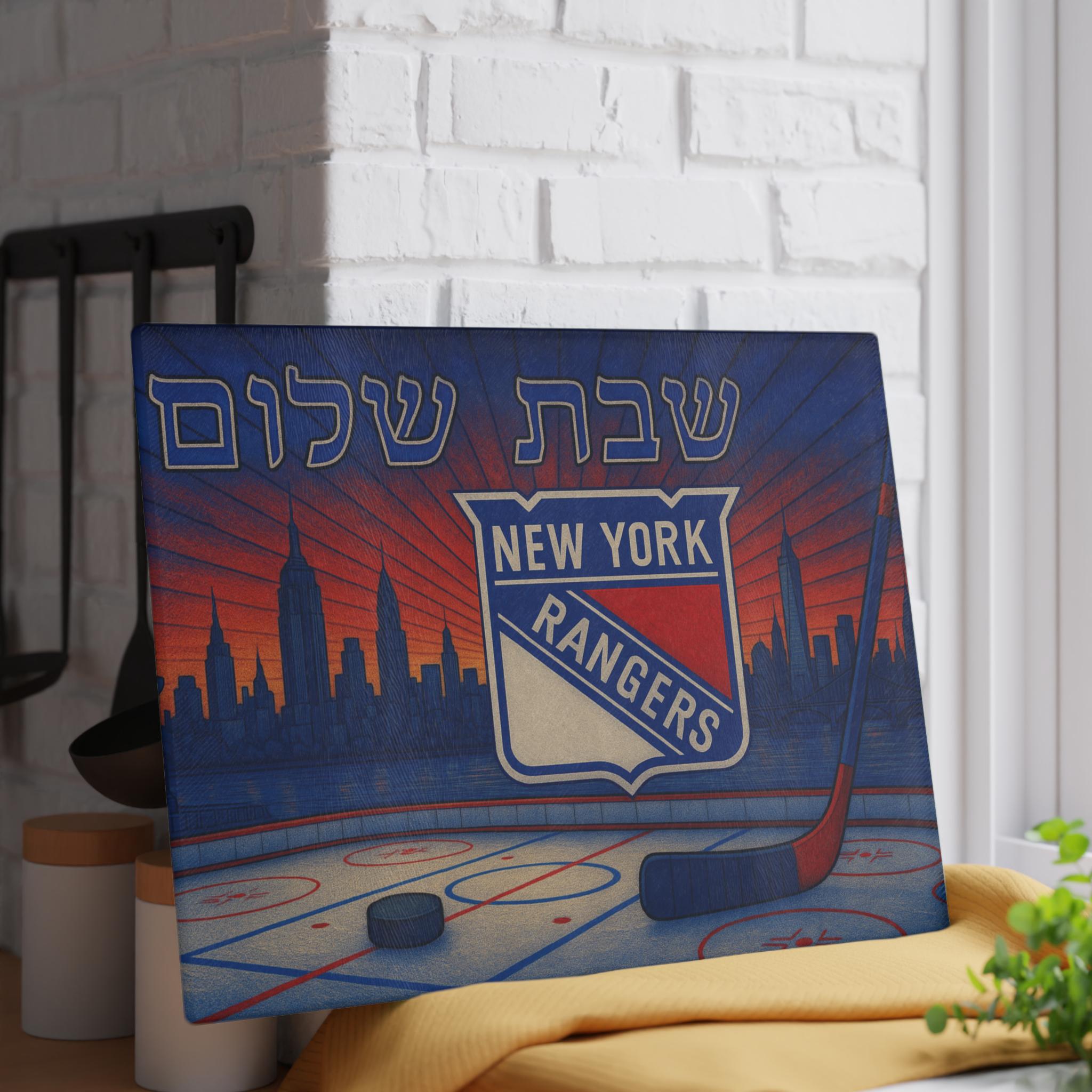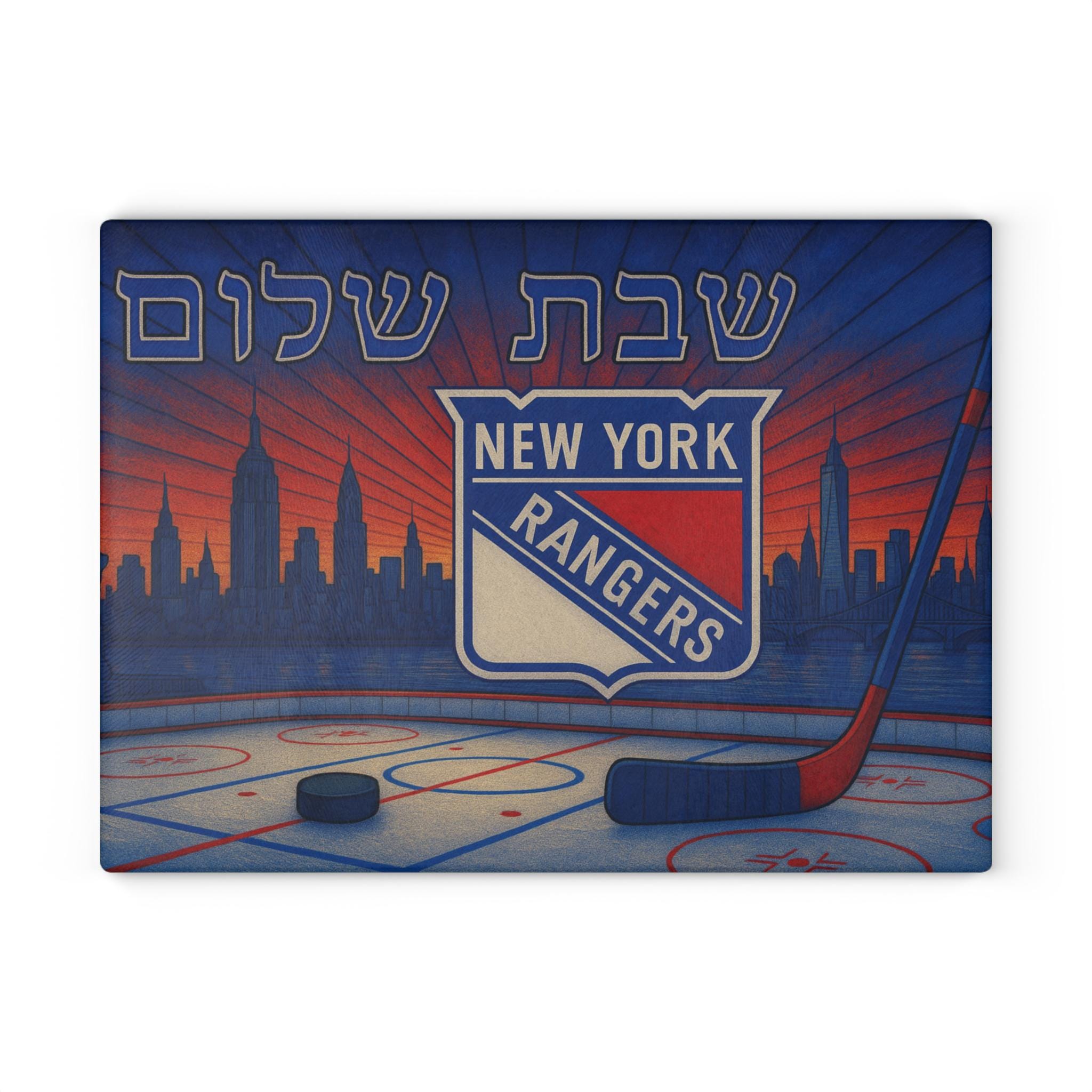Celebrate your New York Rangers pride and Jewish tradition with this stained glass–style challah board featuring the Rangers logo, a hockey rink, and the iconic New York City skyline. Designed for passionate fans, this 15×11 inch Shabbat glass tray brings together hockey energy and timeless Judaica artistry.