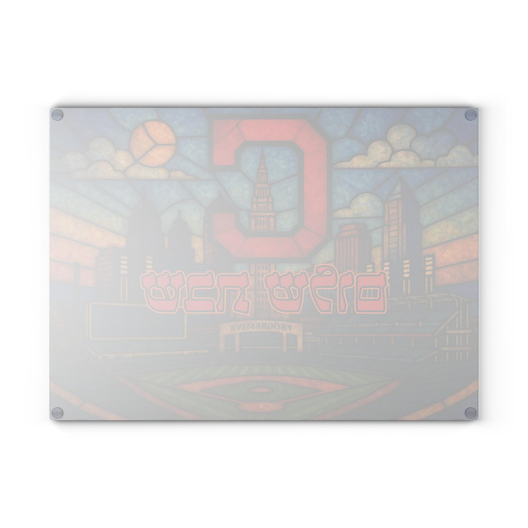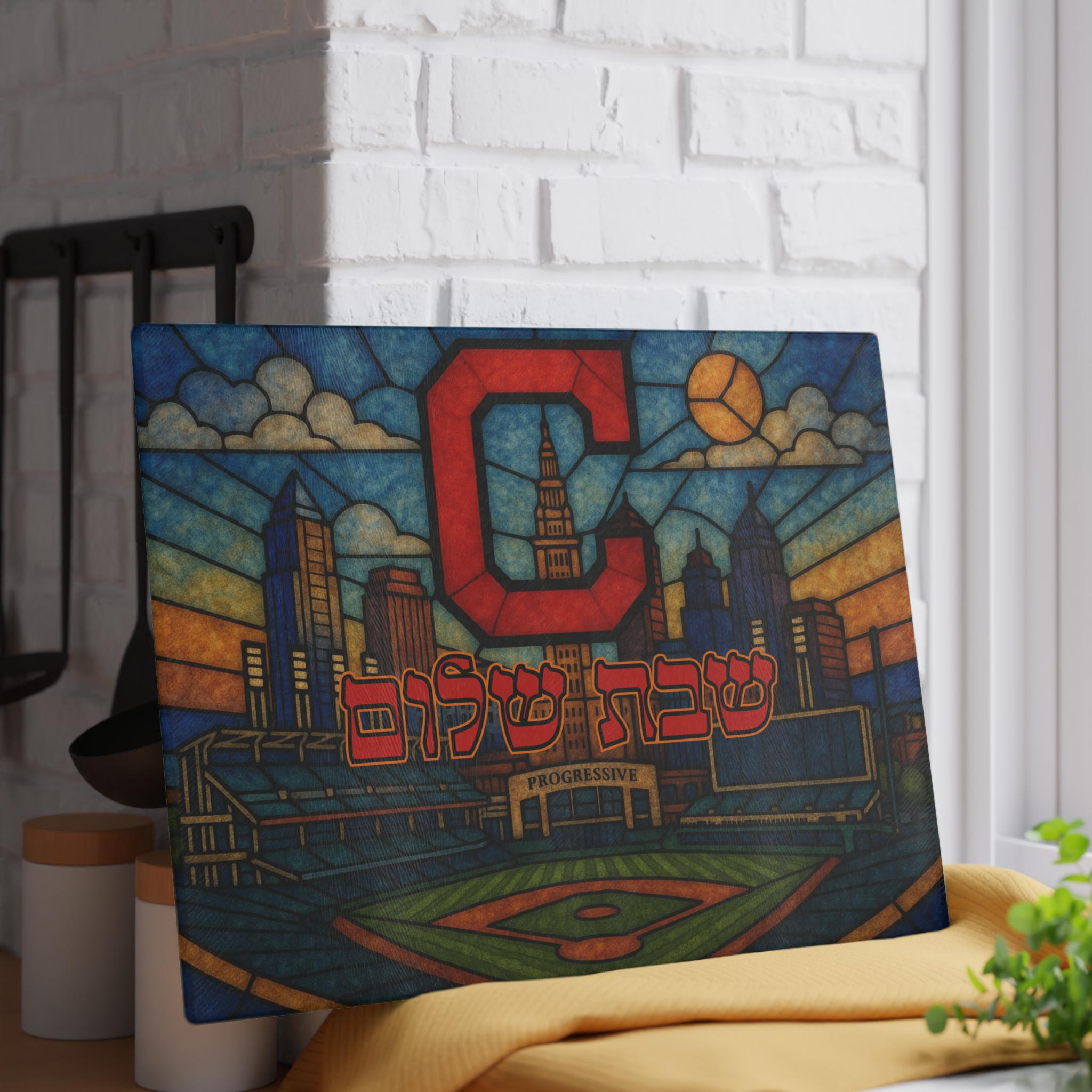 Celebrate Cleveland Guardians pride and Jewish tradition with this stained glass–style challah board featuring the Guardians logo, Progressive Field, and the Cleveland skyline. Designed for Jewish baseball fans, this 15×11 inch Shabbat glass tray brings together team loyalty and meaningful Judaica artistry.