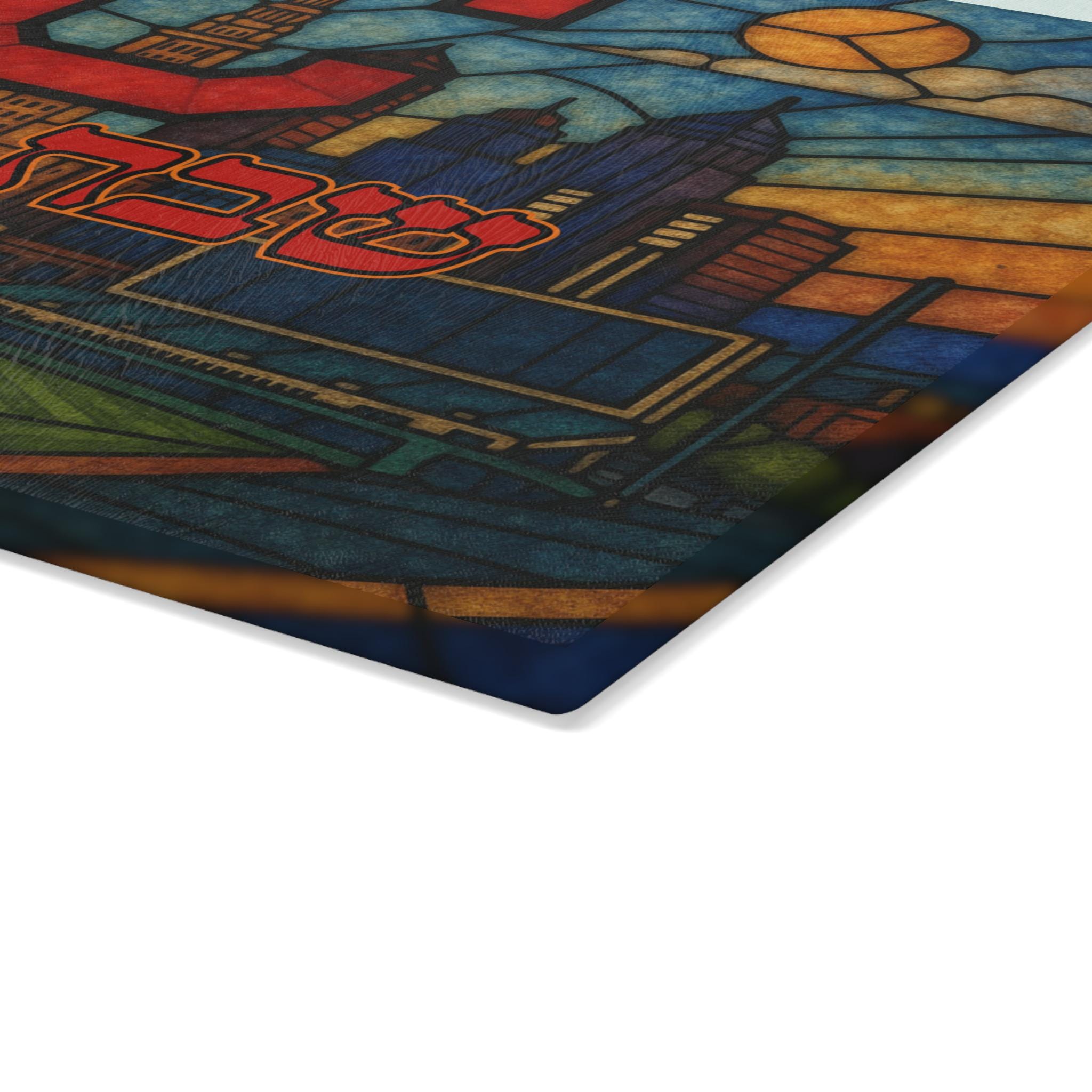 Crafted from durable tempered glass, the surface is hygienic and heat-resistant, making it ideal for slicing challah at weekly Shabbat dinners and holiday gatherings. The vibrant stained glass design creates a bold centerpiece for your table, while four non-slip rubber feet provide stability on your countertop or dining surface.