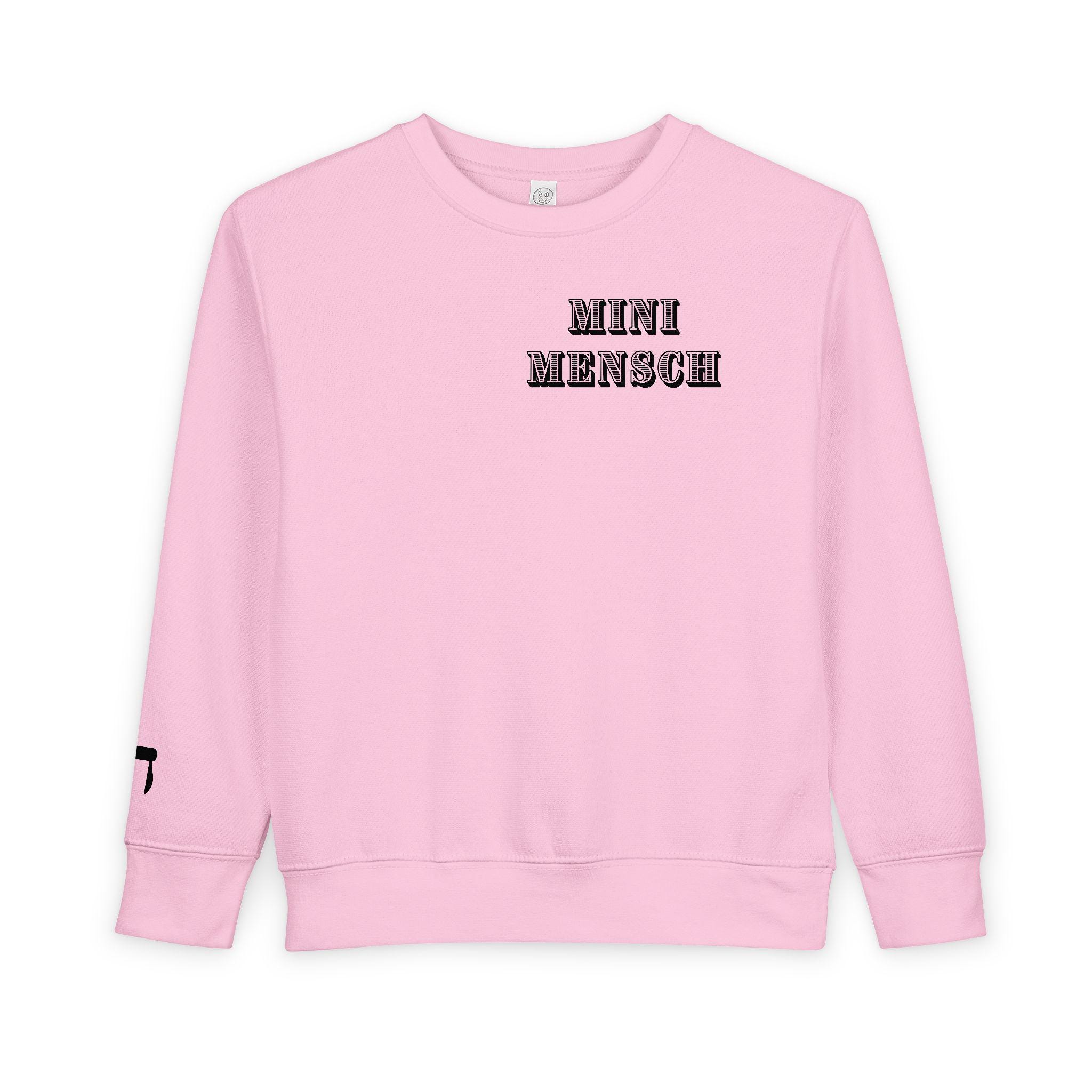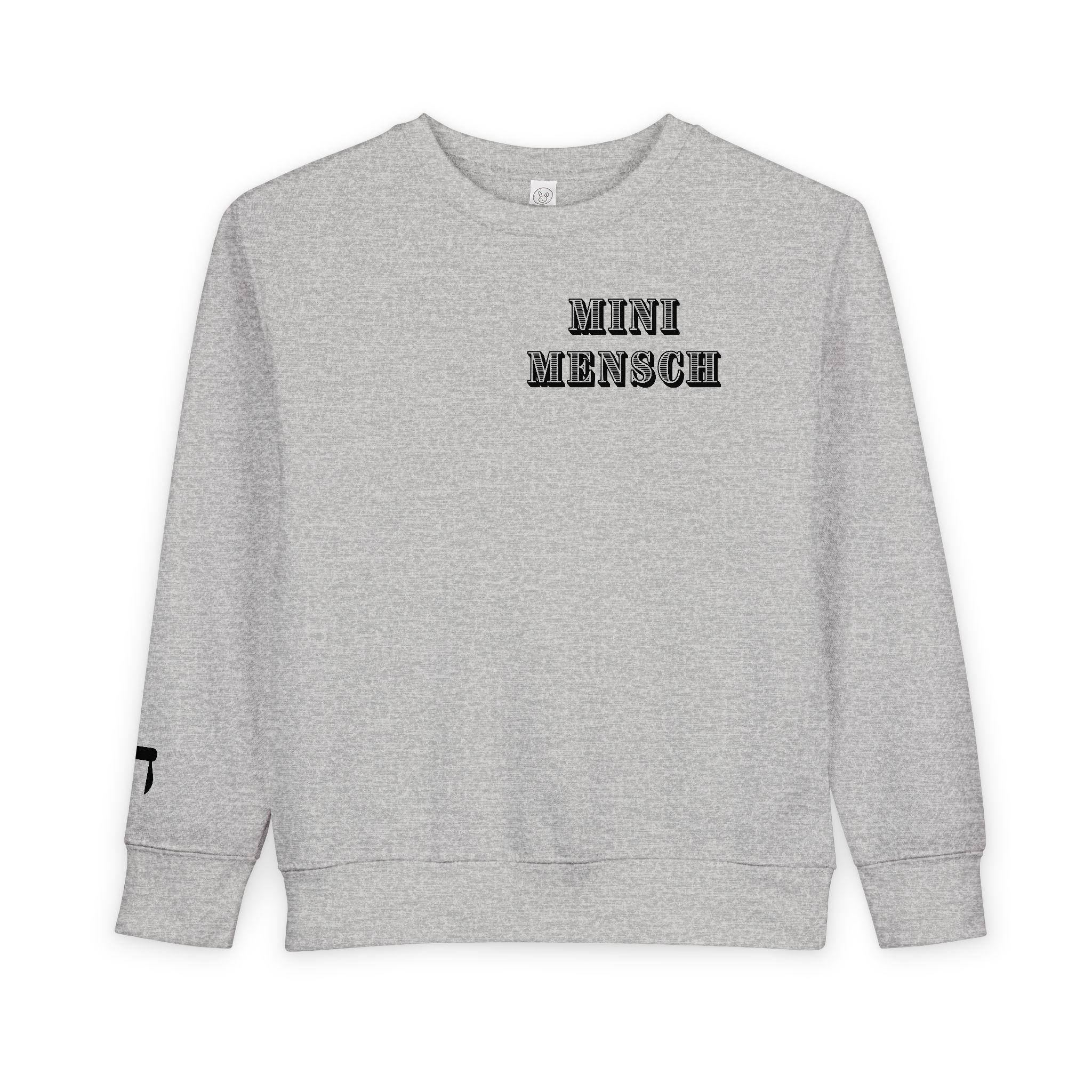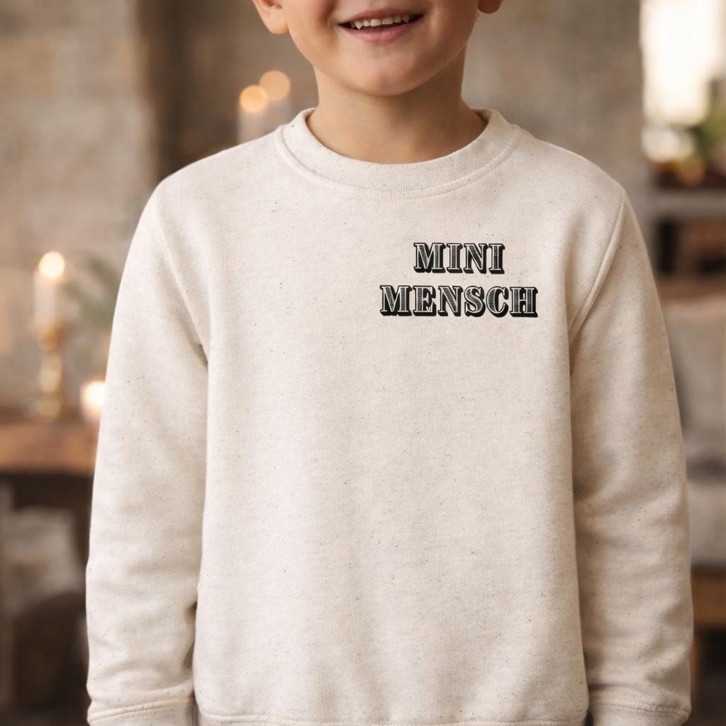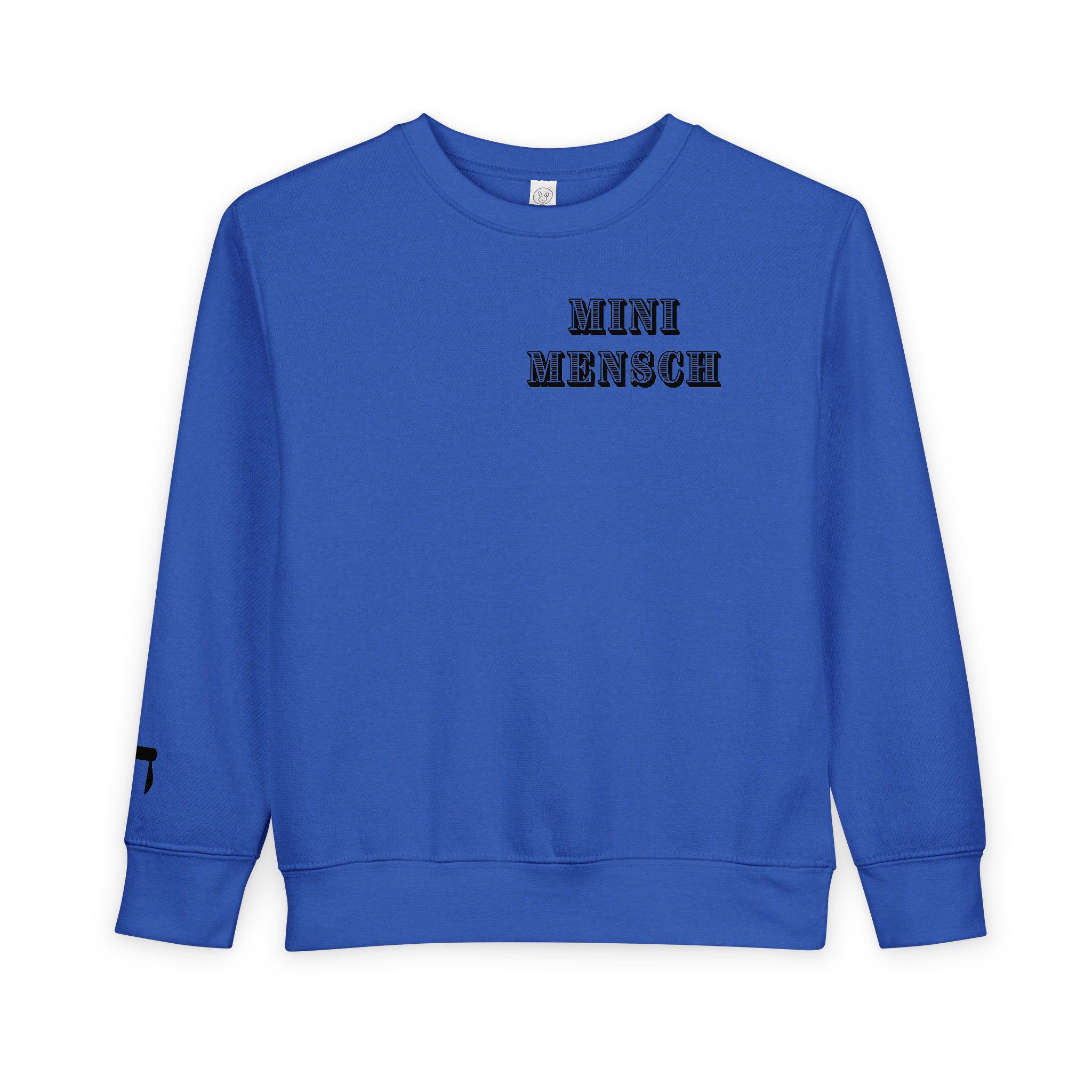 A cute toddler sweatshirt with 'mini Mensch' printed on the front and a 'chai' Hebrew symbol on the right arm sleeve. Perfect for young children to stay cozy and stylish, this sweatshirt is ideal for little ones celebrating Jewish holidays or for families who want to embrace their heritage.