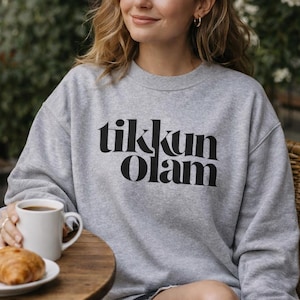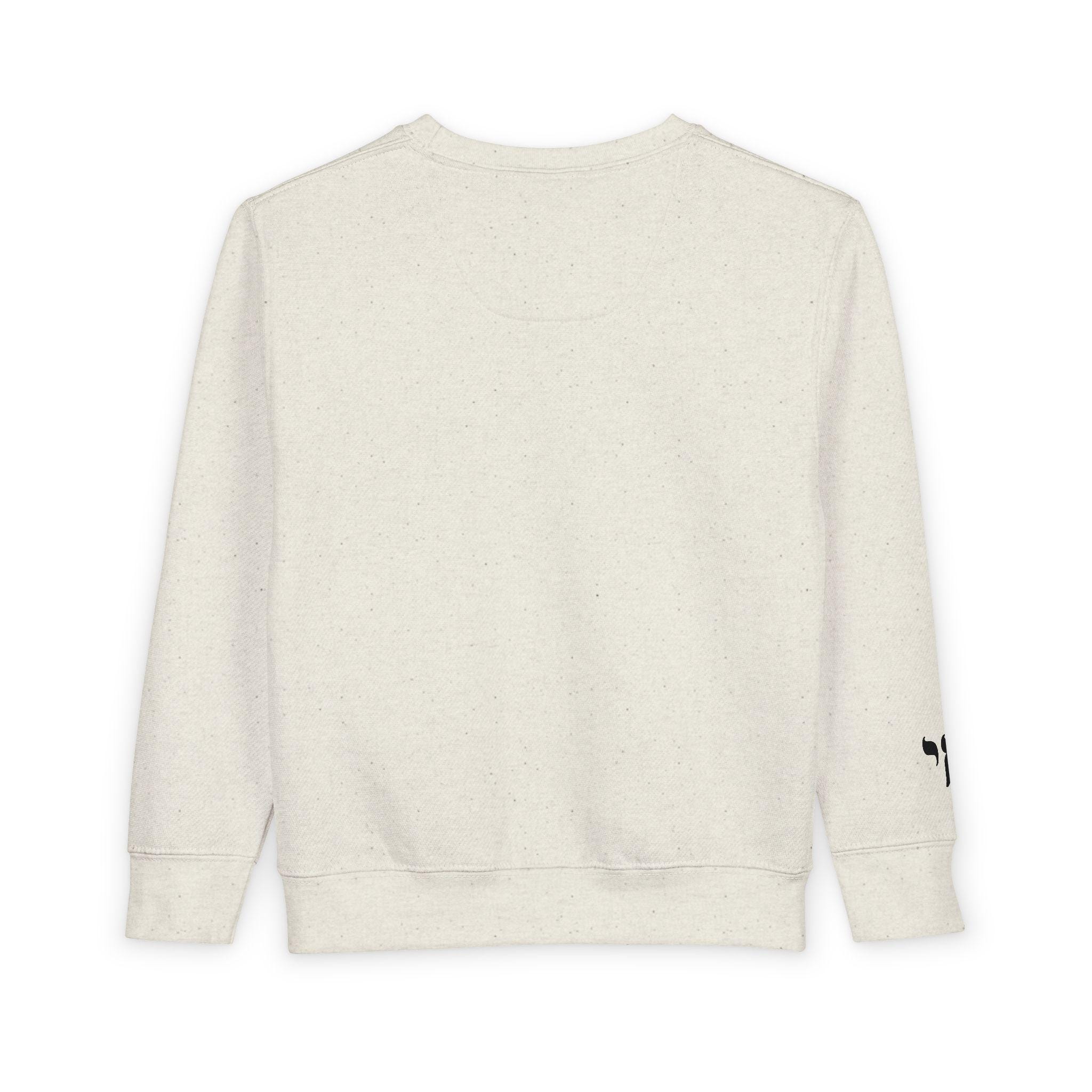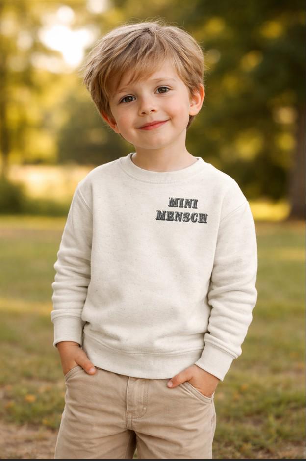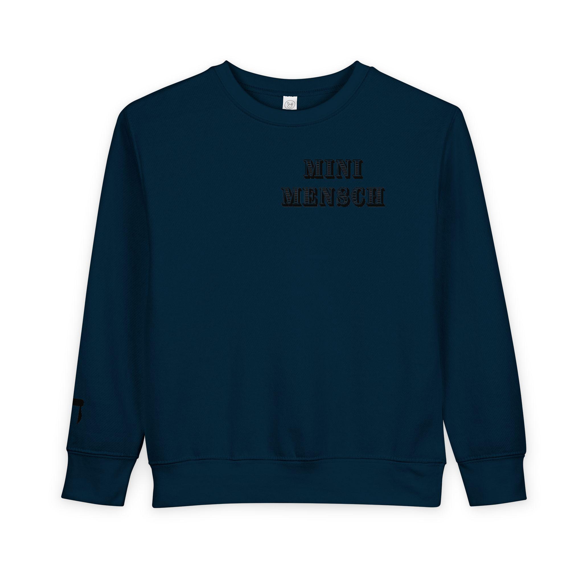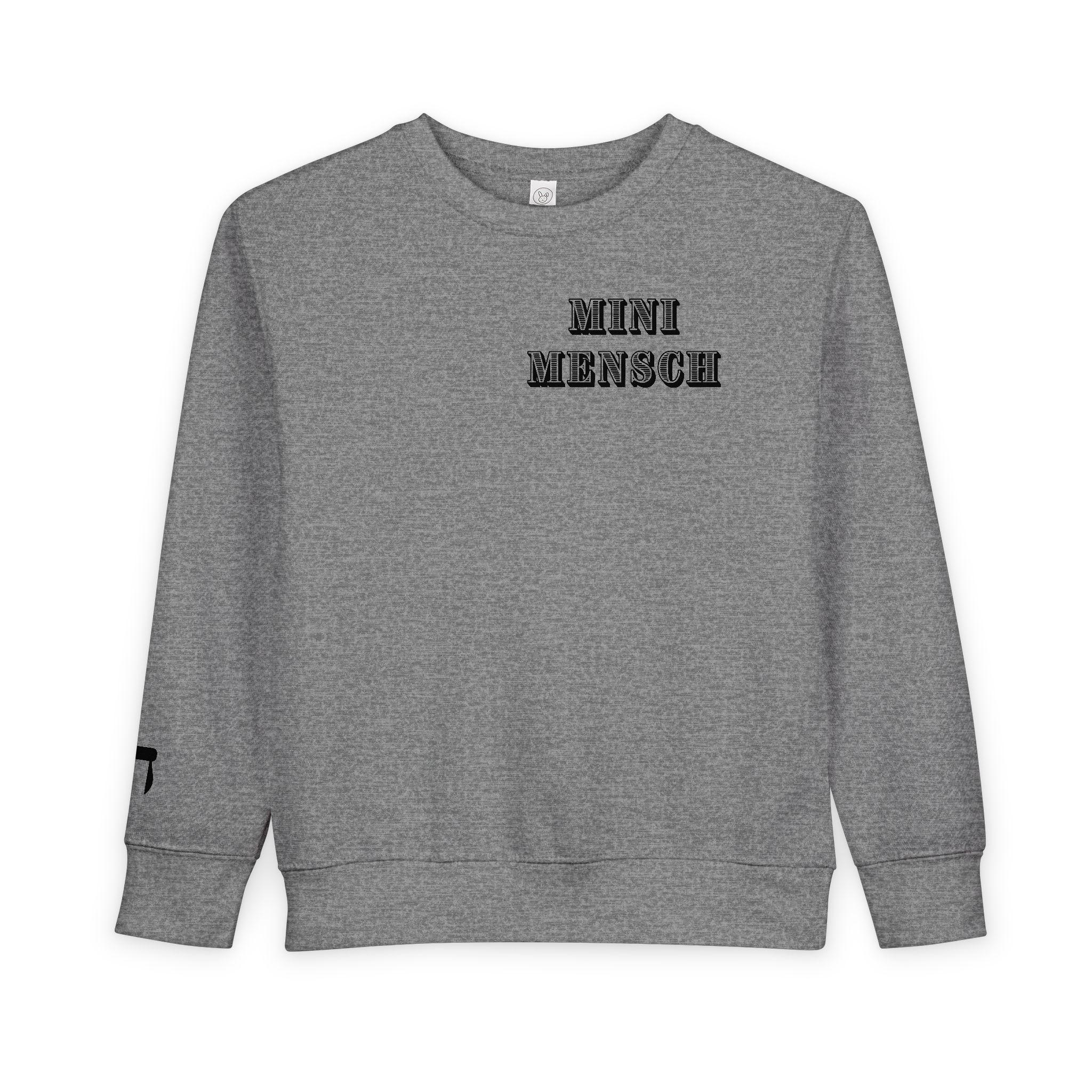 A cute toddler sweatshirt with 'mini Mensch' printed on the front and a 'chai' Hebrew symbol on the right arm sleeve. Perfect for young children to stay cozy and stylish, this sweatshirt is ideal for little ones celebrating Jewish holidays or for families who want to embrace their heritage.