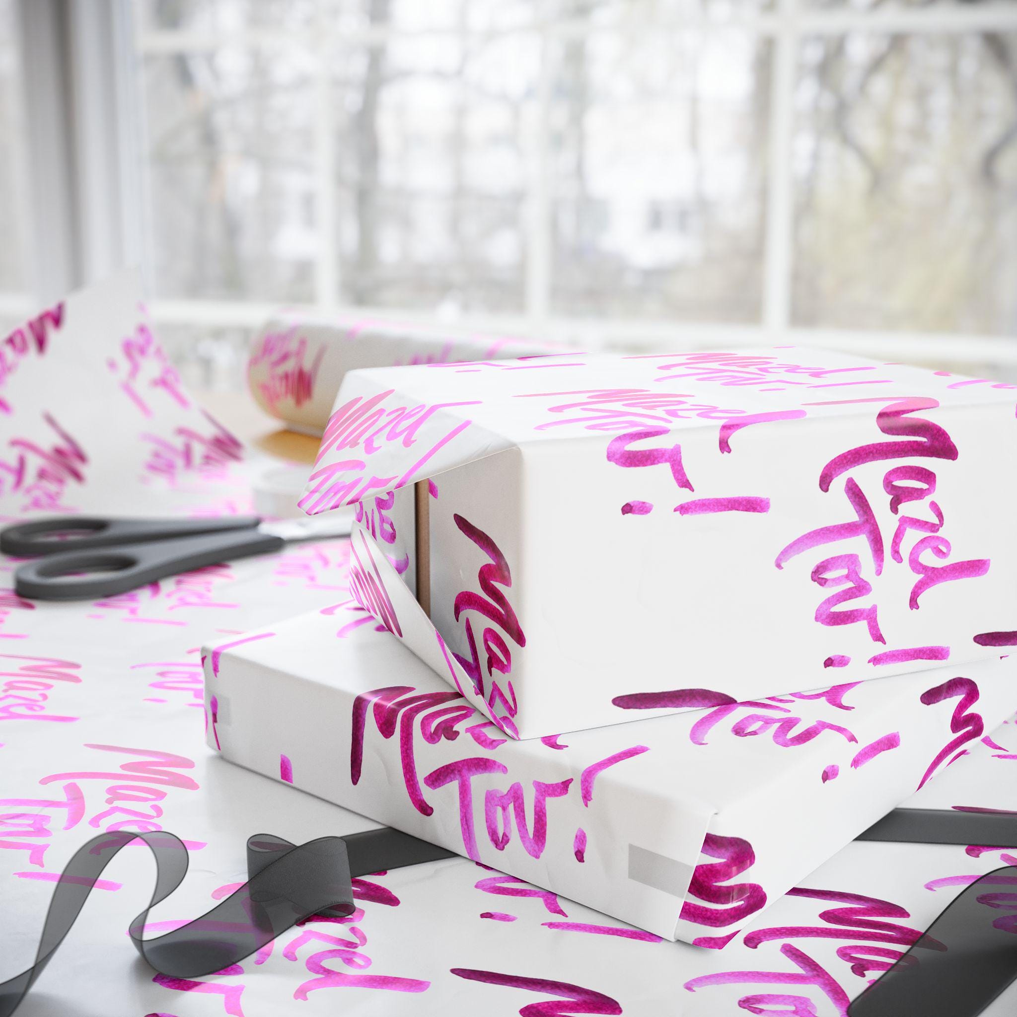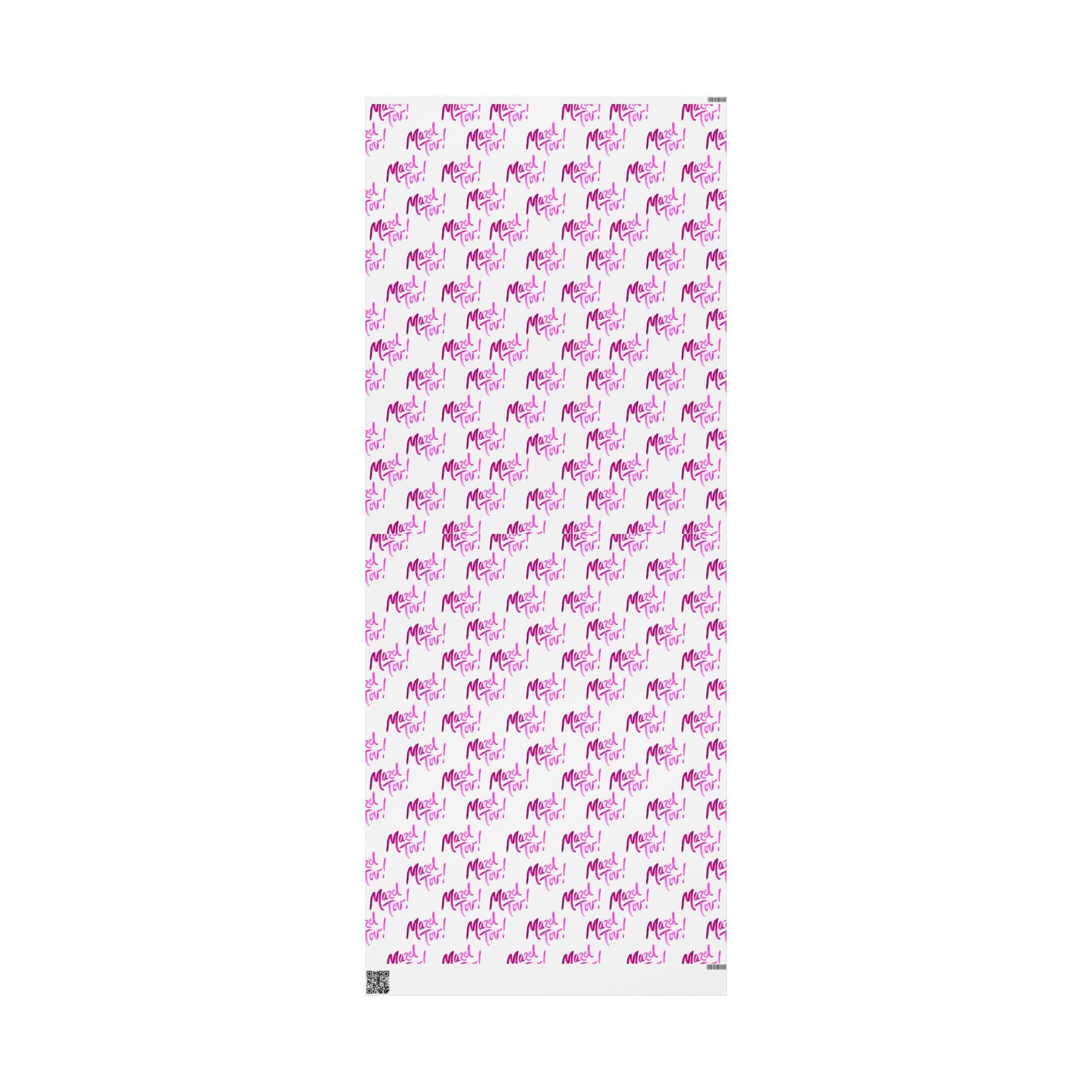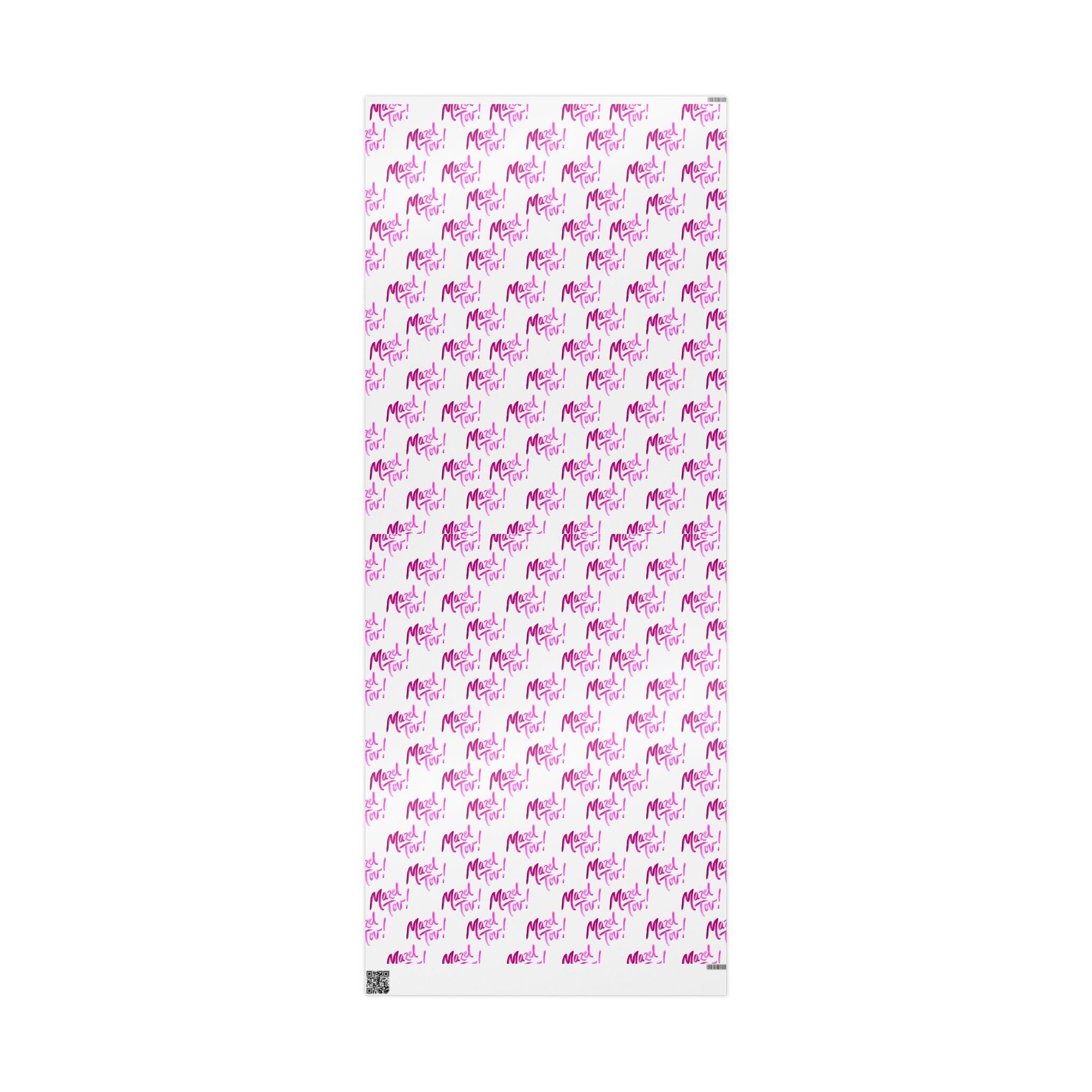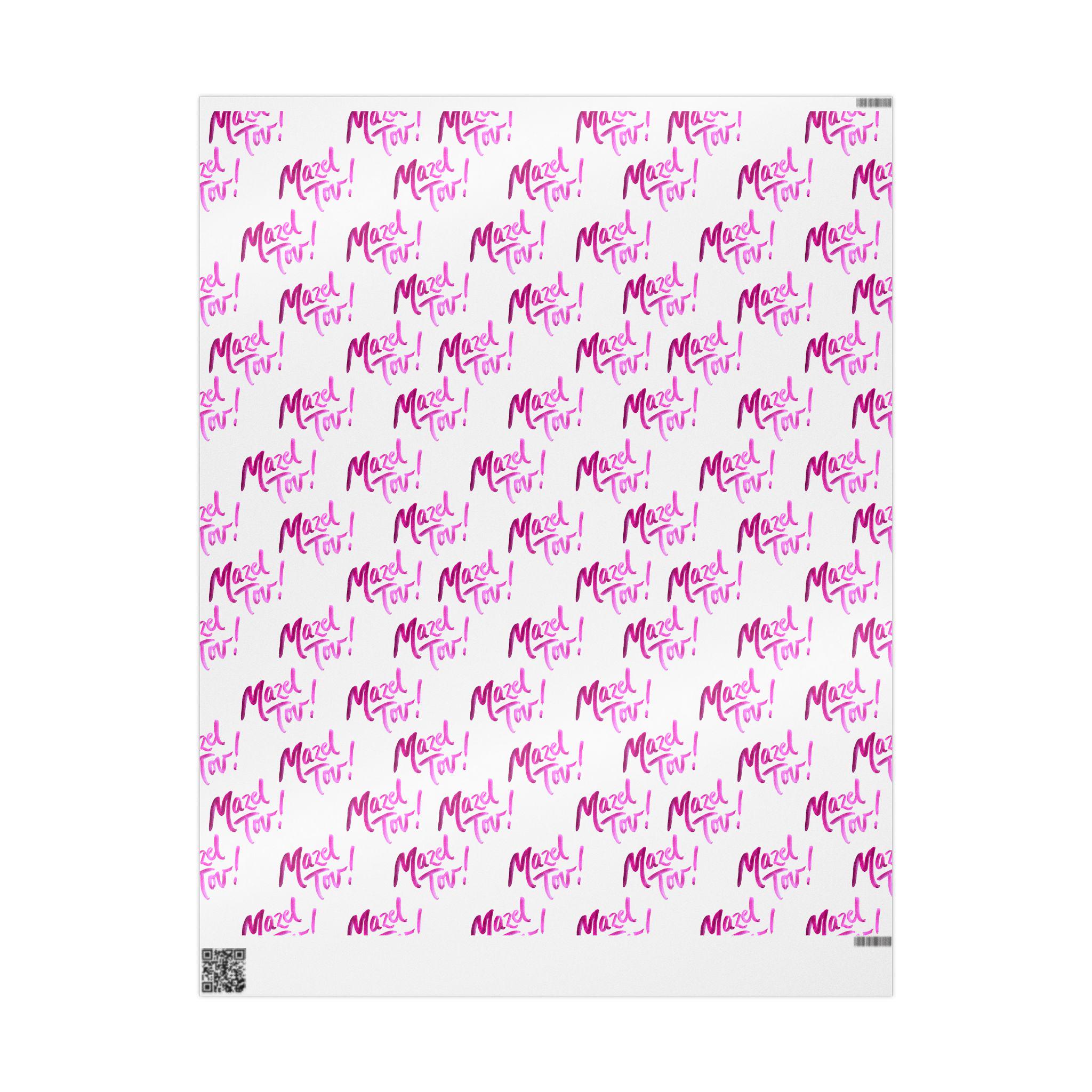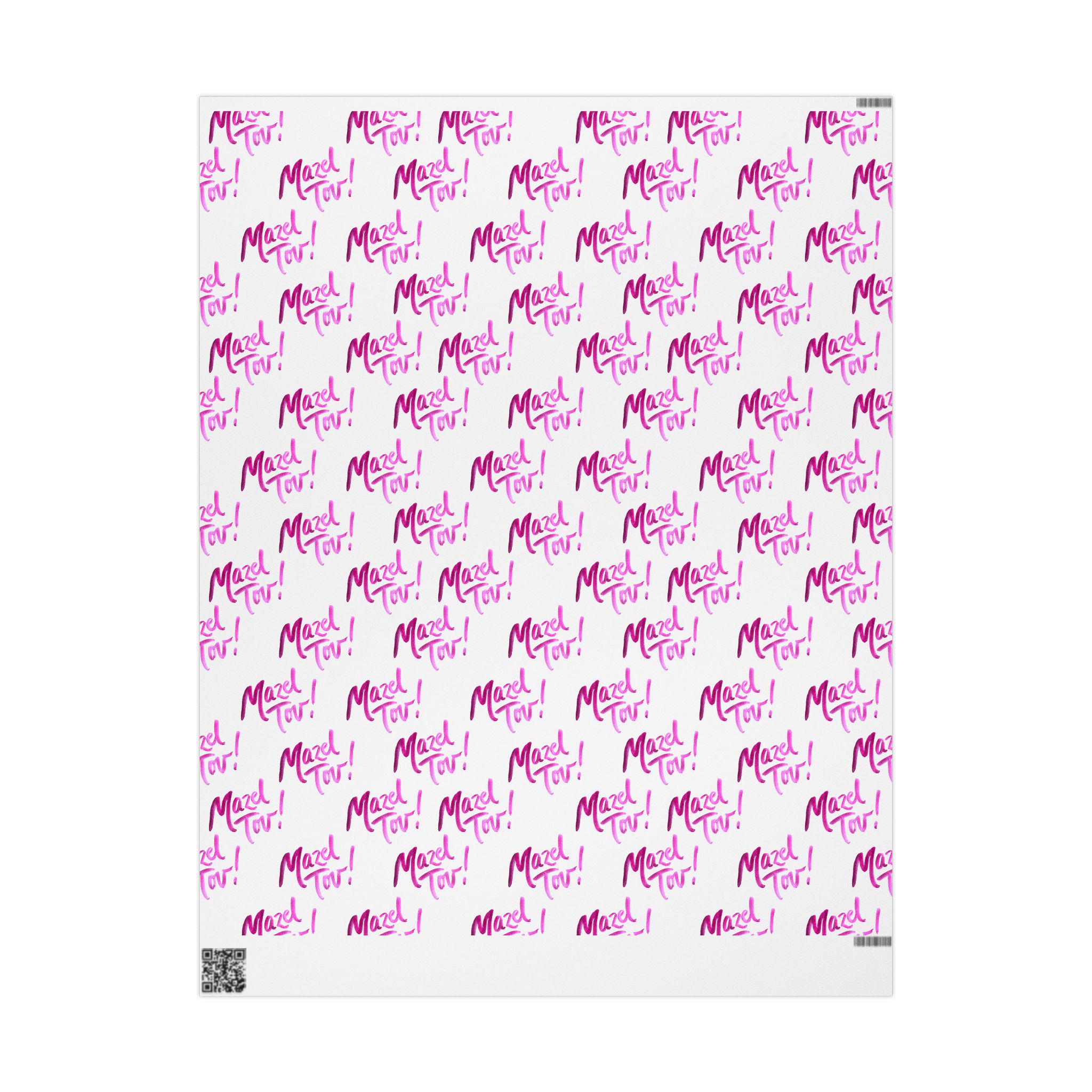 White and pink Mazel Tov Jewish wrapping paper designed for baby girl namings, Bat Mitzvahs, weddings, and joyful simchas. This elegant Jewish gift wrap adds a soft, celebratory touch to every meaningful present.