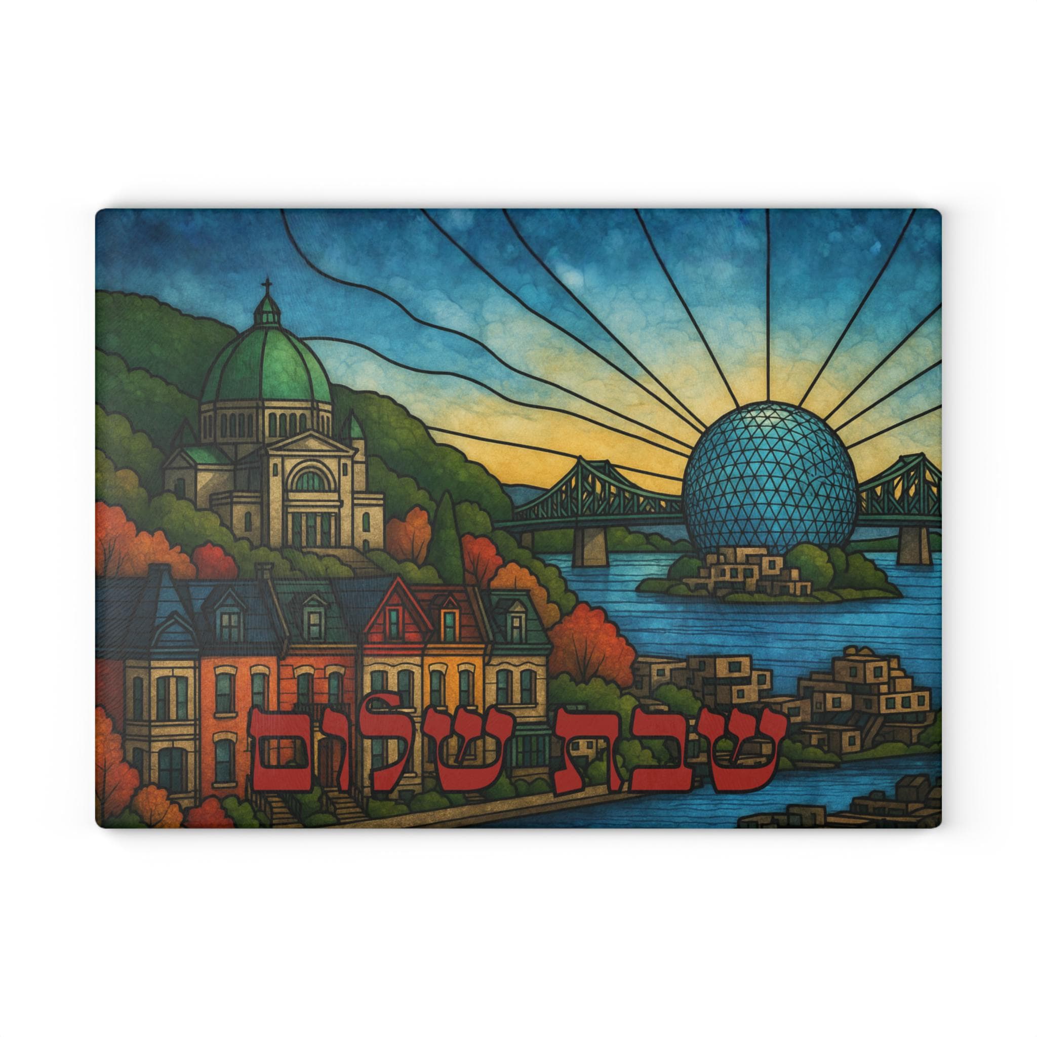 Celebrate Jewish life and Montreal pride with this stained glass–style challah board featuring a detailed cityscape inspired by the iconic Montreal skyline. Designed to blend meaningful Judaica with modern urban character, this 15×11 tempered glass Shabbat tray makes a striking centerpiece for any Jewish home.