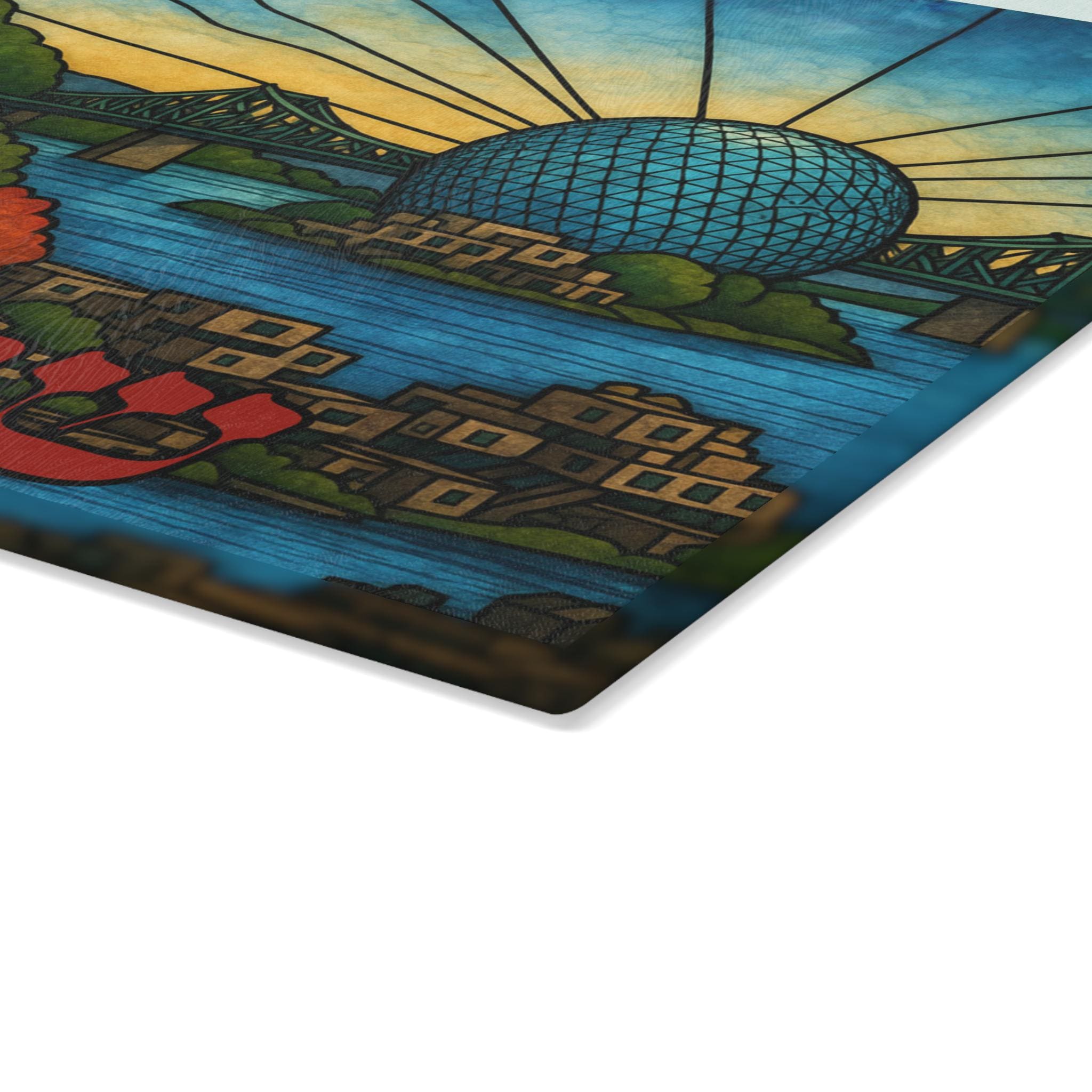 This glass challah board functions as both a cutting board and serving tray. The vibrant Montreal skyline artwork is permanently printed using a specialized decoration process that will not scratch during normal use, ensuring long-lasting color and beauty. The textured tempered glass surface is robust and ideal for slicing challah, preparing holiday treats, and serving at Shabbat dinners.