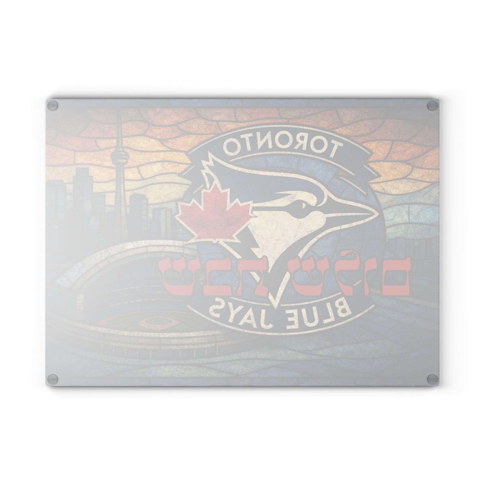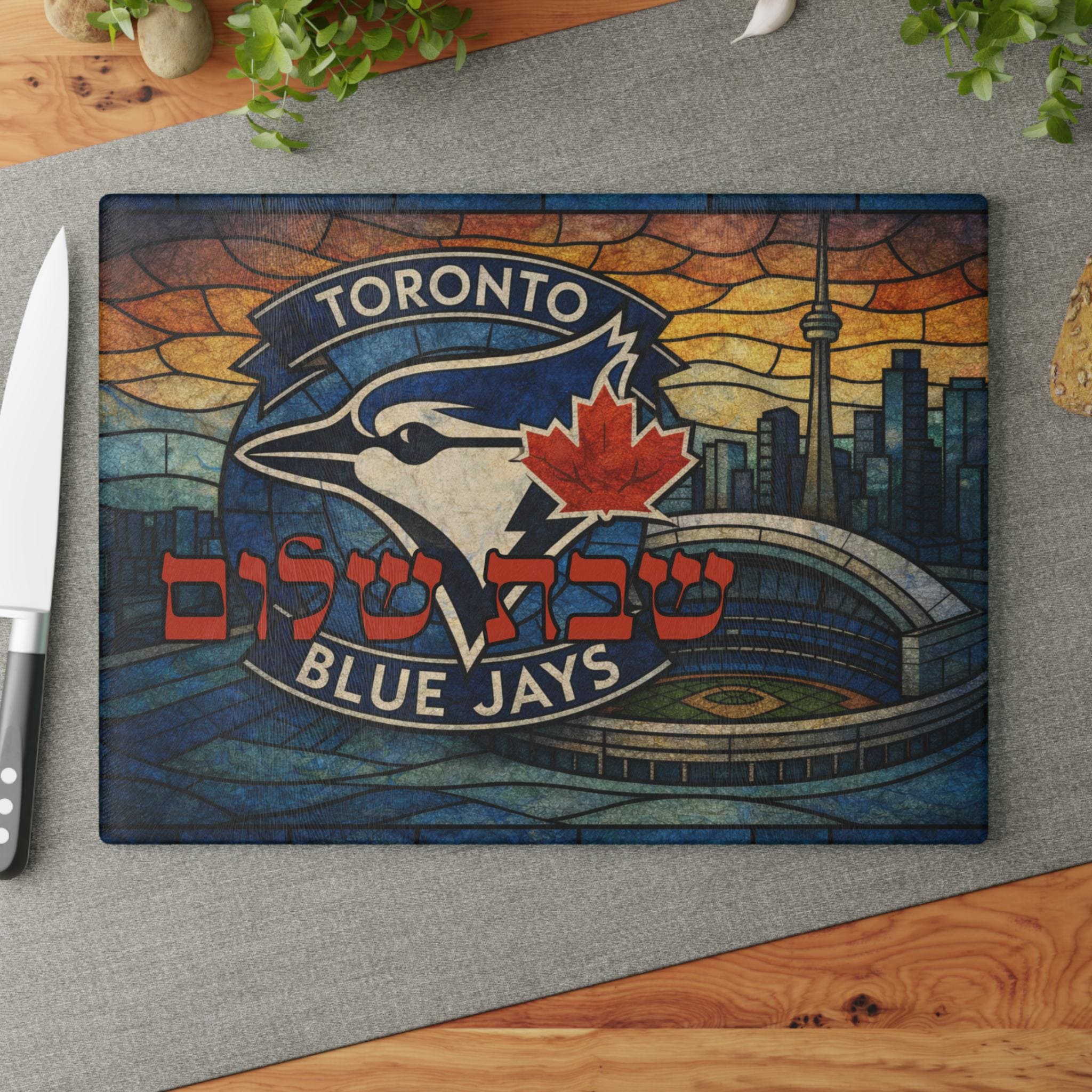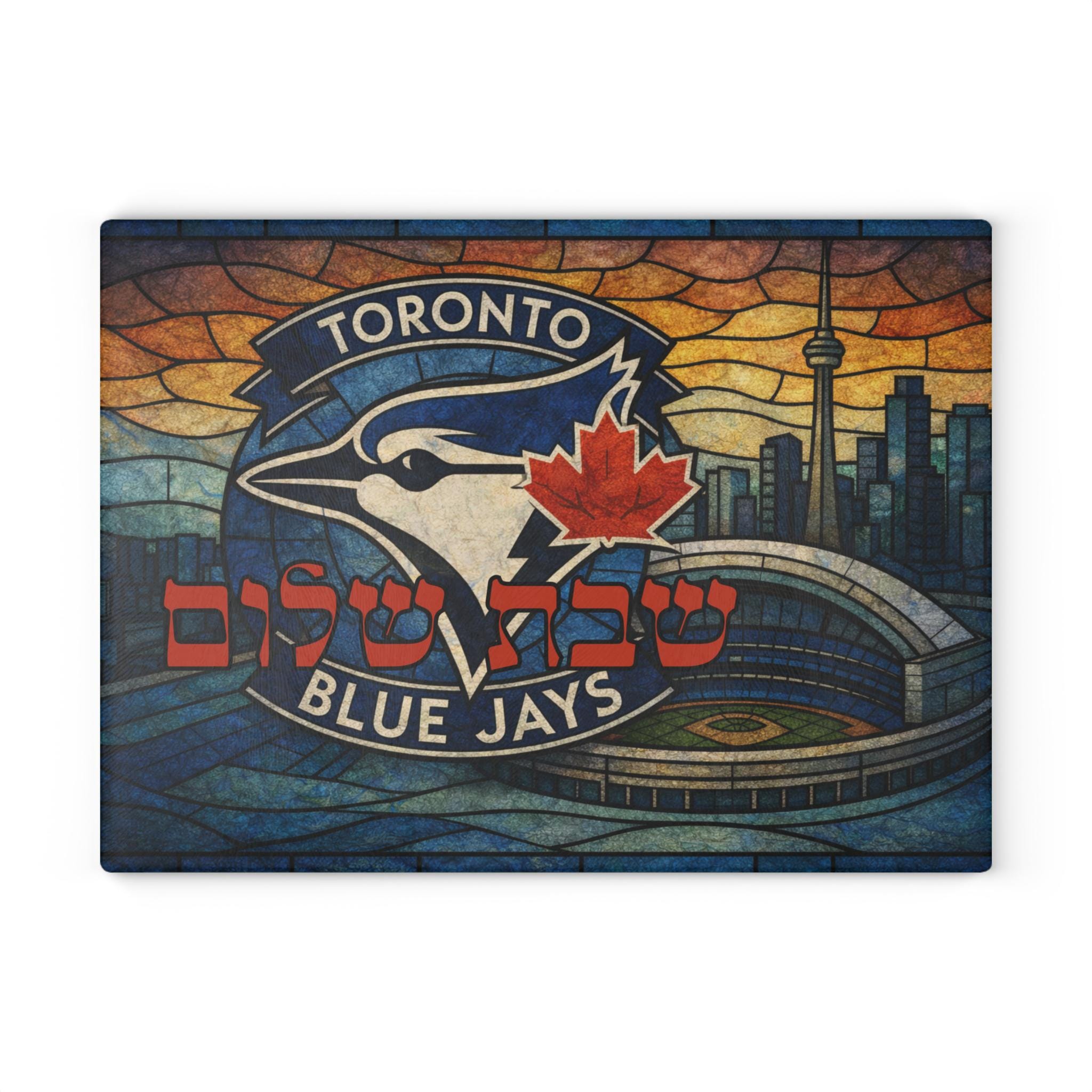 Celebrate Shabbat with Canadian baseball pride using this Toronto Blue Jays challah board, a bold blend of Jewish tradition and MLB fandom. Designed in a vibrant stained-glass style inspired by Toronto baseball, this 15×11 inch glass tray is perfect for fans who want meaningful Judaica that reflects their love of the game.