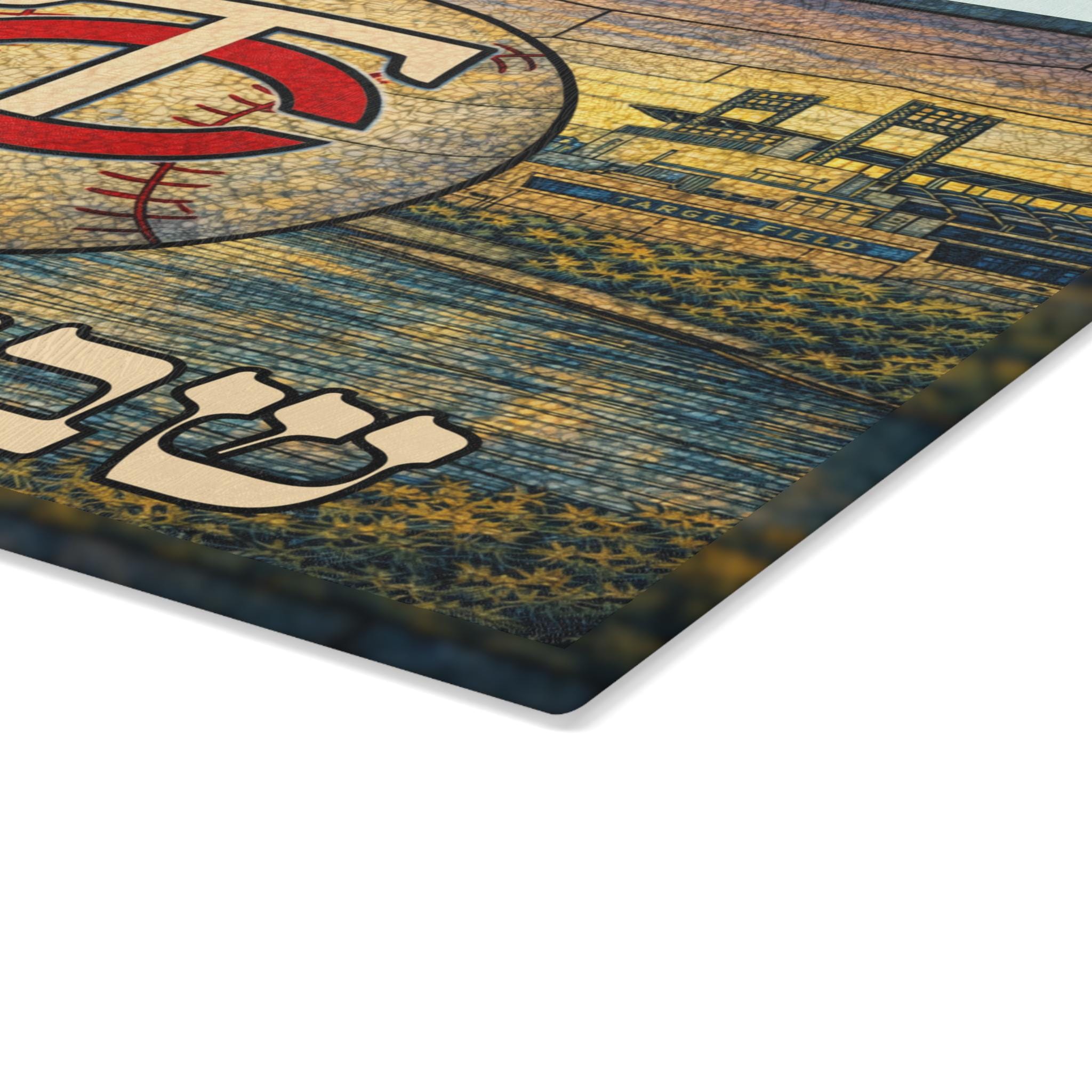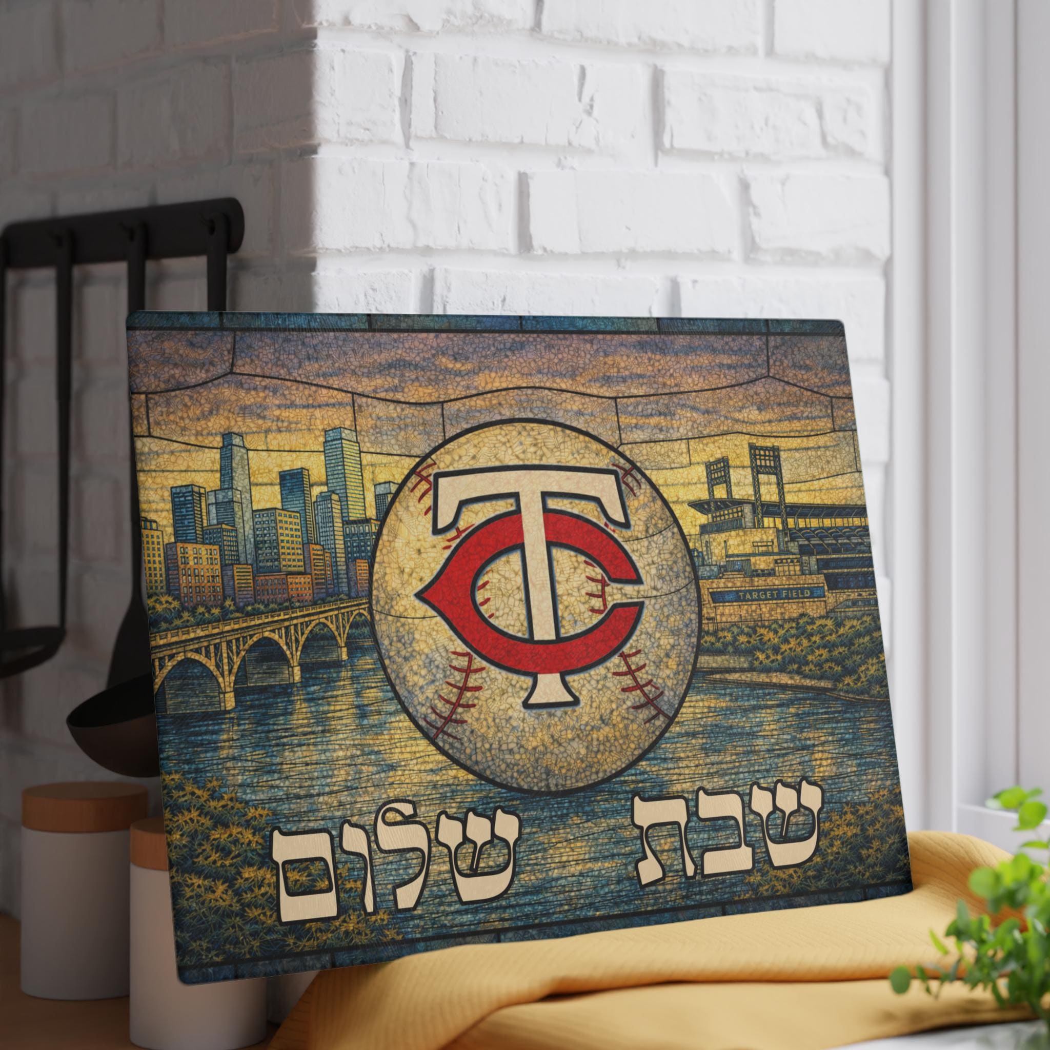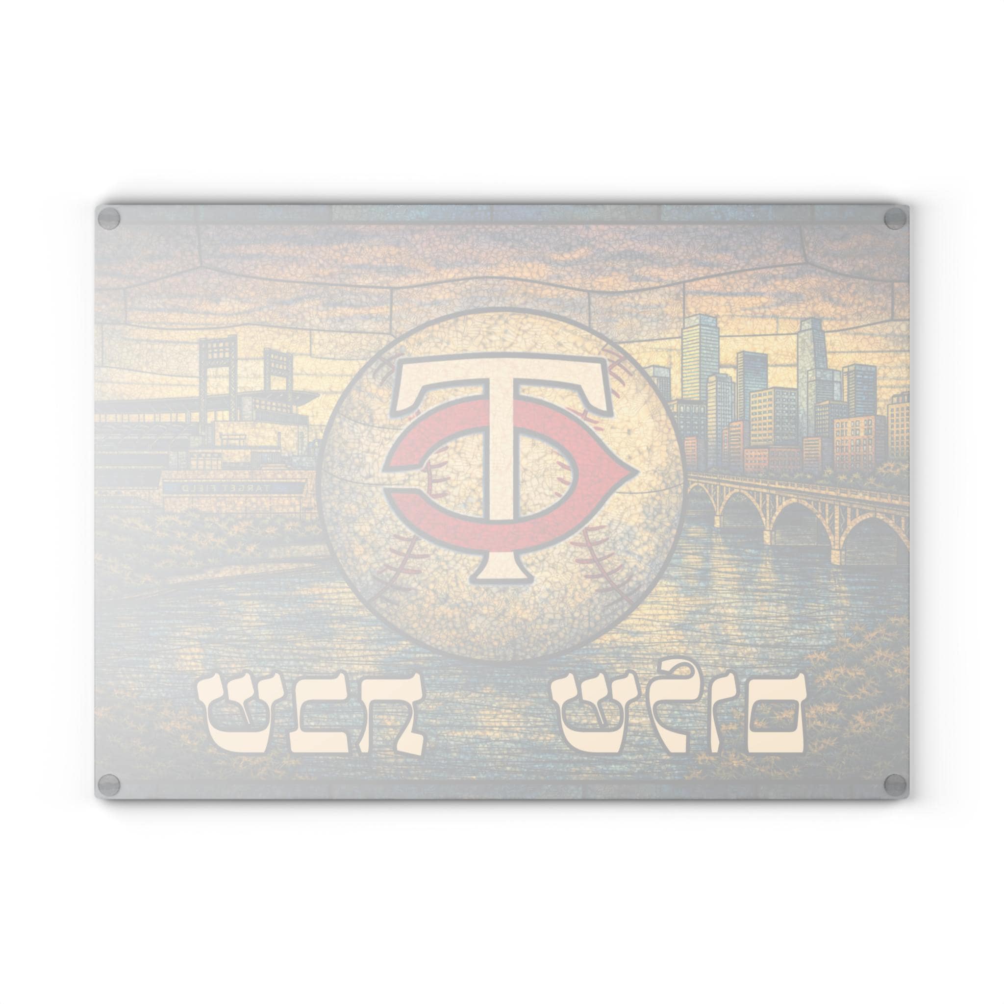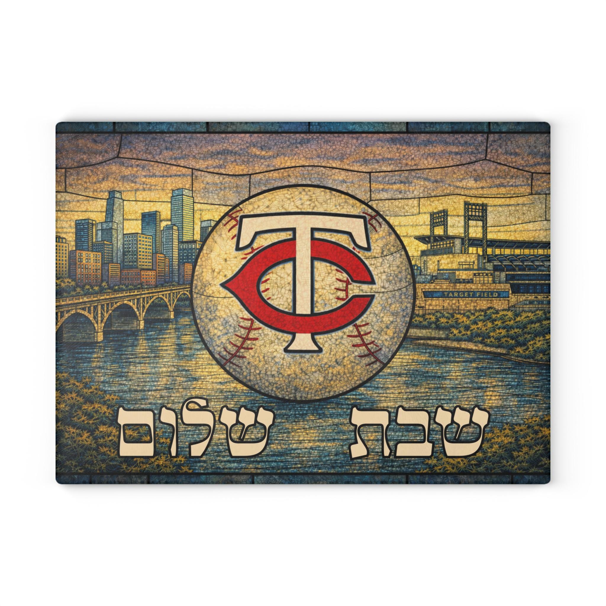 Bring Minnesota Twins pride to your Shabbat table with this stained glass–style challah board featuring the iconic TC logo, Target Field, the Stone Arch Bridge, the Mississippi River, and the Minneapolis skyline. Designed to capture the spirit of Twins baseball and Jewish tradition, this 15×11 inch glass tray makes a bold and meaningful centerpiece.