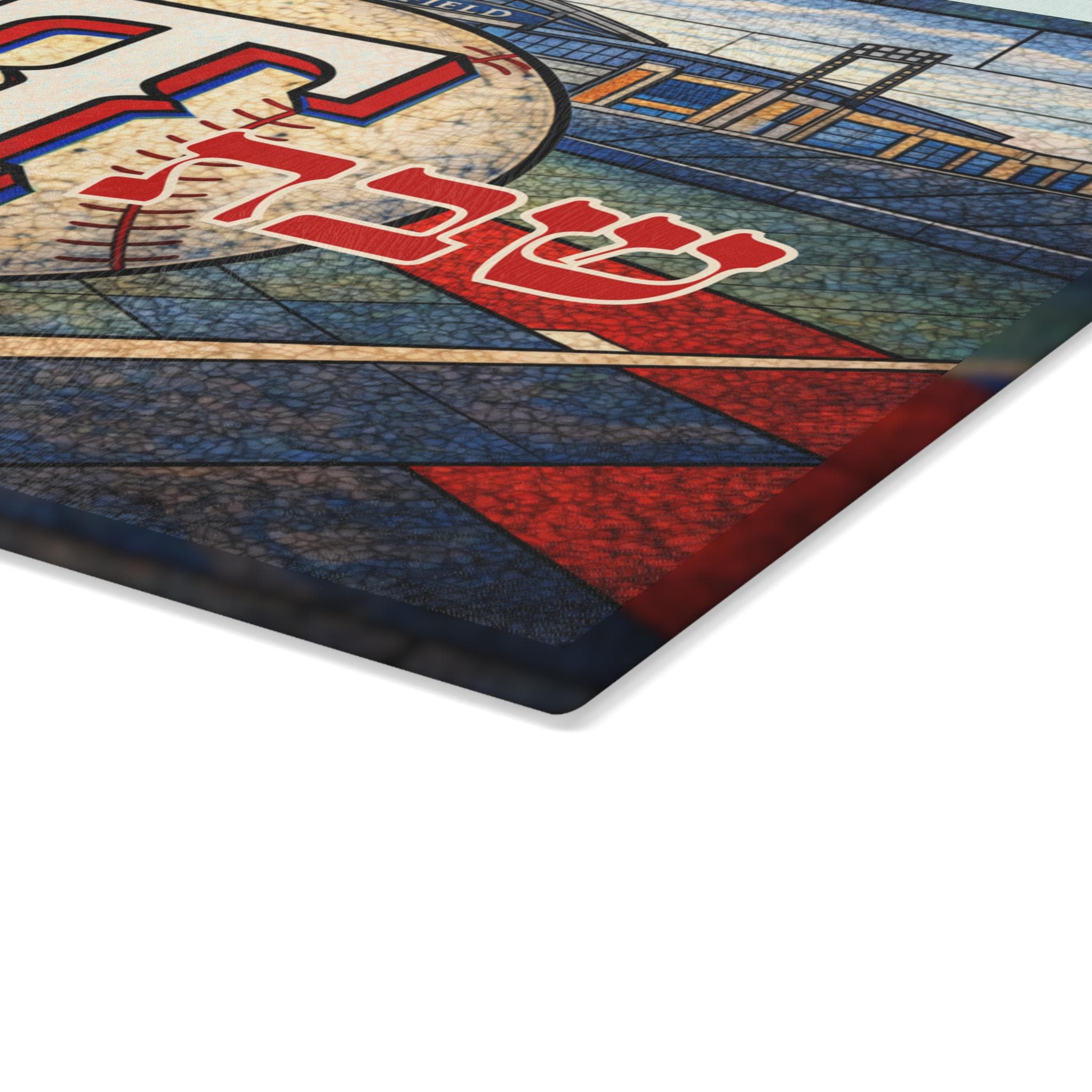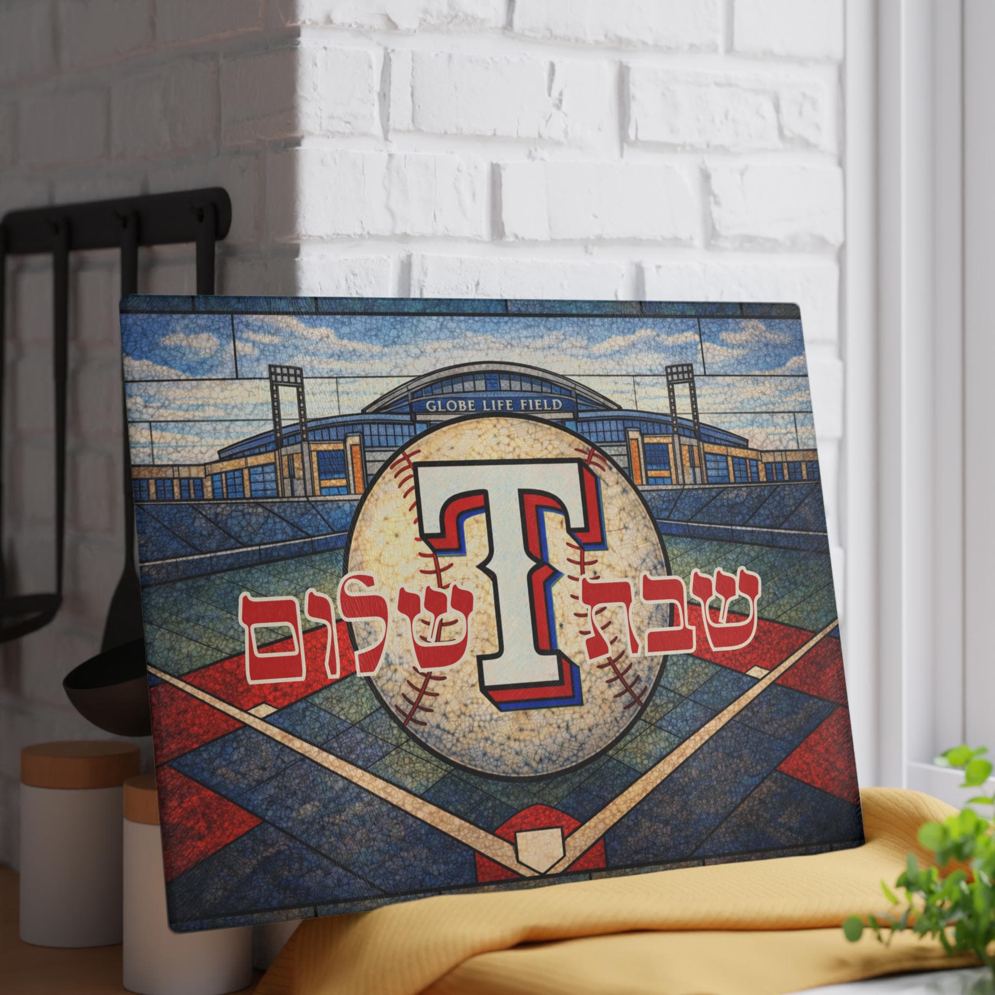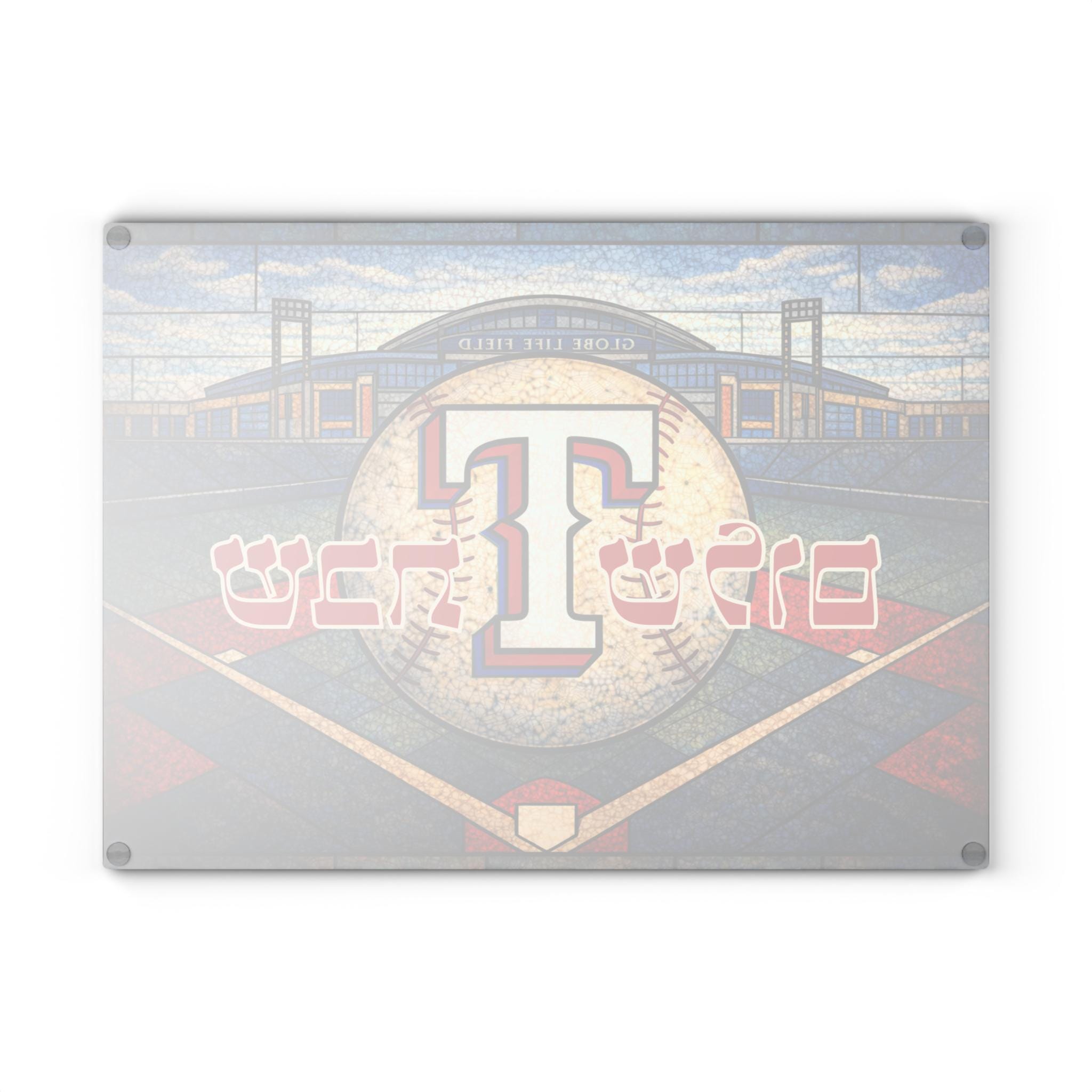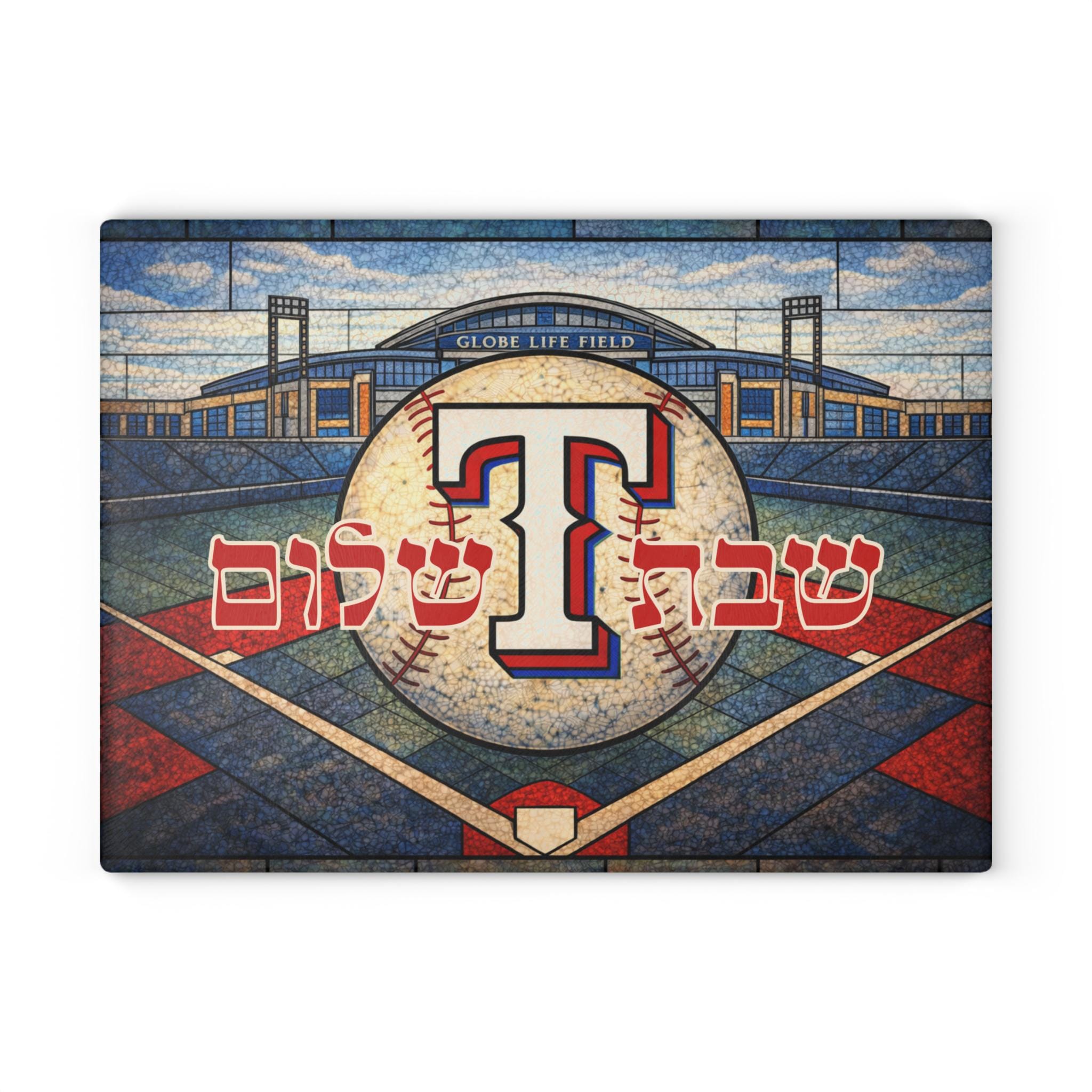 Bring Texas Rangers pride to your Shabbat table with this stained glass–style challah board featuring the iconic Rangers “T” logo, MLB baseball imagery, Globe Life Field, and bold baseball diamond geometry inspired by the heart of Texas baseball. Designed for devoted fans, this 15×11 inch Shabbat glass tray blends team loyalty with meaningful Jewish tradition.