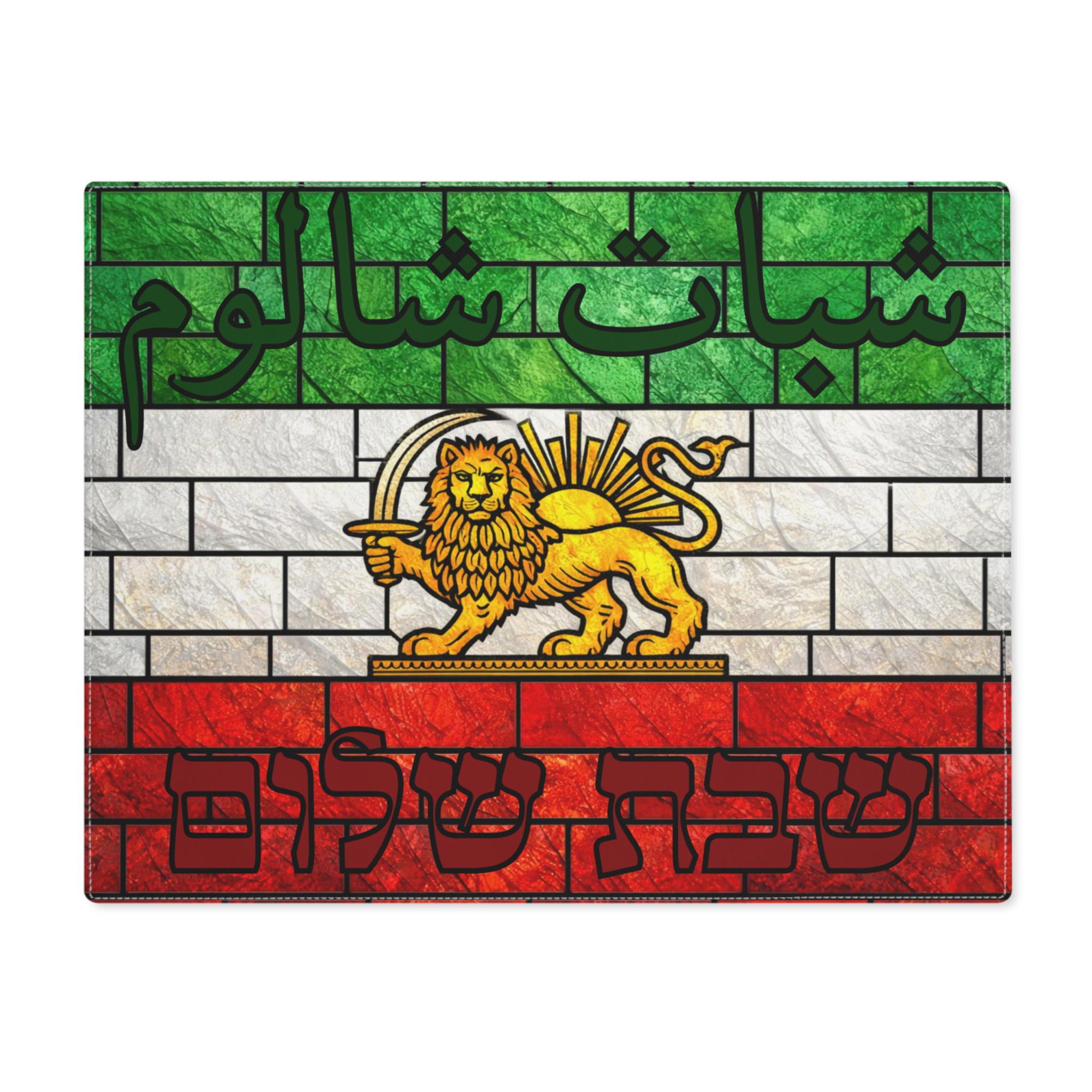 At the center is the historic Lion and Sun motif, long associated with Persian identity, strength, and continuity. Paired with Hebrew “שבת שלום (Shabbat Shalom)” and complementary Farsi text, the design speaks to layered identity—Jewish, Persian, and enduring. Rendered in a stained-glass–inspired style, the imagery feels elevated, reverent, and timeless rather than political or modernized.