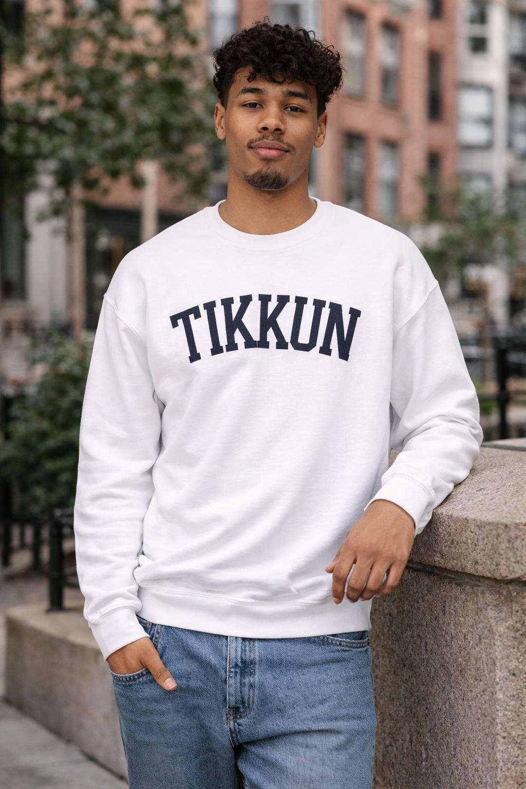 Tikkun sweatshirt — a white crewneck pullover designed for quiet intention and everyday meaning.
