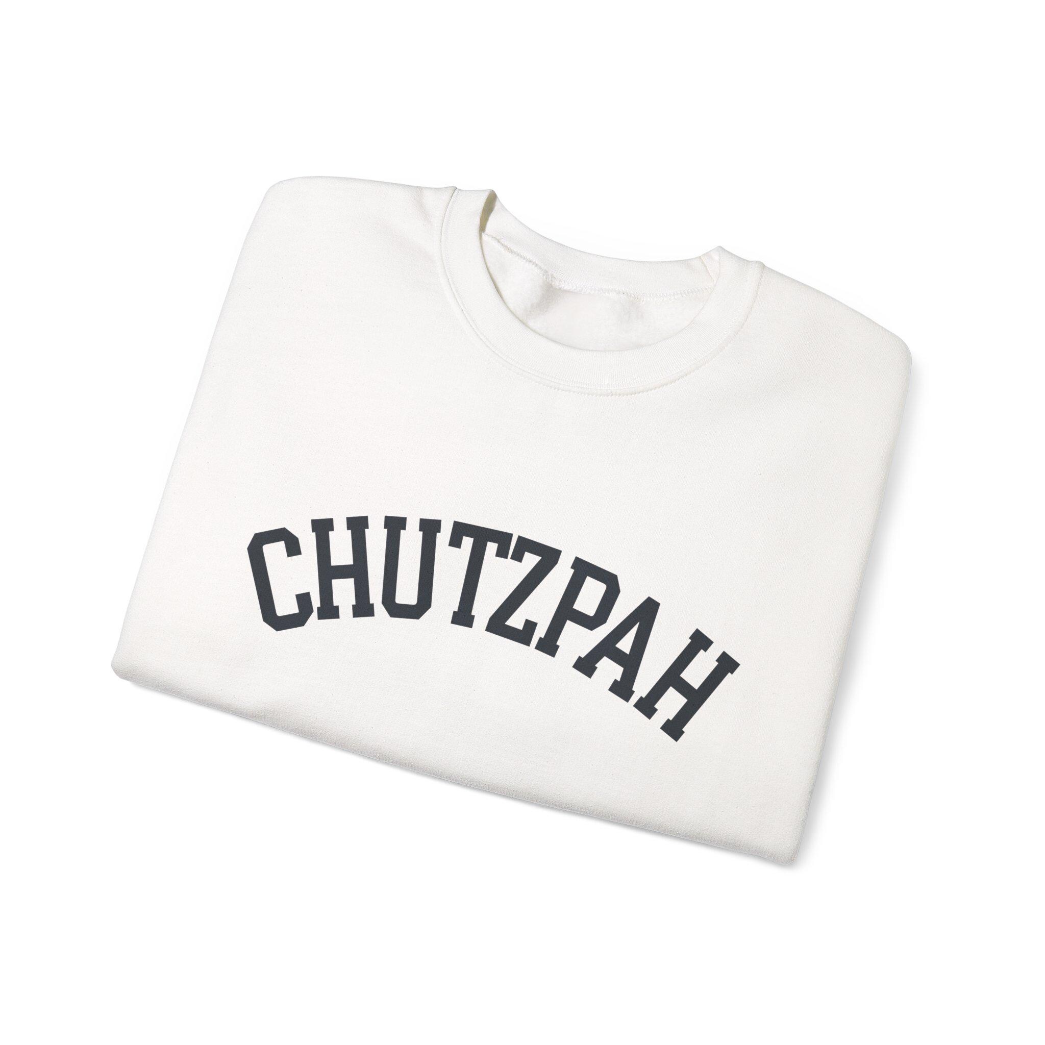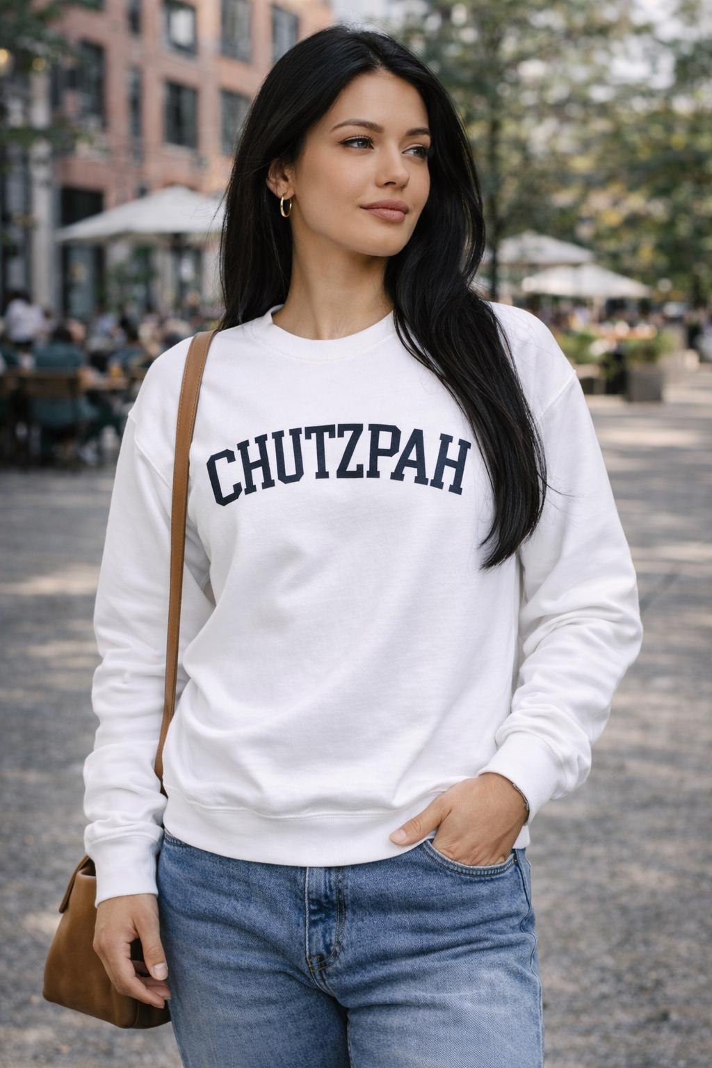 Chutzpah sweatshirt — a white collegiate-style crewneck that blends bold personality with everyday comfort.