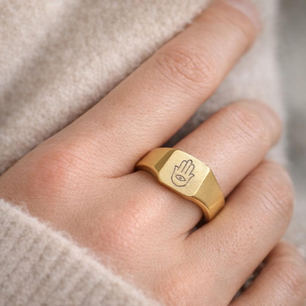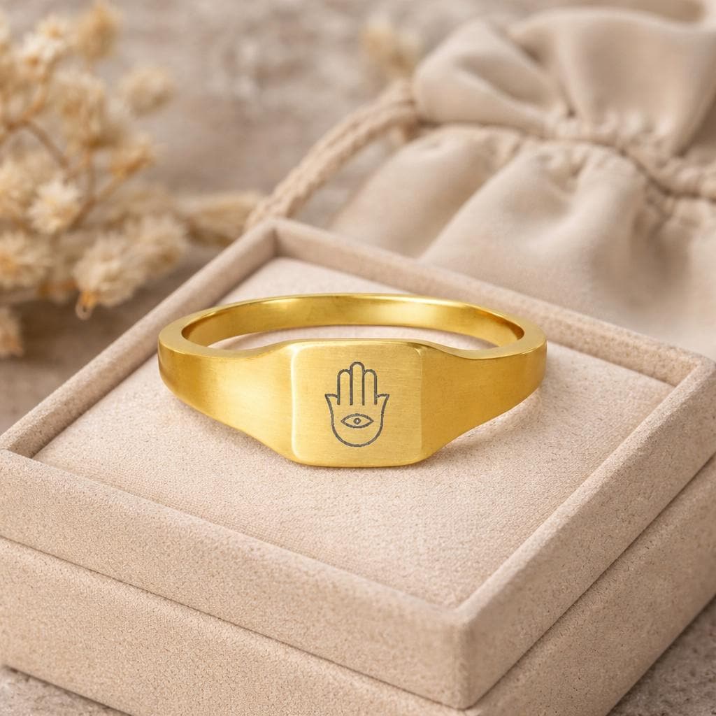A timeless Jewish protection ring that blends symbolism, strength, and minimalist design. Add this Hamsa signet ring to your cart and wear your meaning every day.