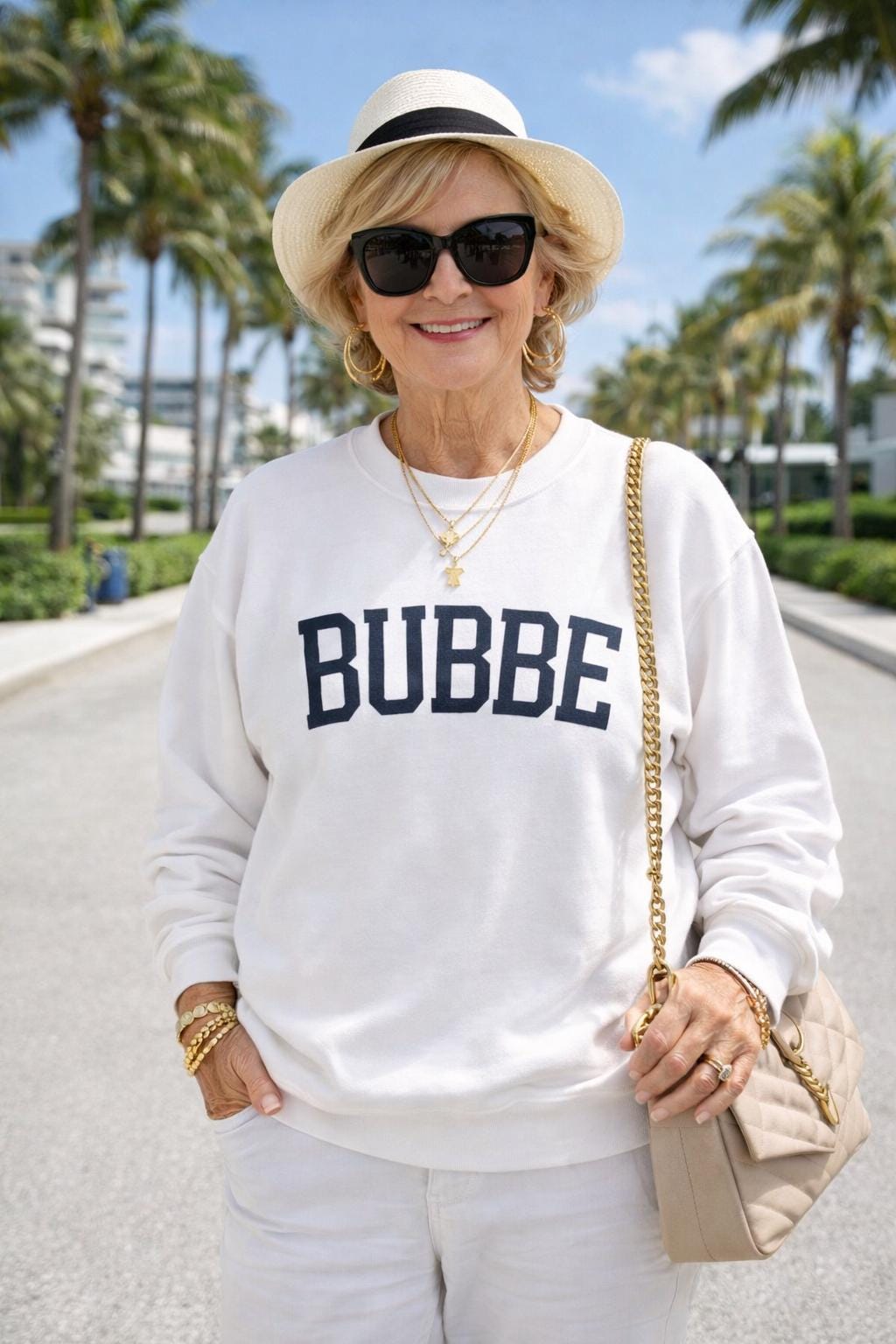 Soft, roomy, and quietly proud, this embroidered sweatshirt features a clean collegiate-style arch that reads BUBBE across the chest. The neutral cream base and deep stitched lettering create a classic look that feels nostalgic yet modern — easy to pair with jeans, leggings, or layered under a jacket.