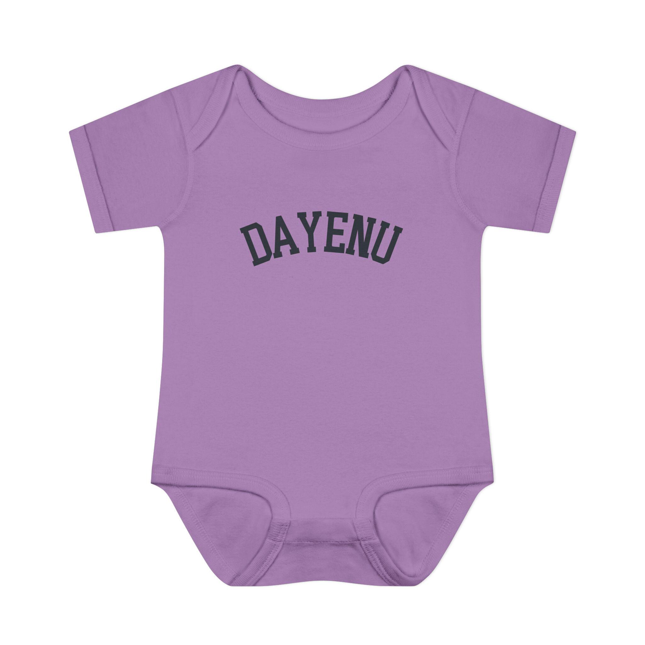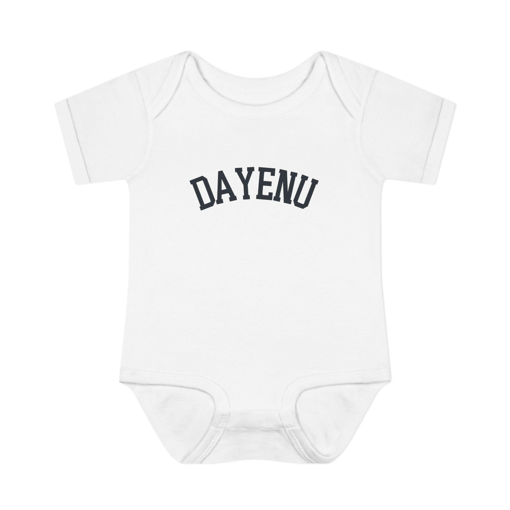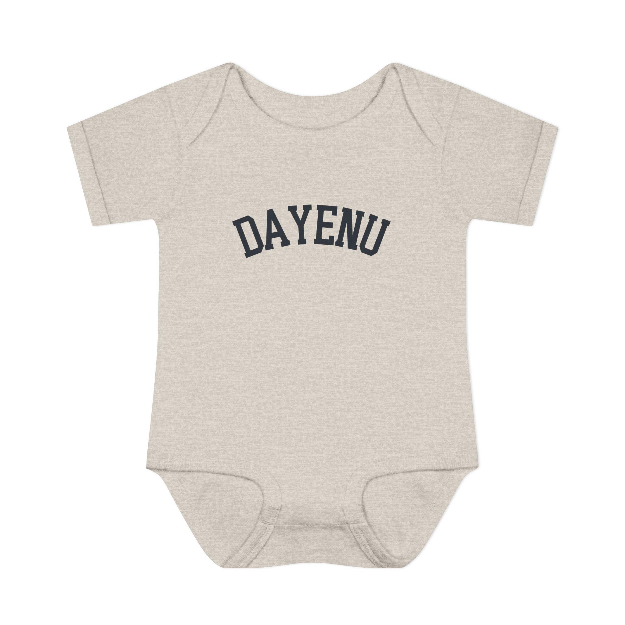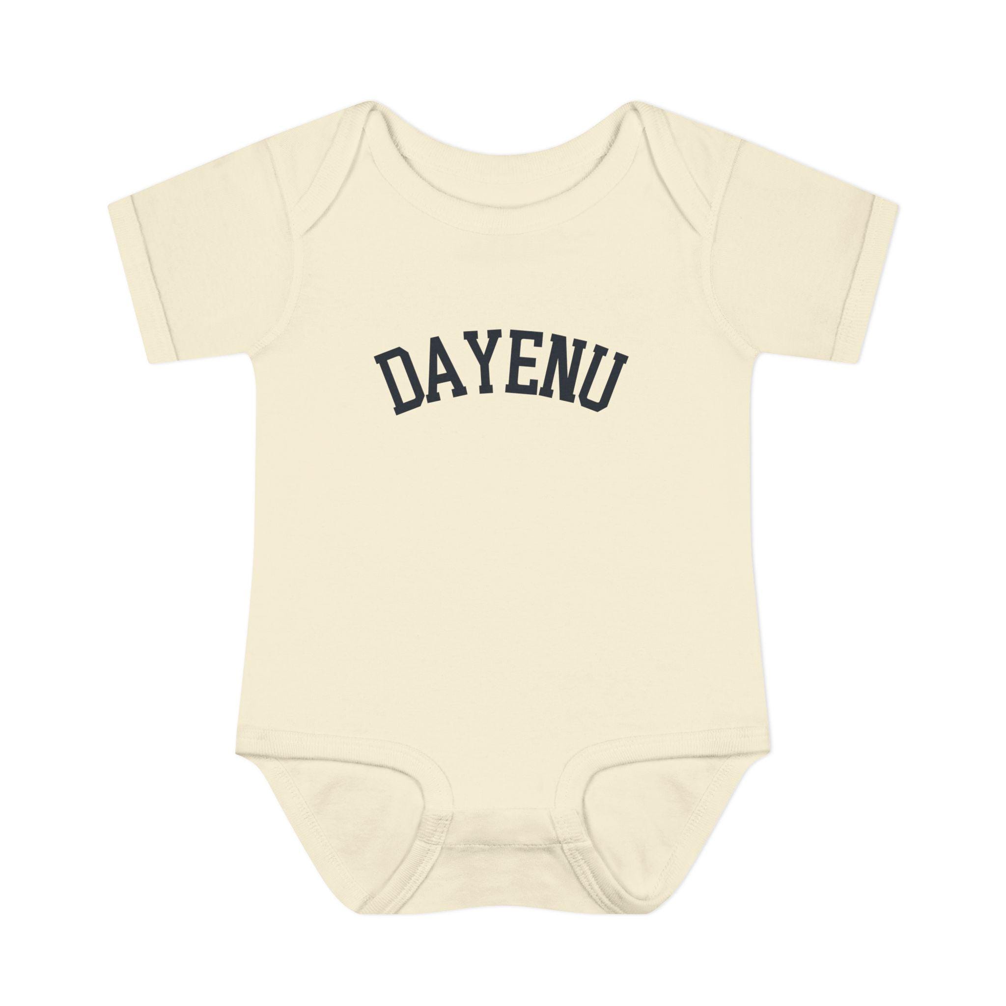 Celebrate Passover with a modern, minimal baby look. This soft Dayenu infant bodysuit features a clean arched wordmark design that feels timeless, understated, and meaningful — perfect for Seder night, holiday photos, or gifting a Jewish newborn during Pesach.