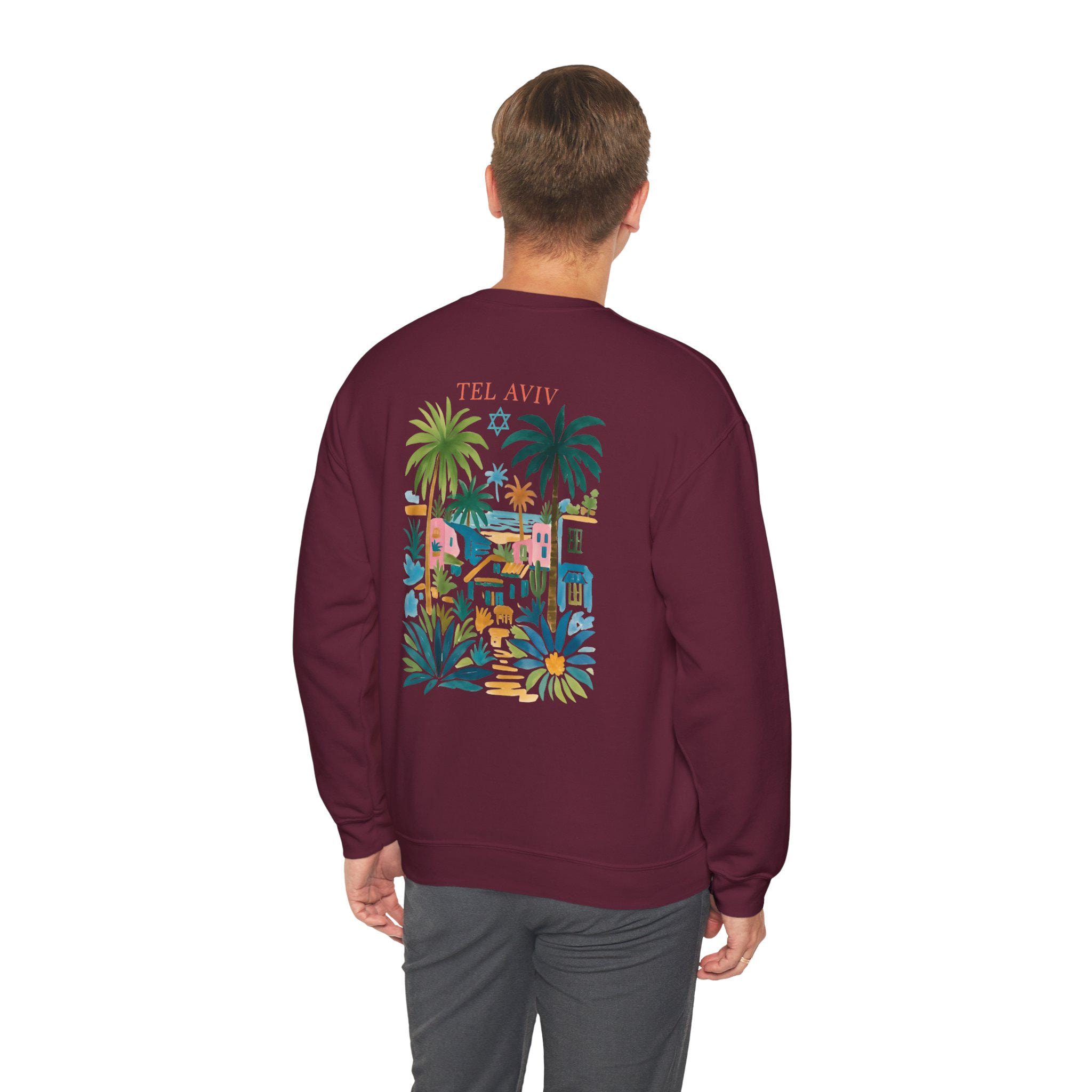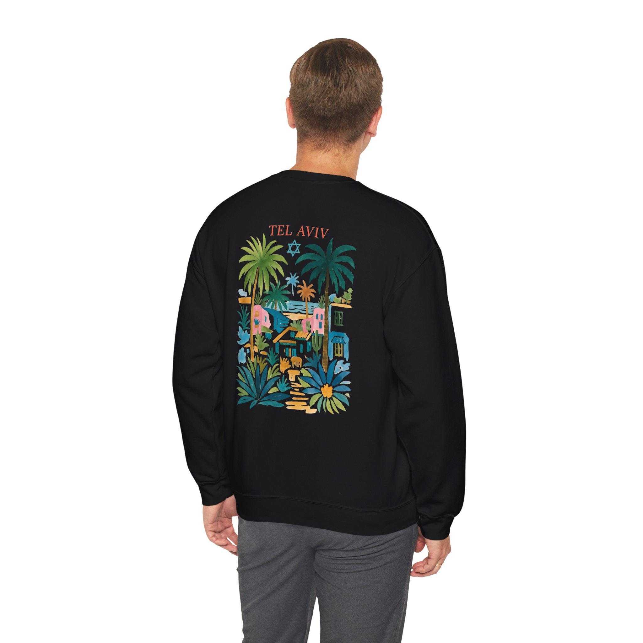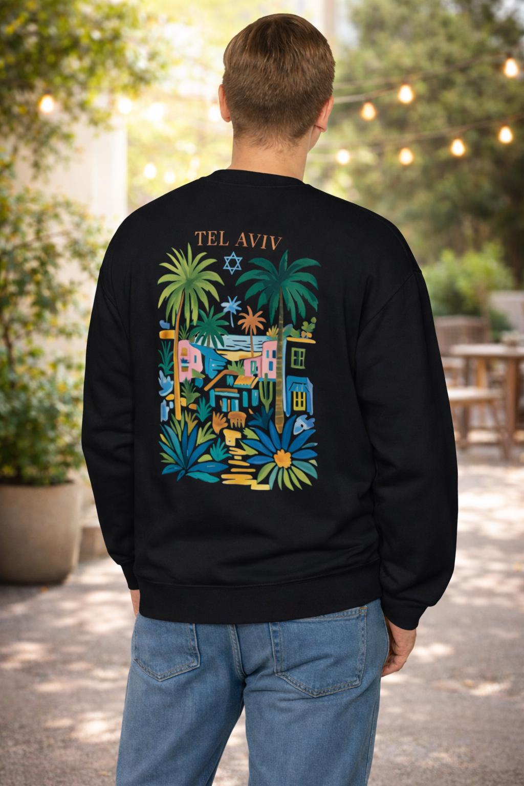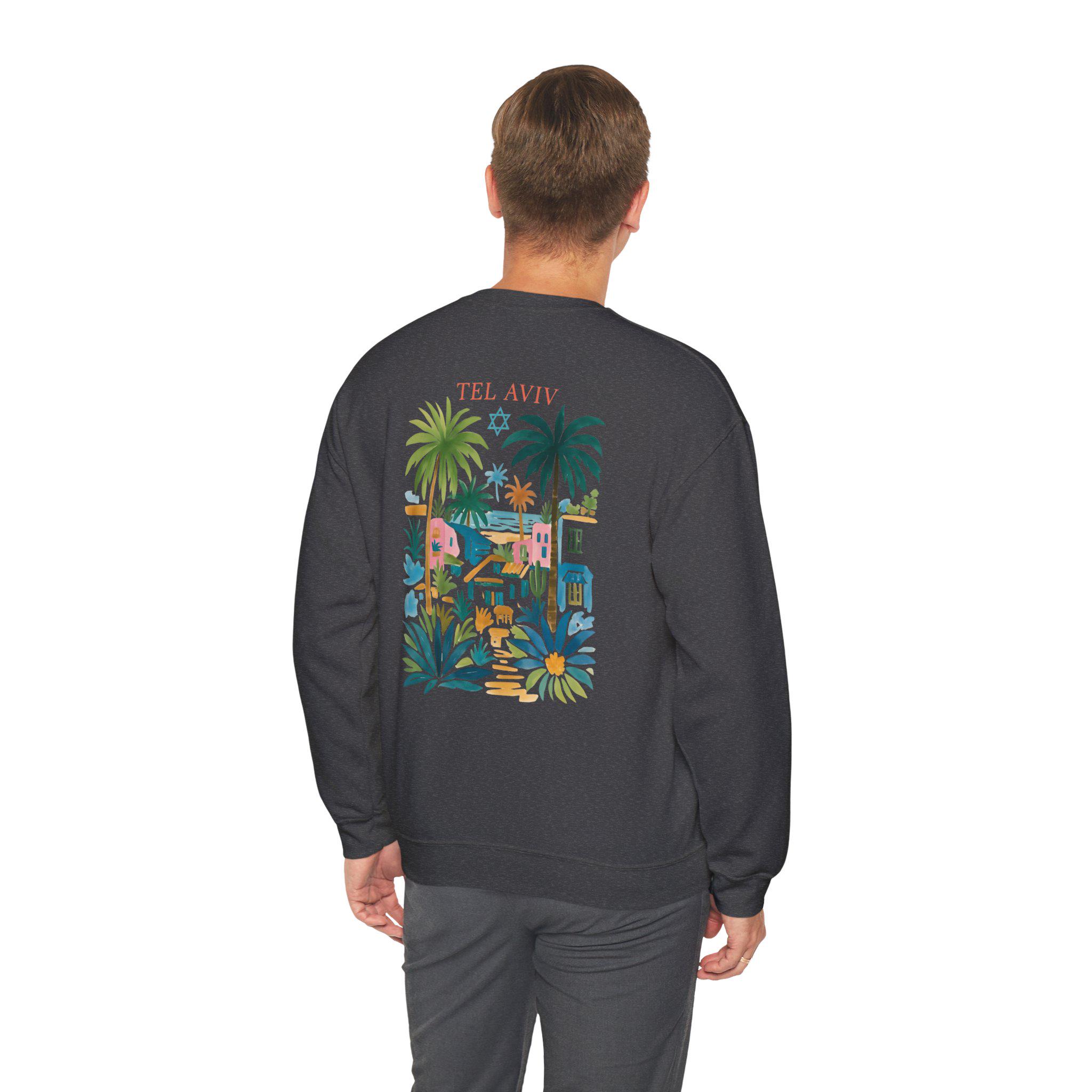 Tel Aviv Tikkun Olam sweatshirt — a Hebrew crewneck designed to carry purpose with everyday comfort. This Israel-inspired design blends bold Jewish values with vibrant Tel Aviv beach artwork, creating a meaningful piece you can wear anywhere.